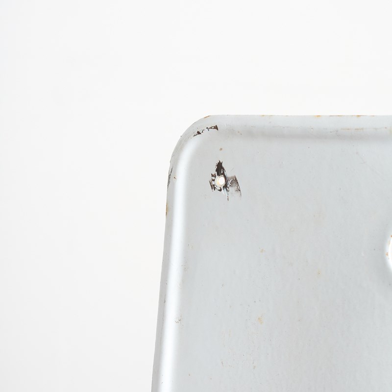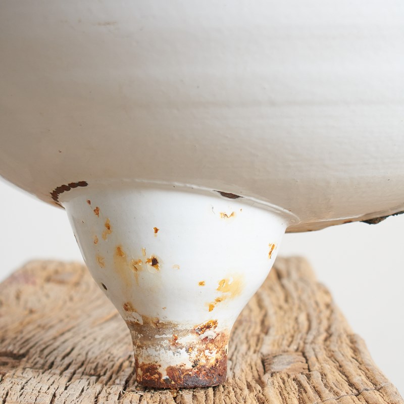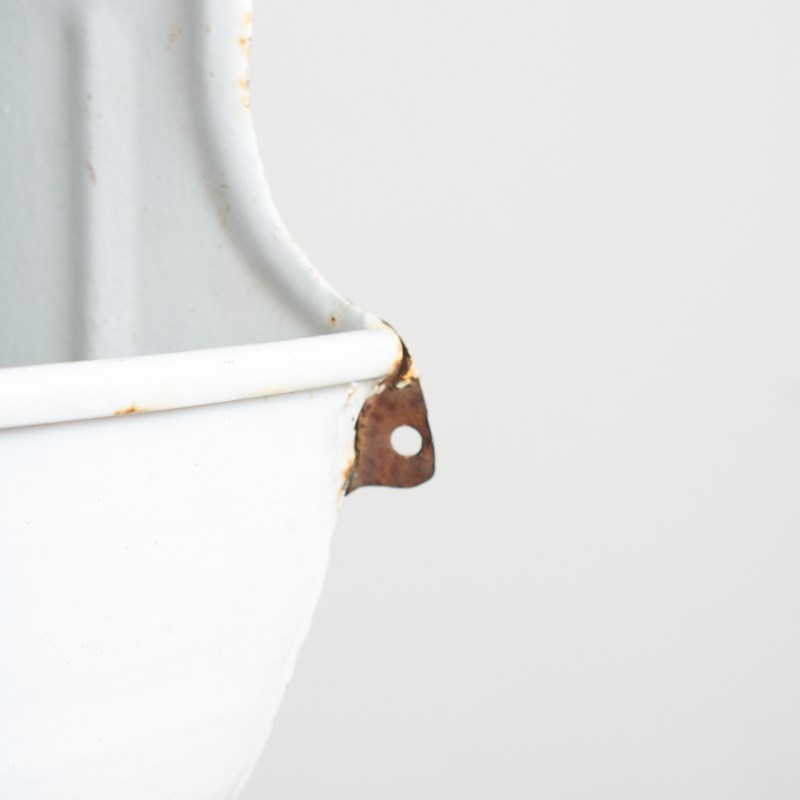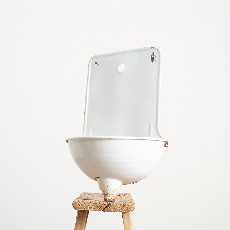 A fantastic old enamel wall sink. These were originally hung on the walls of outdoor markets and apartment buildings in Europe during the early 1900s so people could wash their hands. They were also found in public parks etc and used as drinking fountains. Originally there would have been a large brass tap mounted in the central hole.