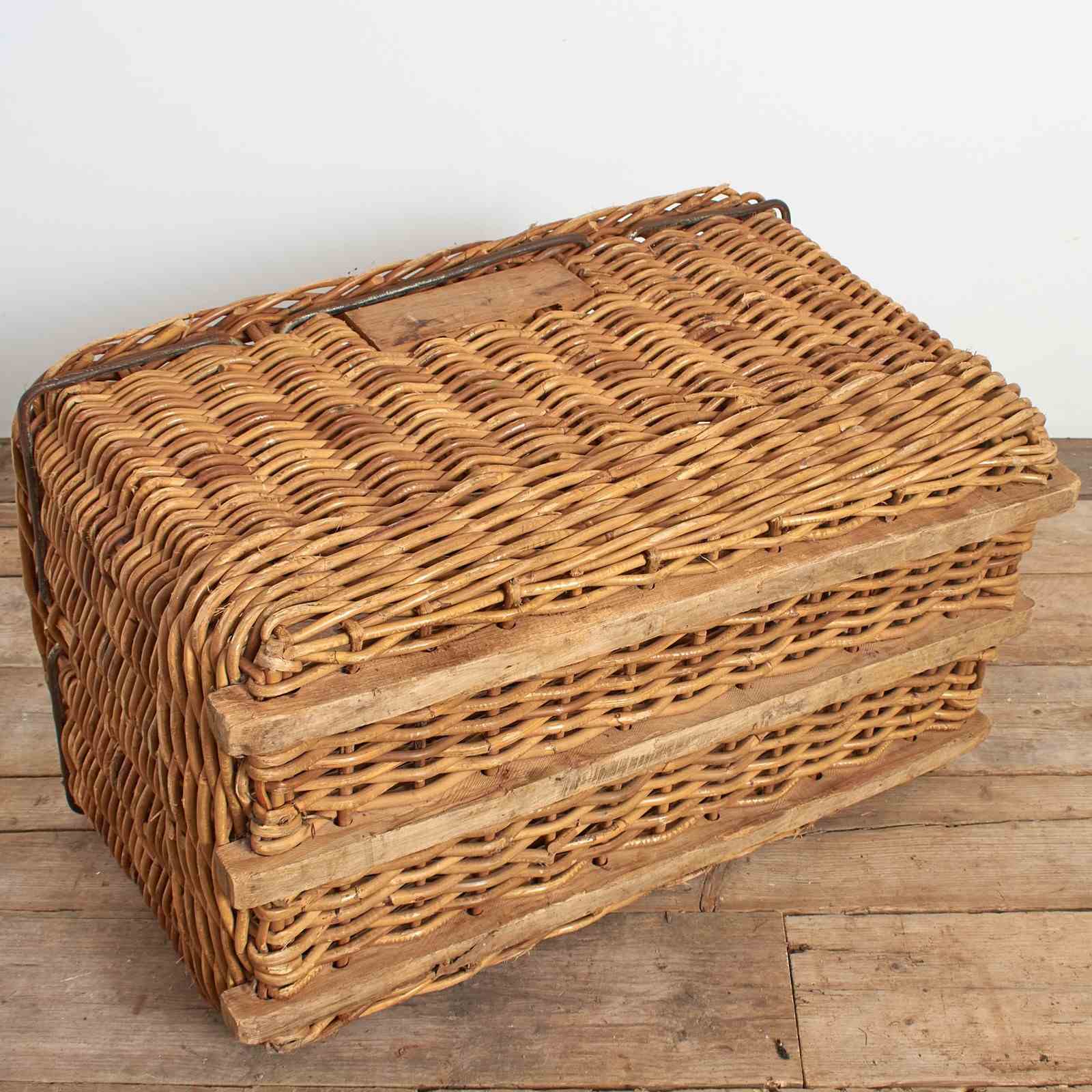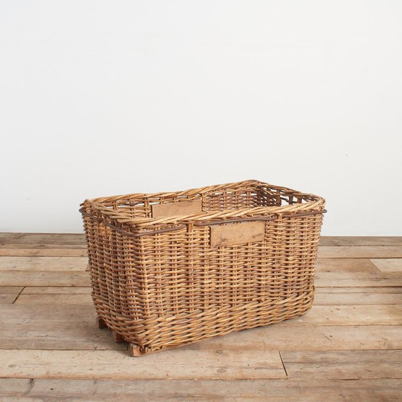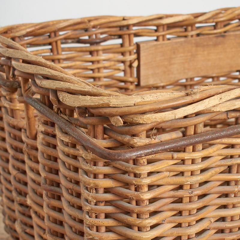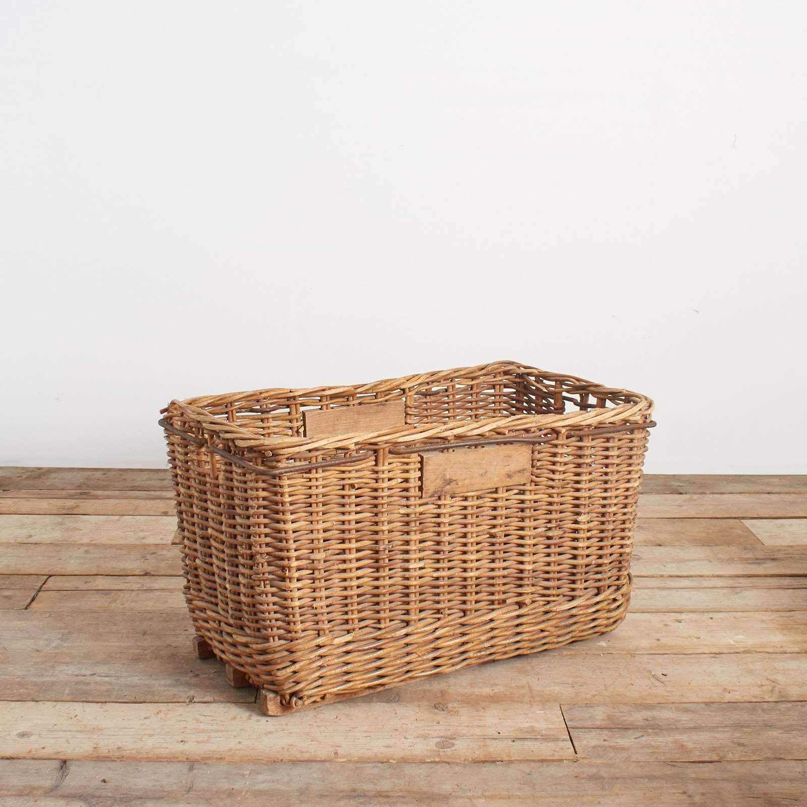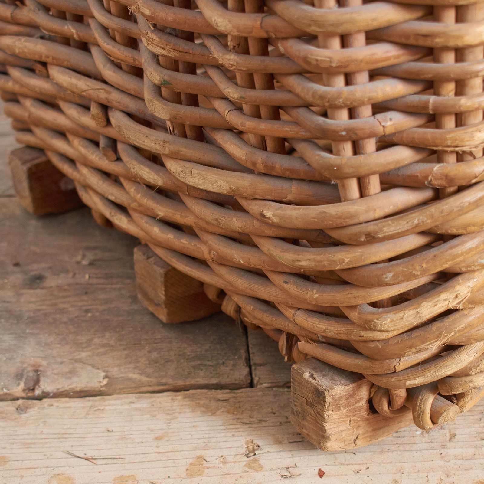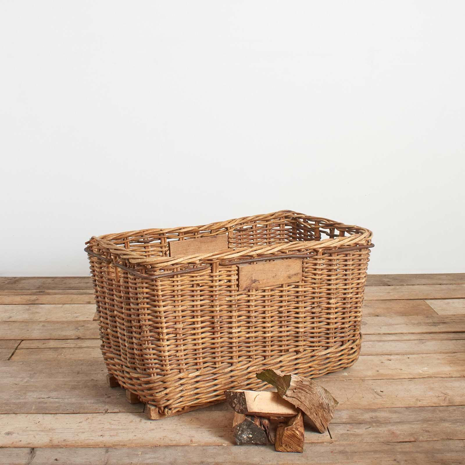 A lovely hand-made wicker laundry basket from France. Three wooden base runners give extra strength together with a metal support bar at the top of the basket. It is sturdy and perfect for storing logs by the fire.