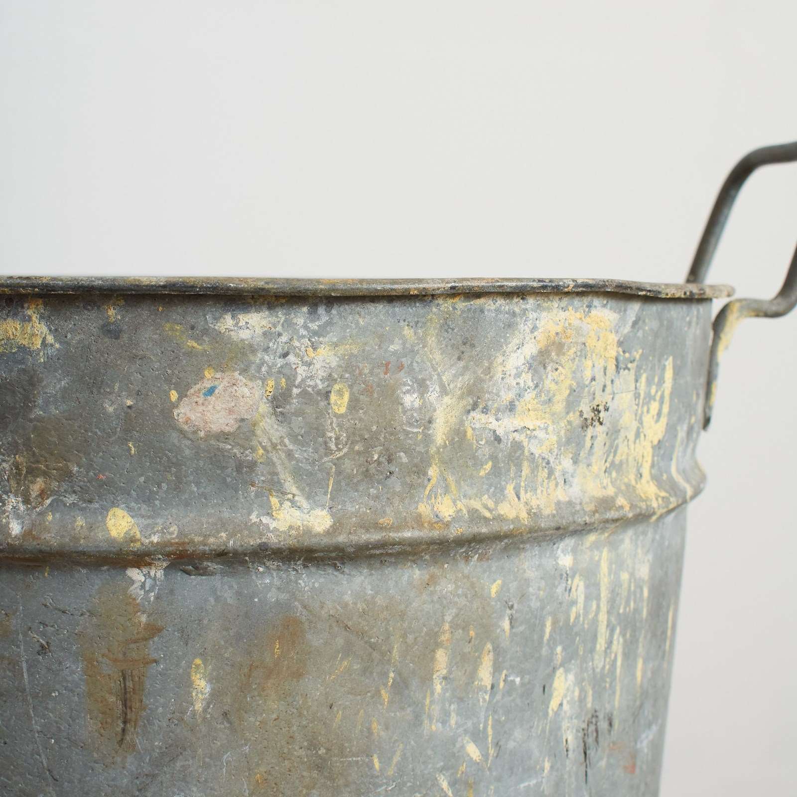A bucket shaped bucket made from galvanised metal. Each bucket has some ribbed bands around the planter and a pair of carry handles. Perfect as a garden planter.