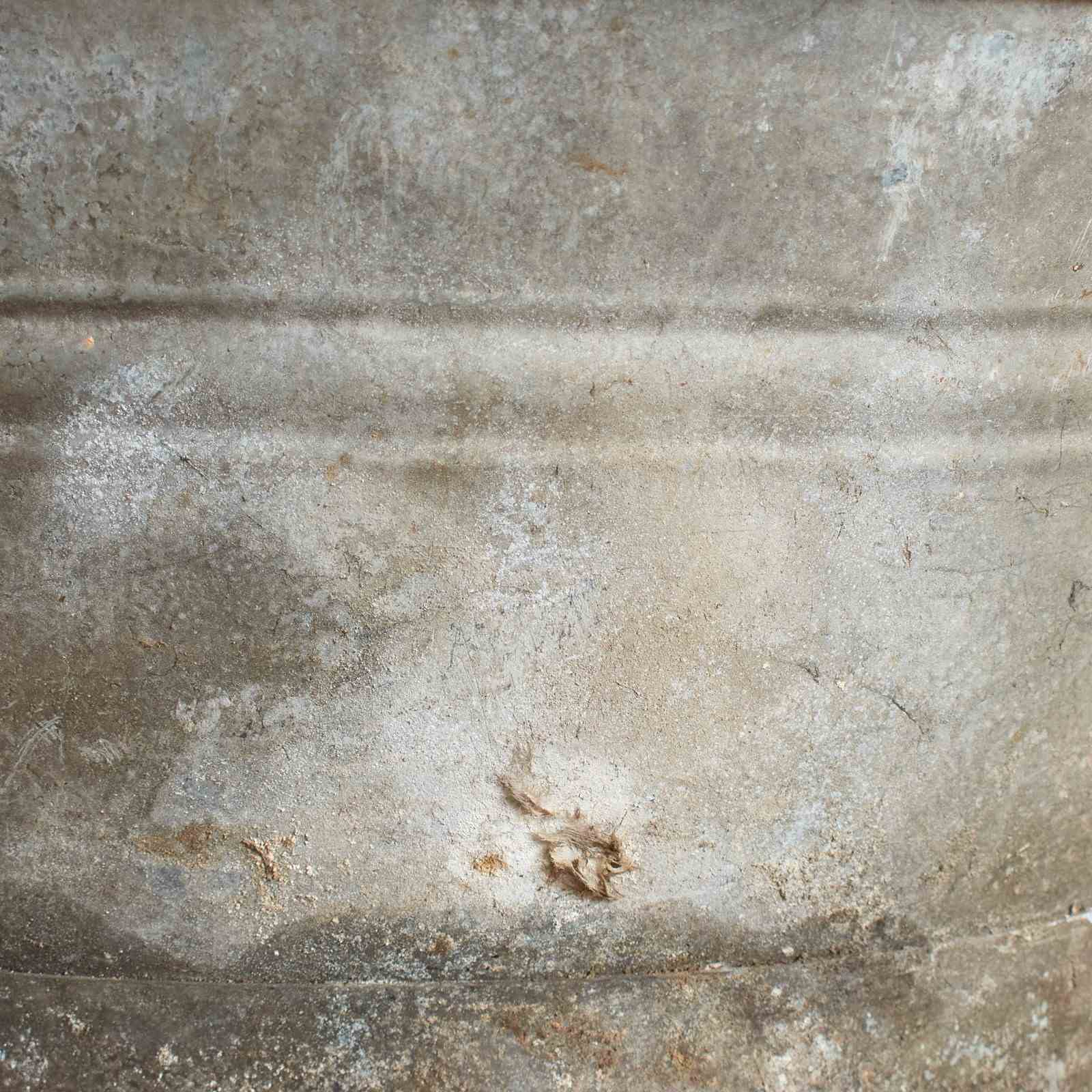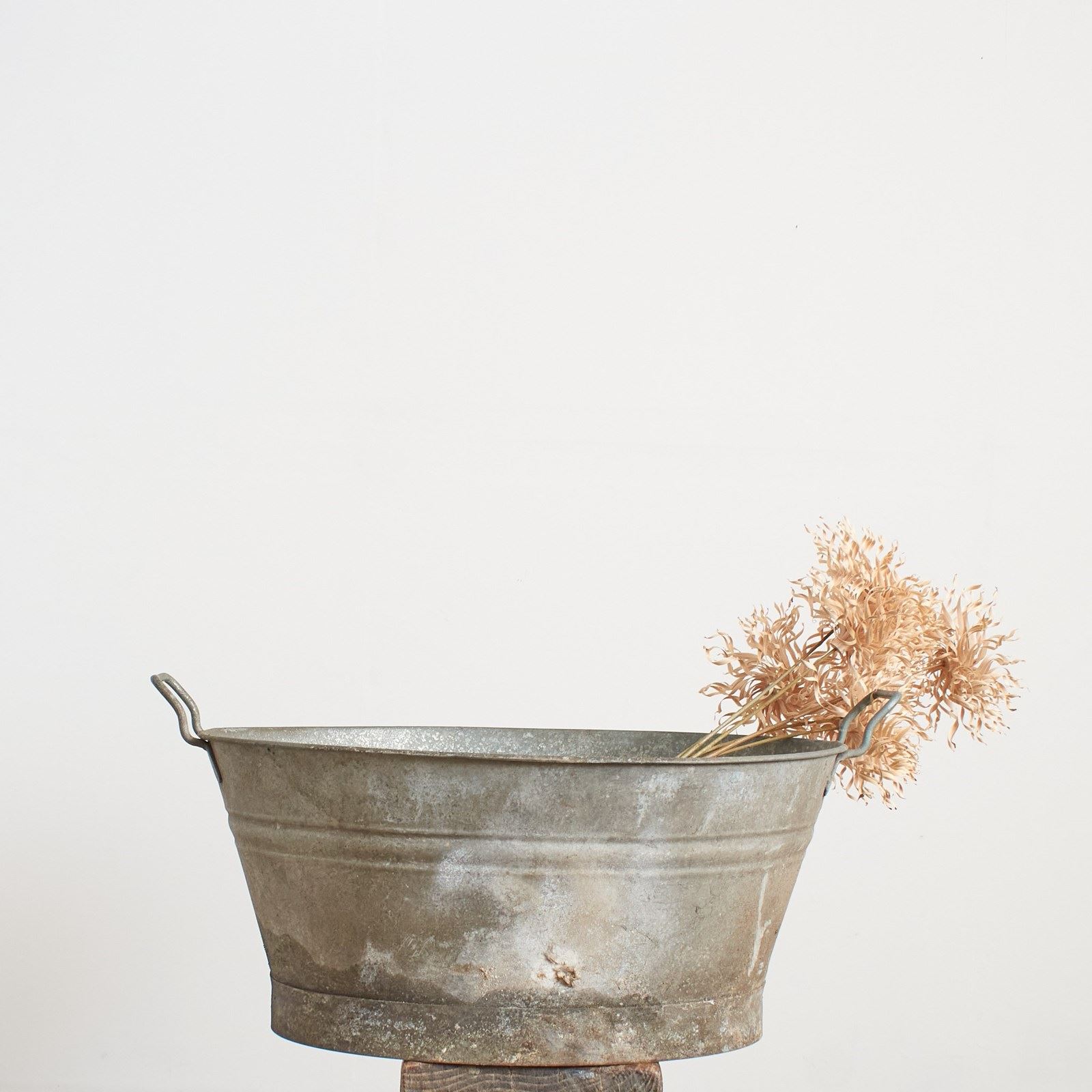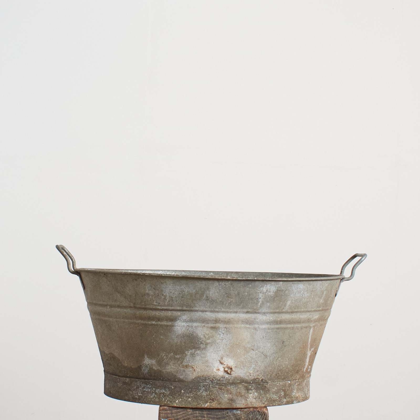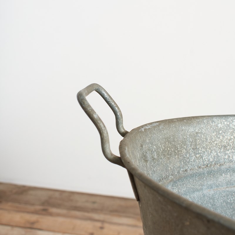 The bath tub is made of galvanised metal with a pair of carry handles.