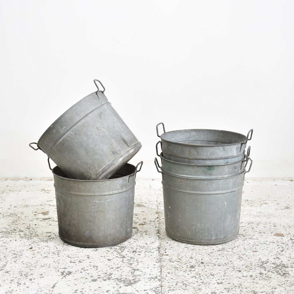 A bucket shaped bucket made from galvanised metal. Each bucket has a ribbed band around the upper section and a pair of carry handles. Perfect as a garden planter.