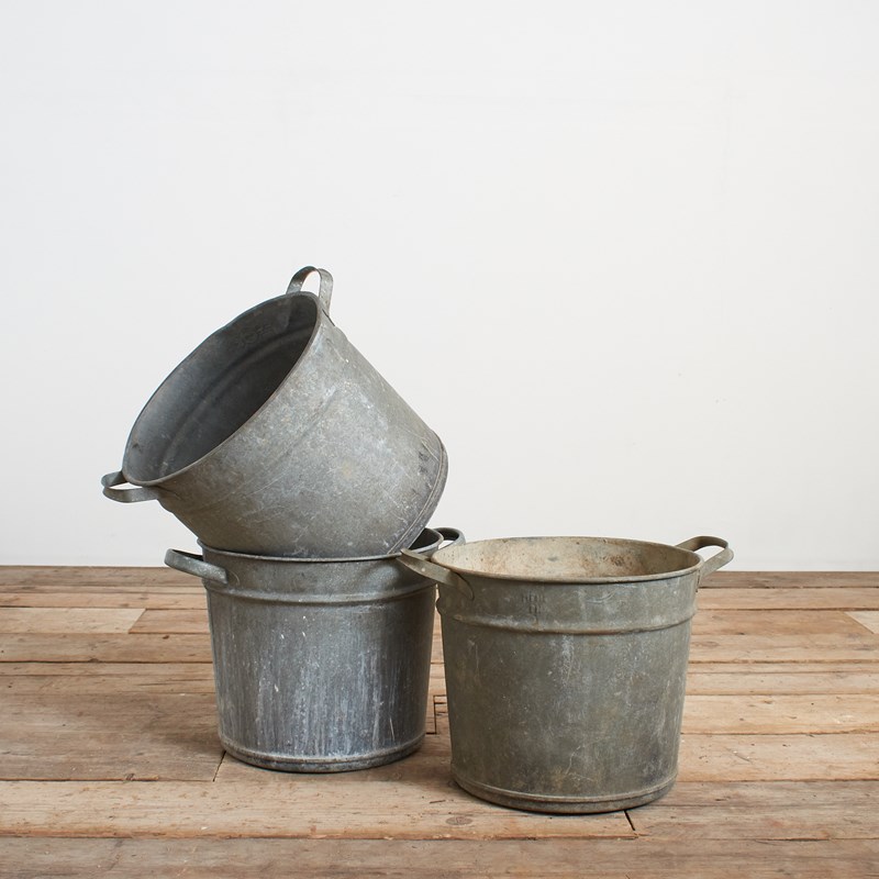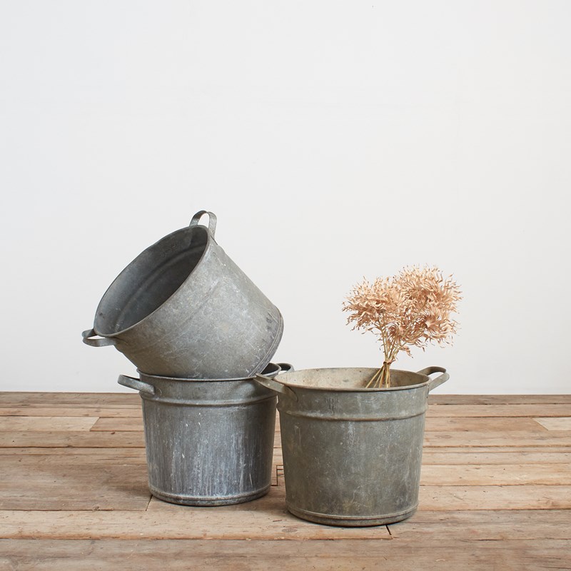 A bucket shaped bucket made from galvanised metal. Each bucket has a ribbed band around the upper section and a pair of carry handles. Perfect as a garden planter.