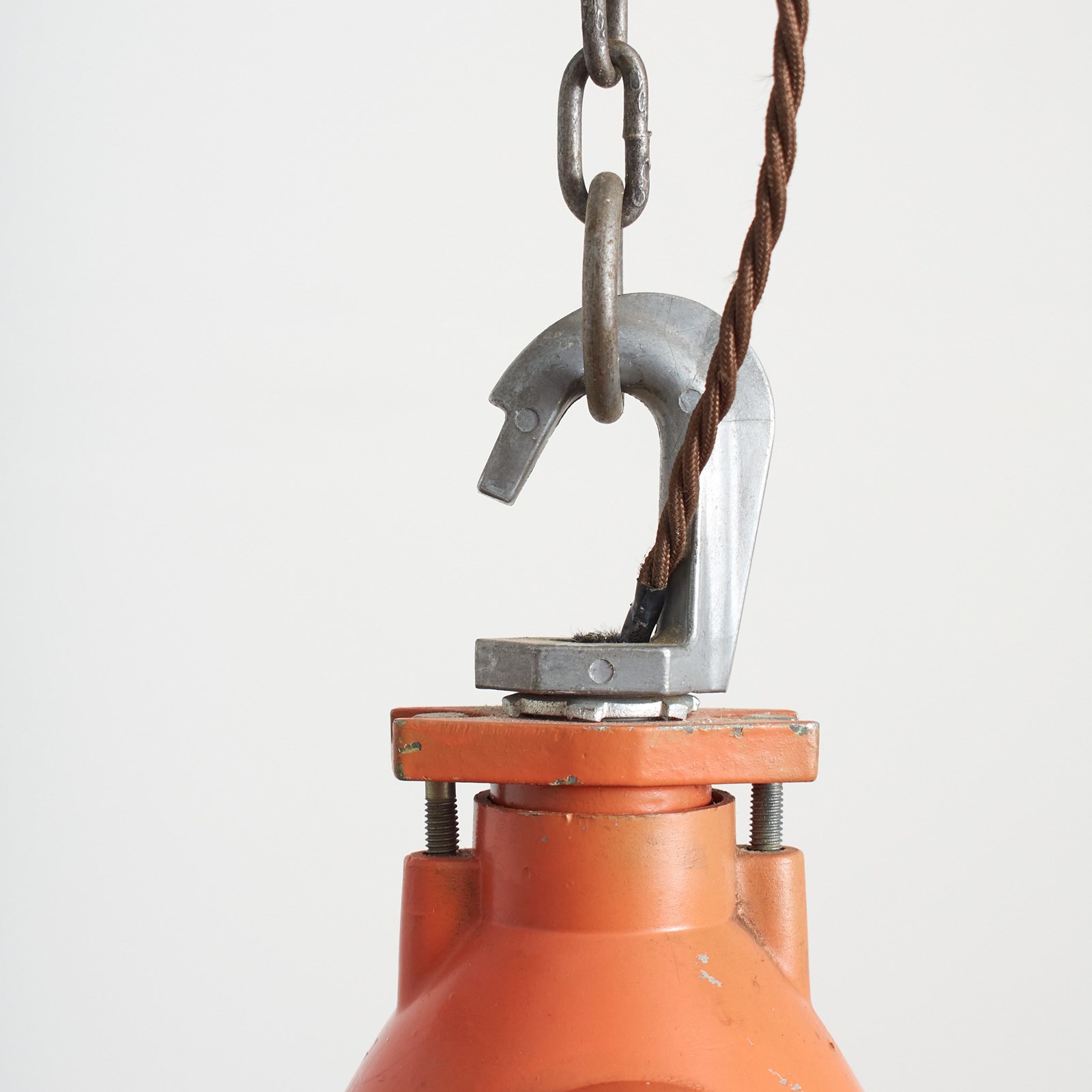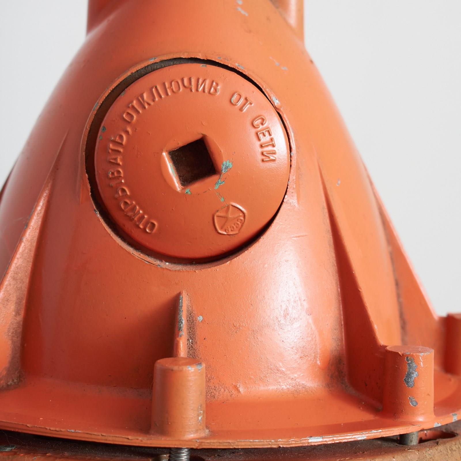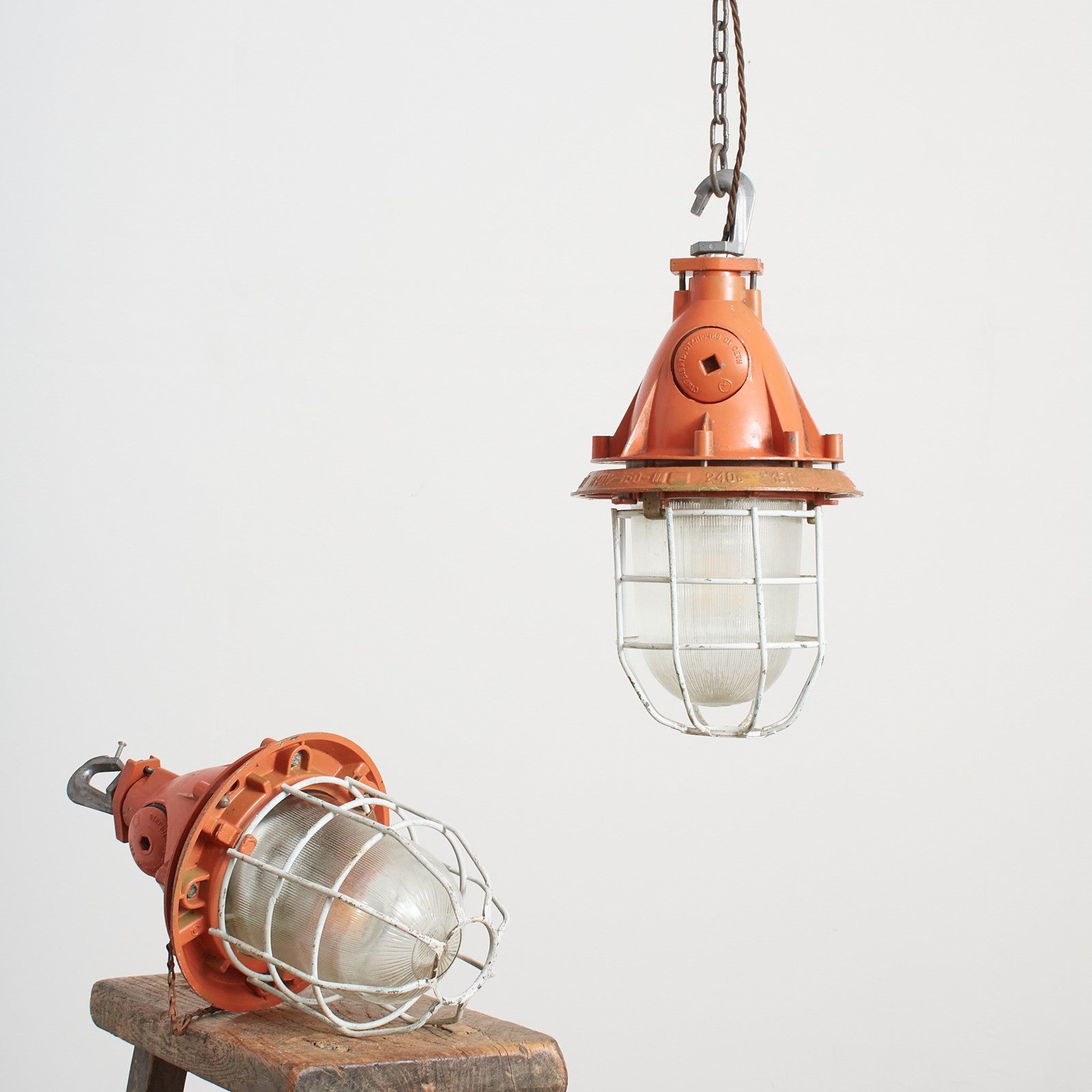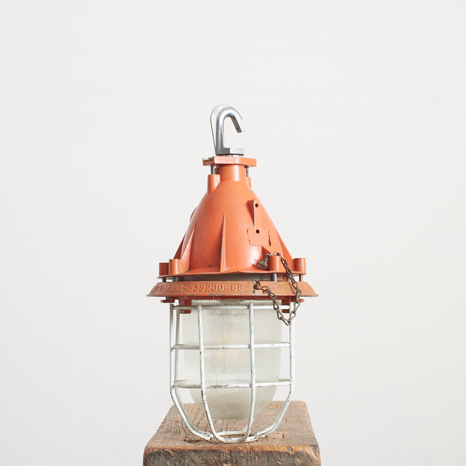 An original factory cage light which would have been used in a Cold War USSR bunker. The light has been historically overpainted in orange paint, The bulb and glass holder are protected by a white cage. Perfect for use in a group over kitchen islands or in workshops or a retail environment.