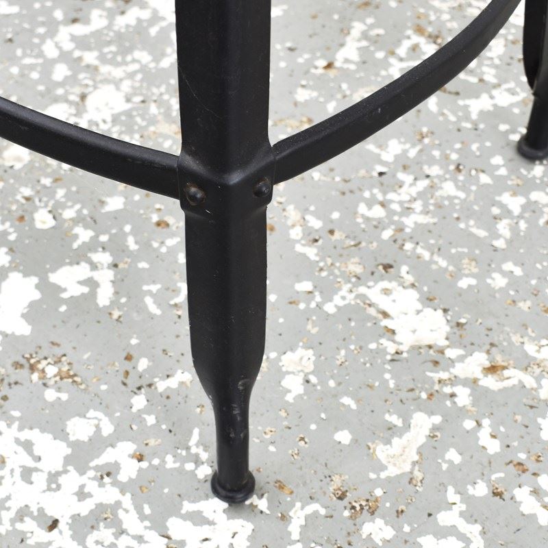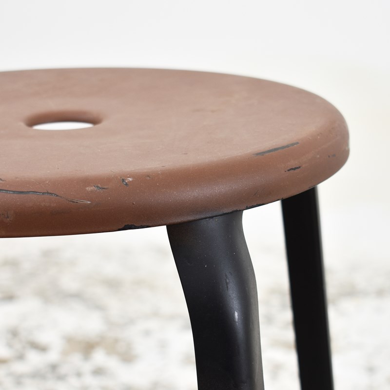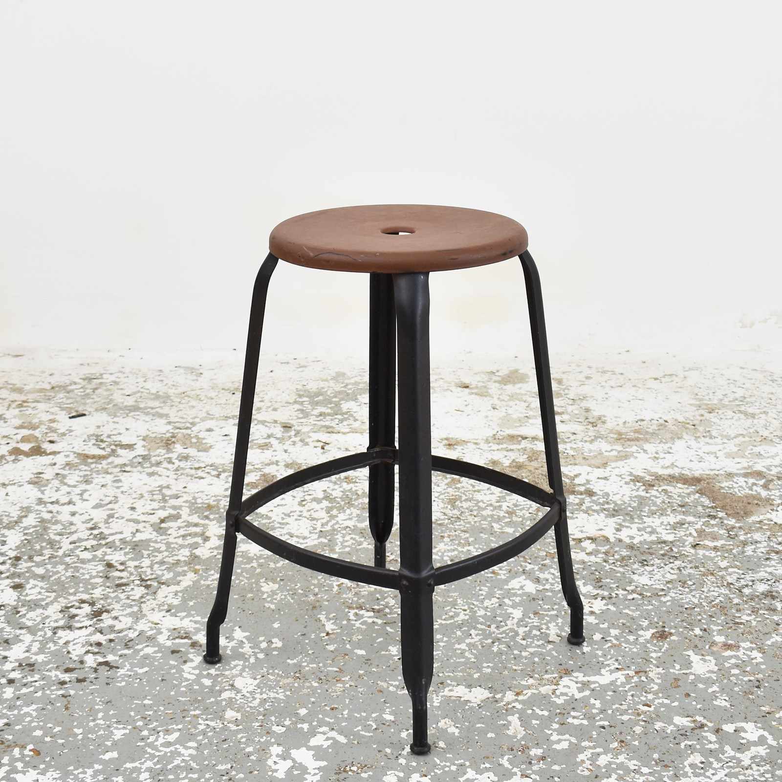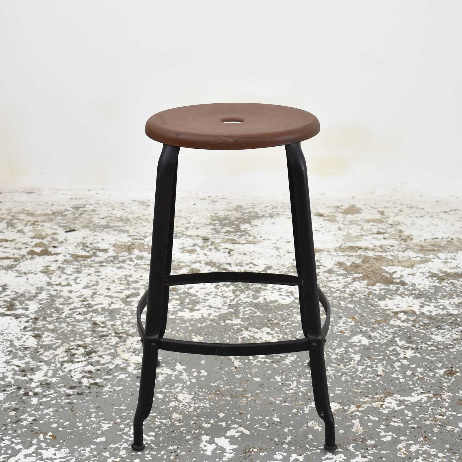 A tall industrial metal stool in the style of the iconic French ‘Nicolle’ factory stools manufactured outside Paris. This stool has black legs and a brown seat.