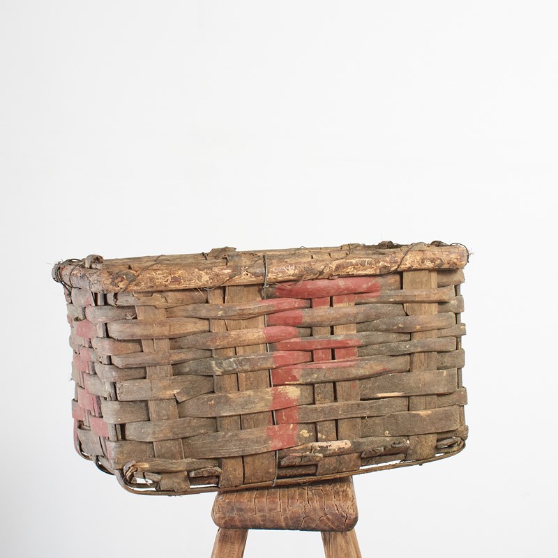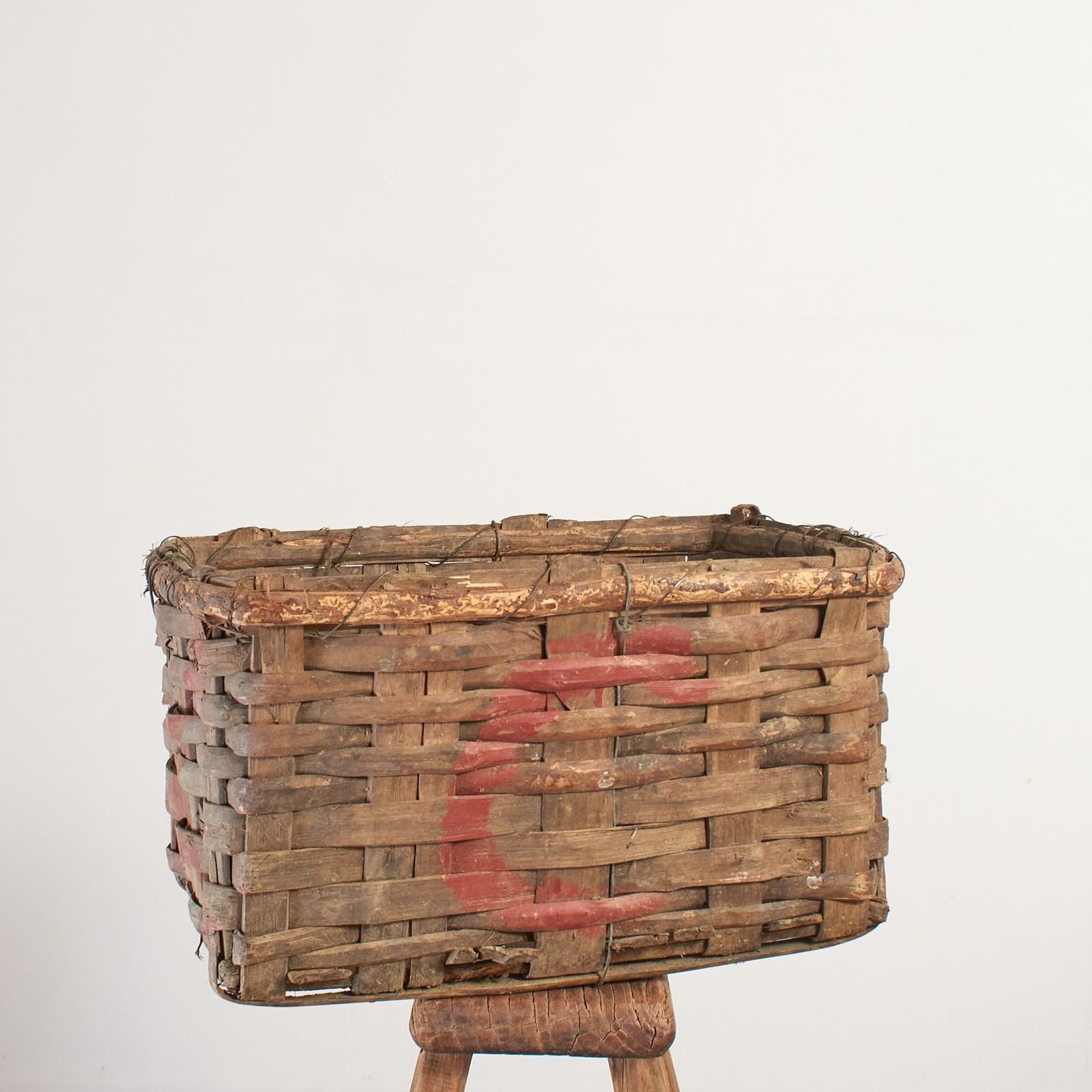 An original hand woven basket used for transporting the harvested green grapes for vinho verde or red grapes for port ready for shipping. It is made from a heavy weave designed to withstand the heavy use of grape harvesting. It would make an ideal log, laundry or storage basket. The basket still retains its original red marking on the sides to identify the vineyard.