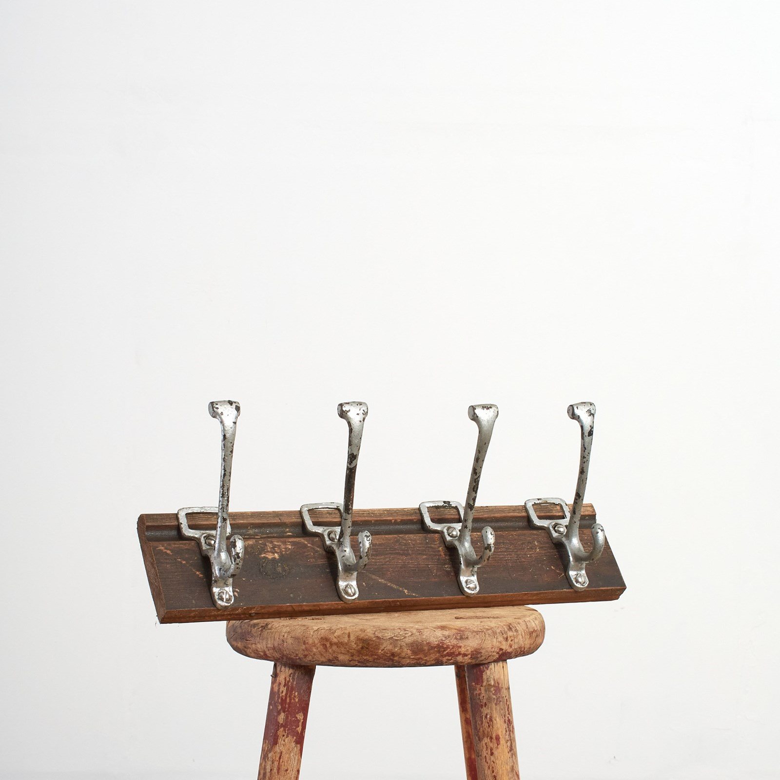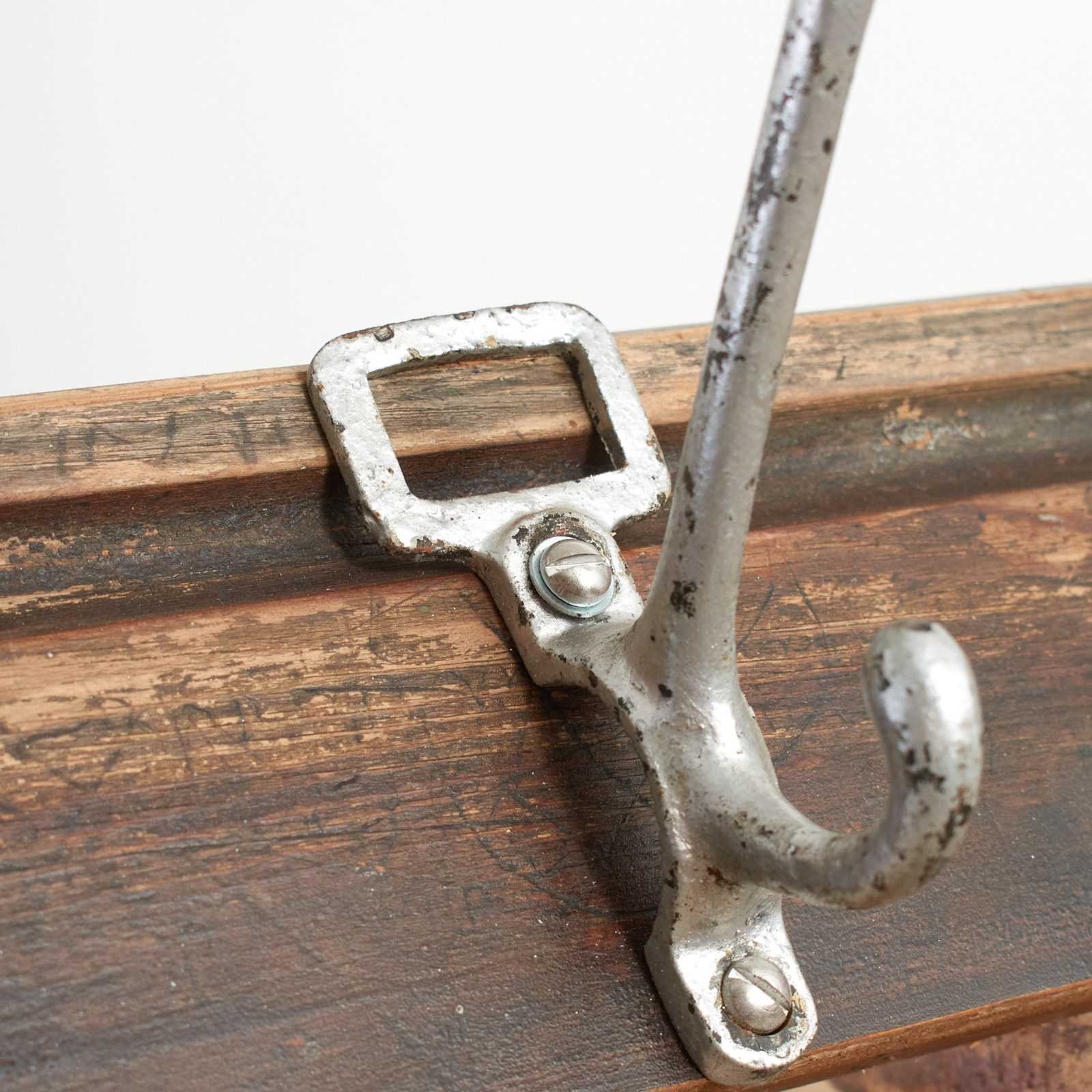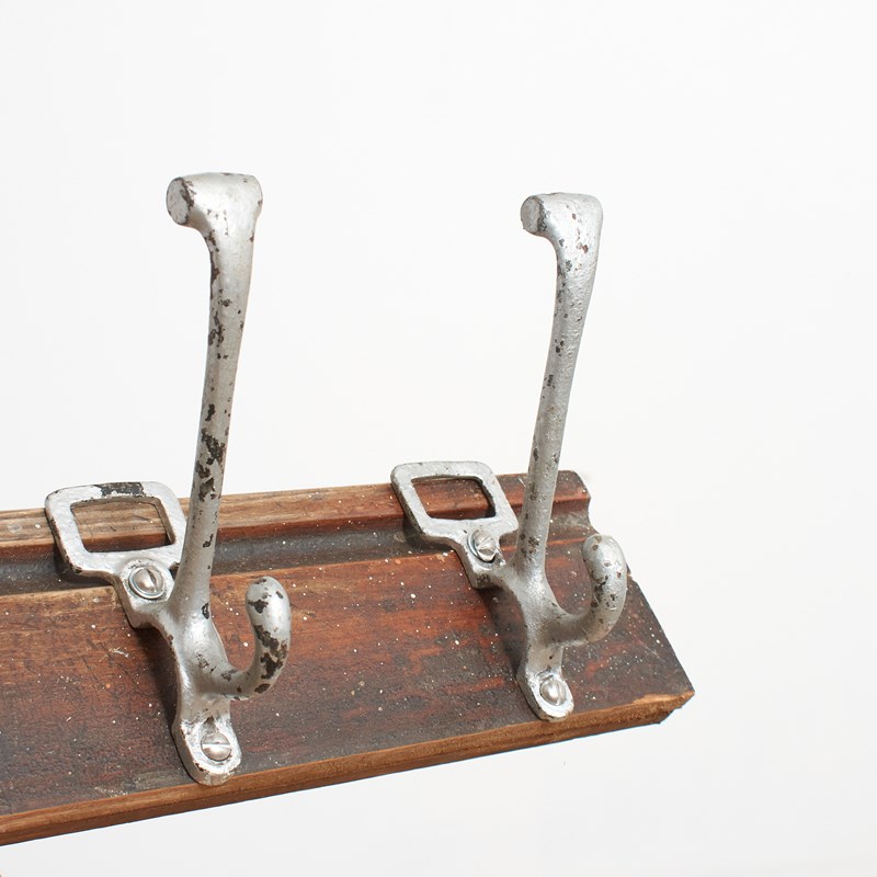 The hooks were reclaimed from a Peak District school and are original 1950s hooks which have been mounted onto wood.