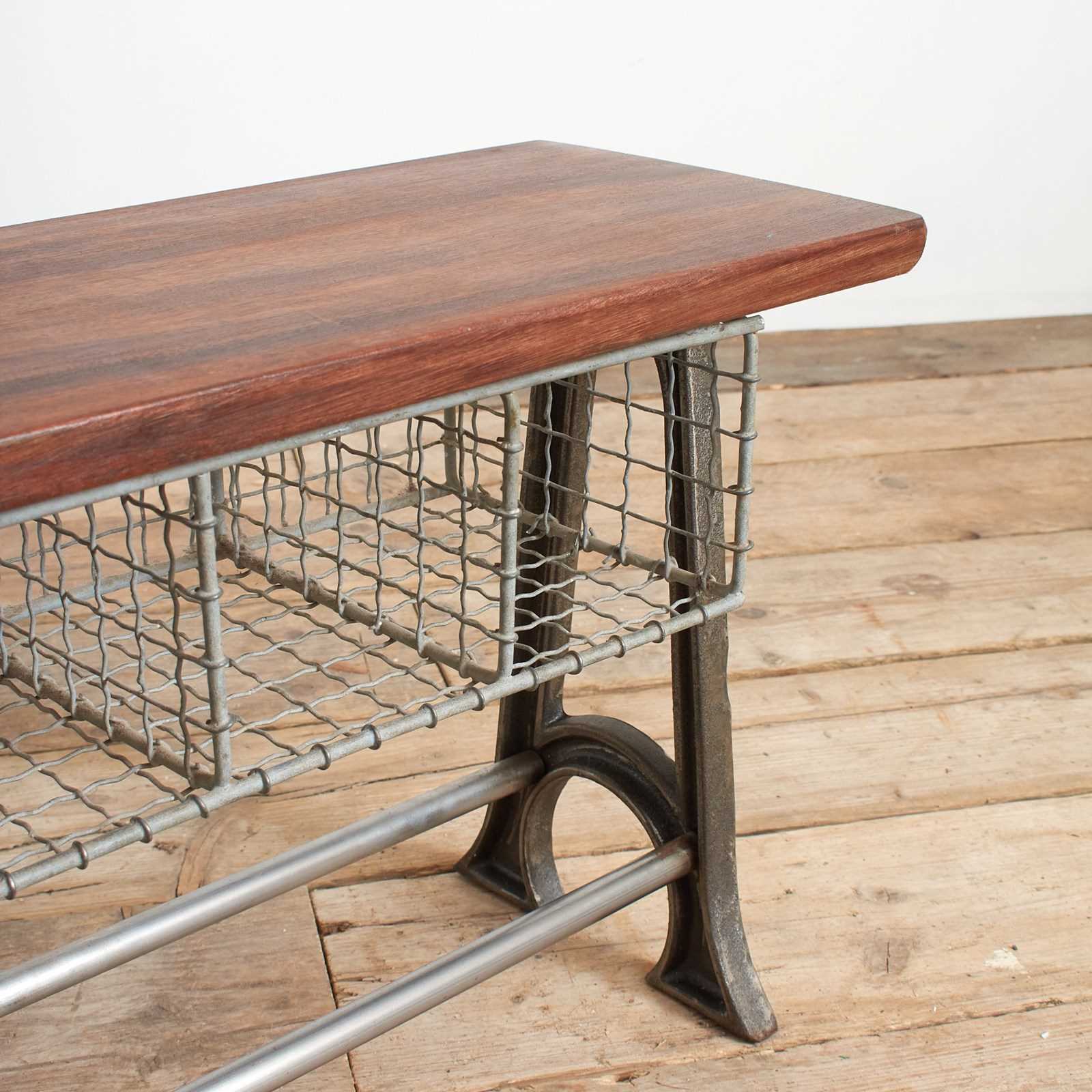 A School Locker Room Bench with a lovely original hardwood wooden top salvaged from a Grammar school. The bench with 5 pigeon holes present has cast metal legs and a pair of metal stretcher rods serving as a lower shelf.