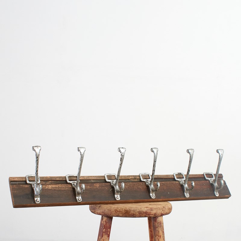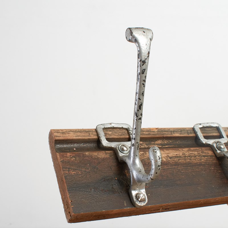 The hooks were reclaimed from a Peak District school and are original 1950s hooks which have been mounted onto wood.