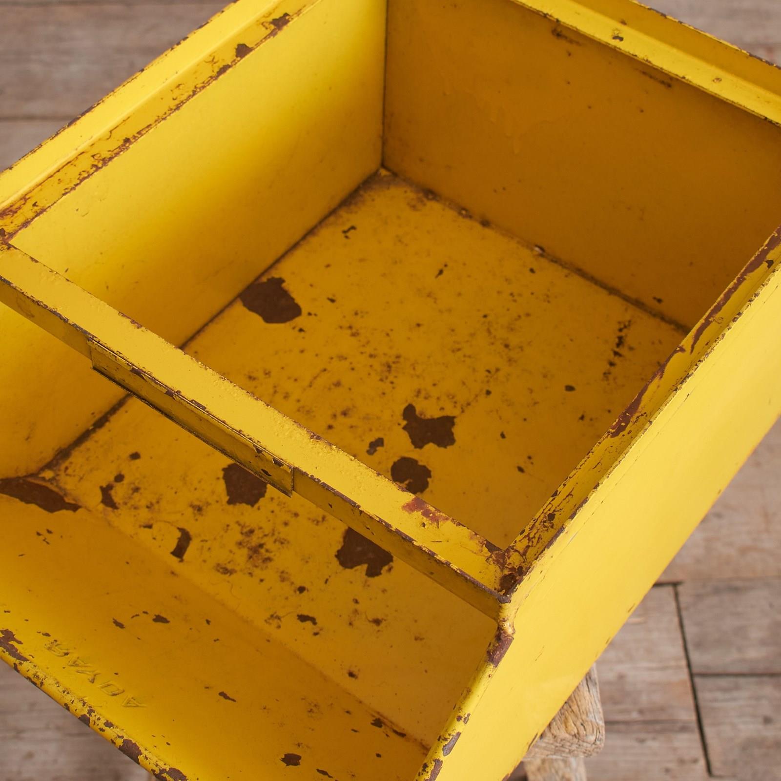 A very useful metal storage crate ideal for storing toys, craft bits, hats and gloves etc. Each crate stacks on top of the other so great for saving space too. The original yellow paint brings a nice bright look to a playroom or workshop.