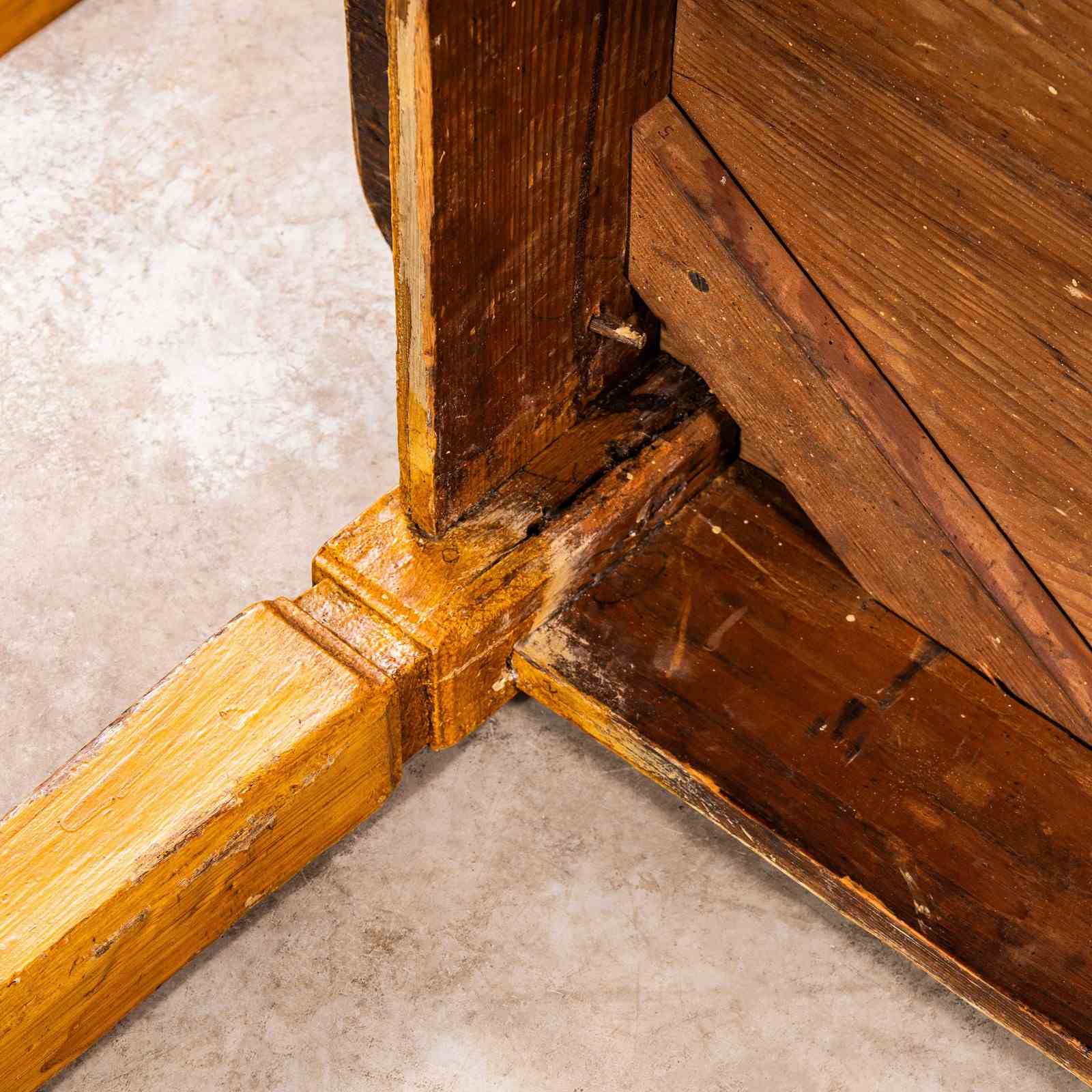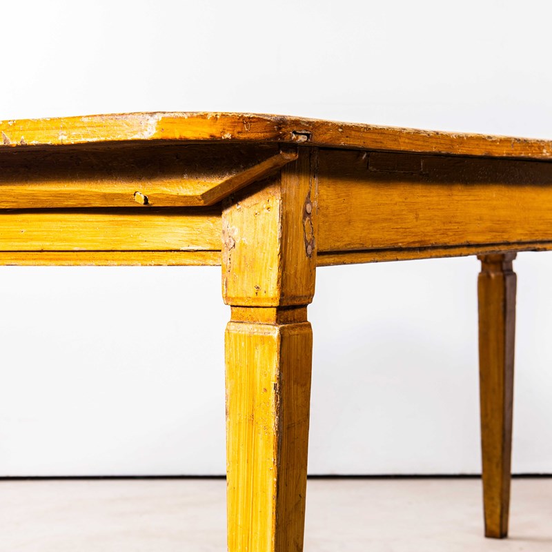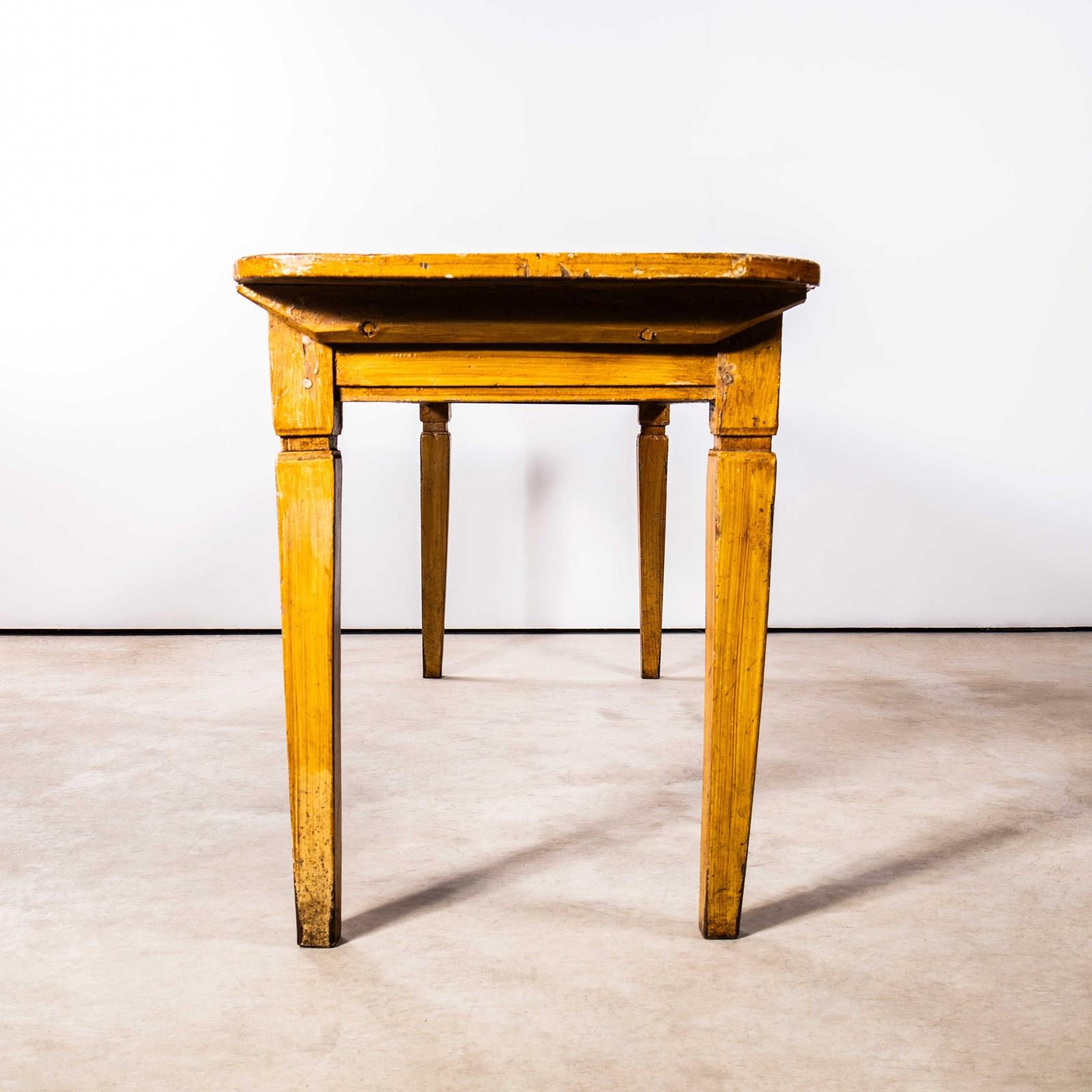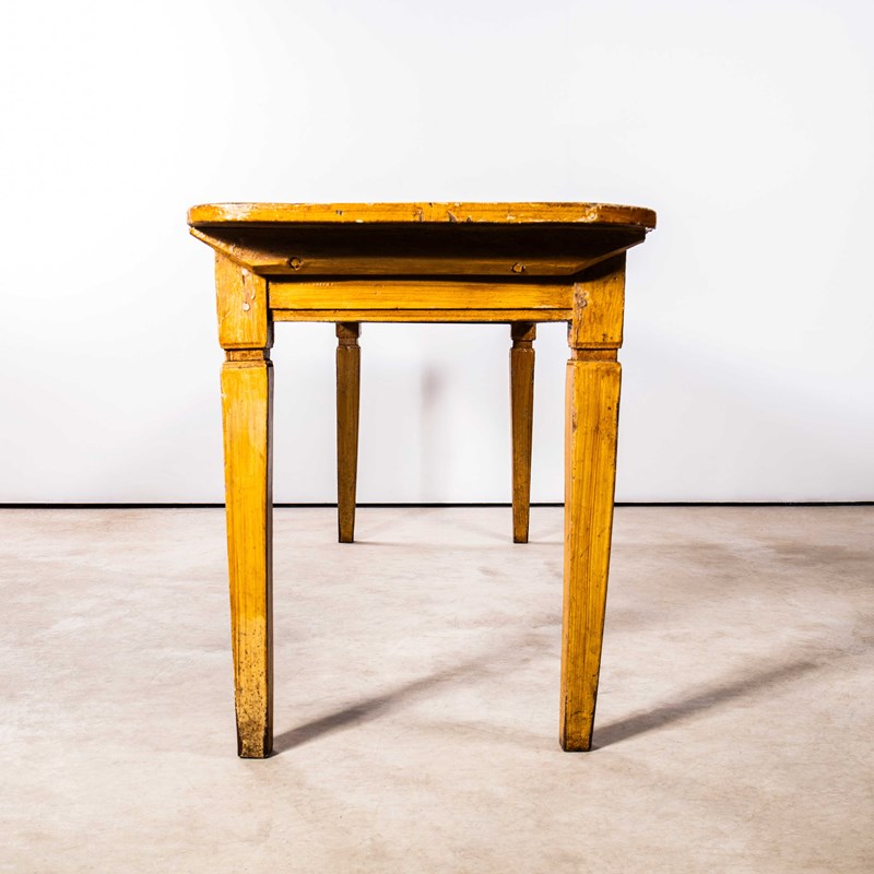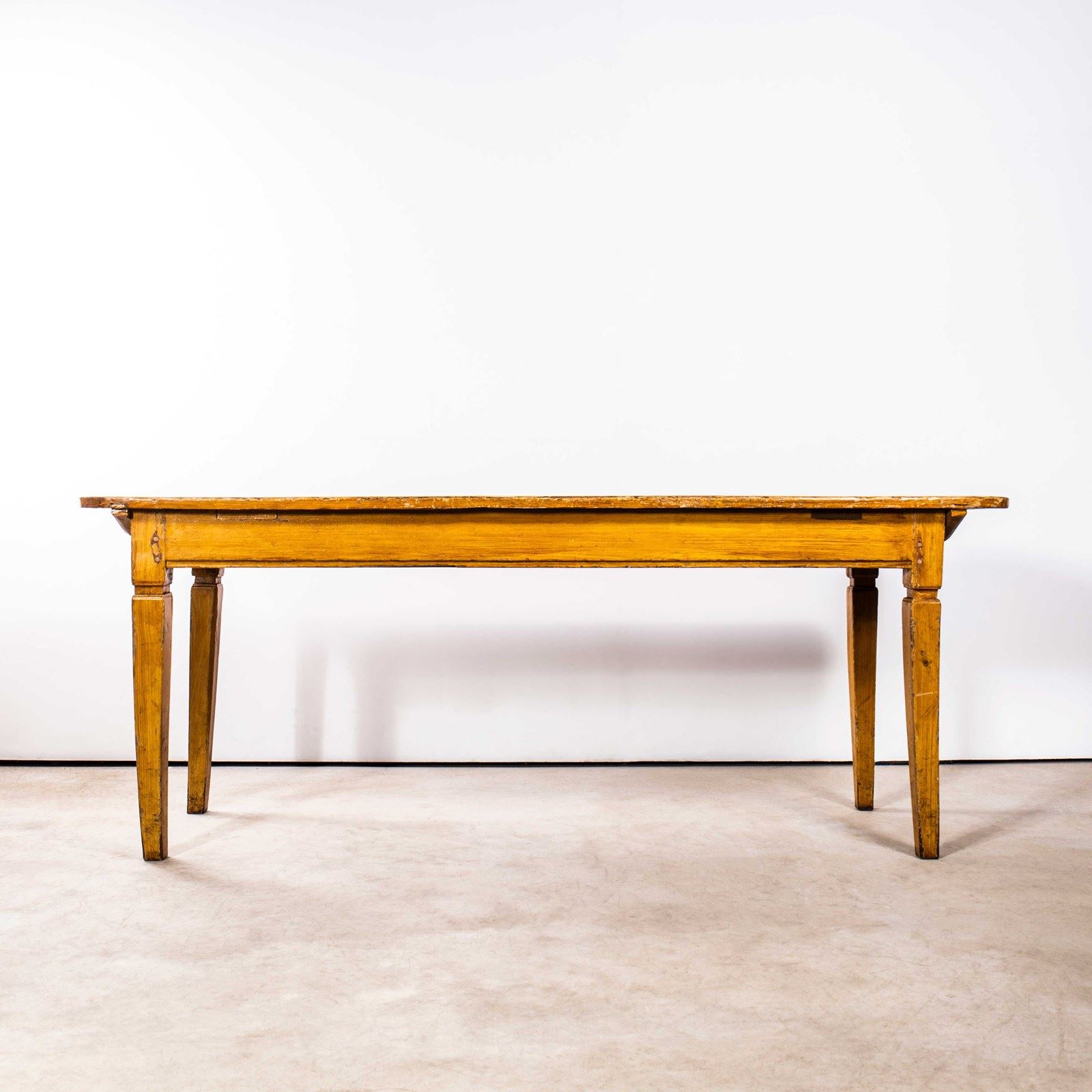 This is a very unusual and well proportioned dining table. Made in pitch pine throughout the table was made, then painted with a white gesso base before being decorated with a warm faux grain finish. The original finish is still largely intact giving a rich interesting colour and faux grain with a slight gloss. The faux finish has aged very well giving a rich character. The table has a smart angular design. We love it. Knee Clearance: 59cm.