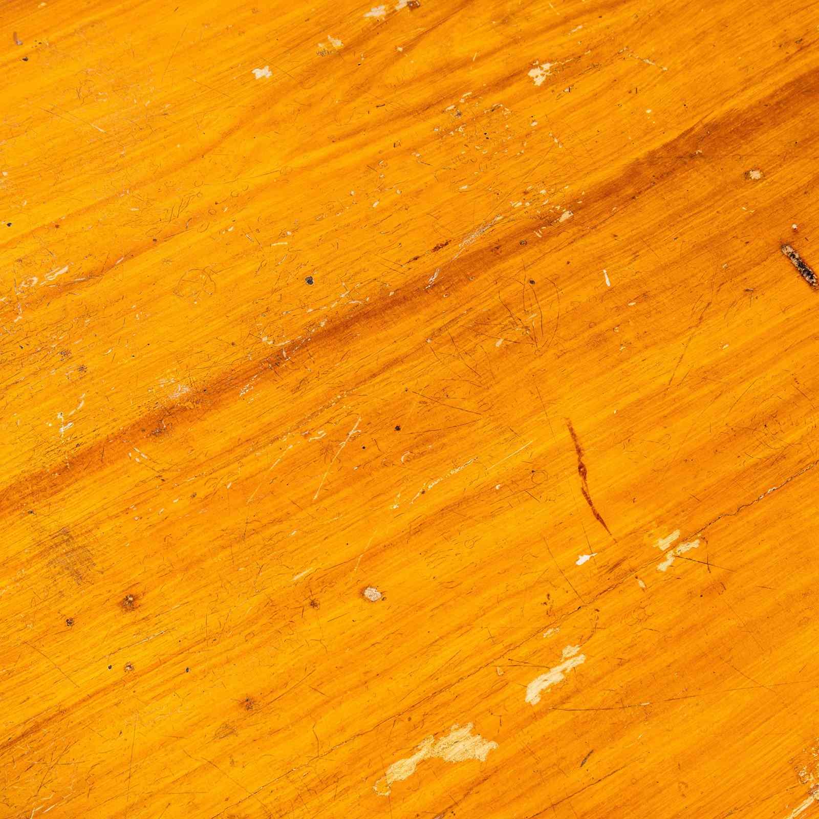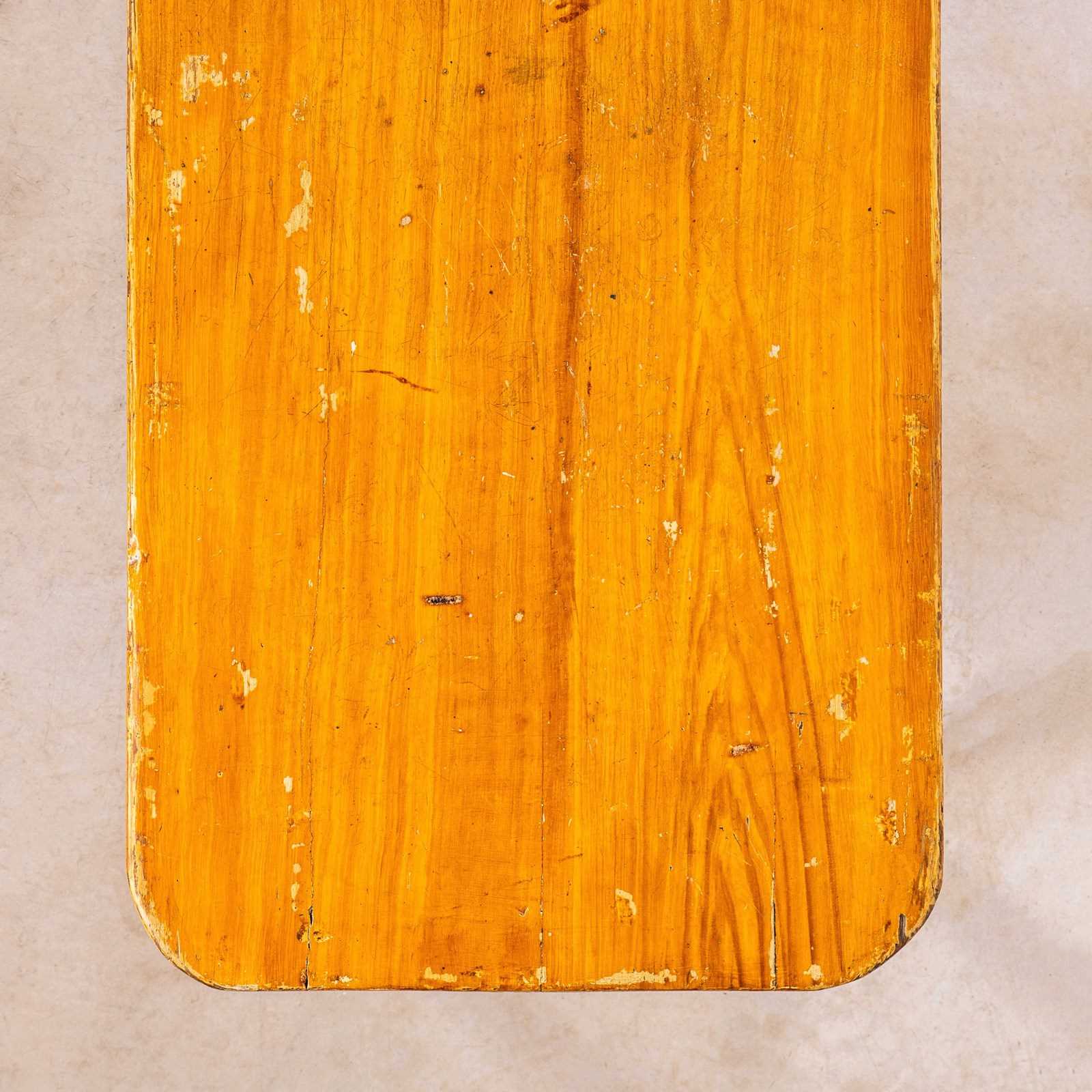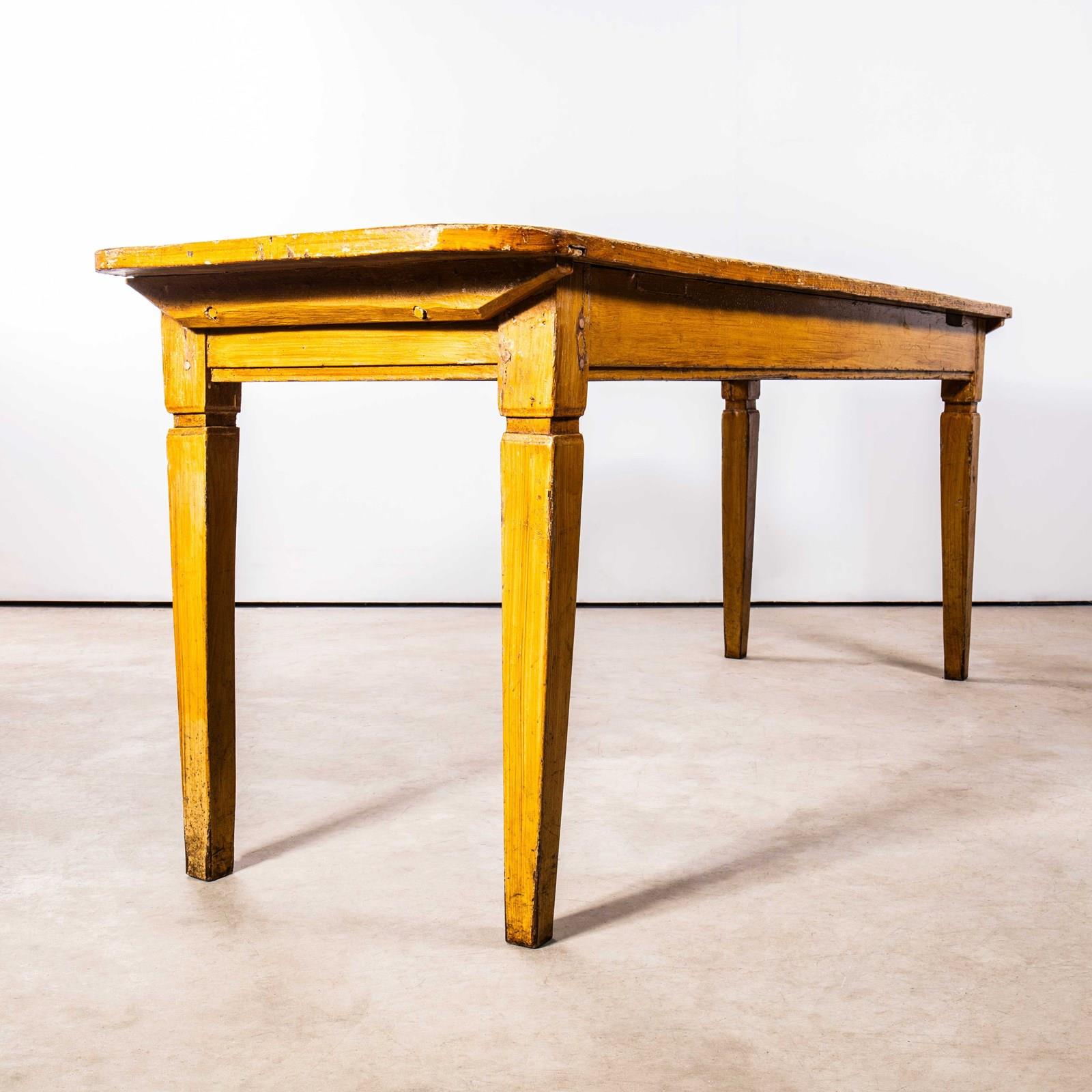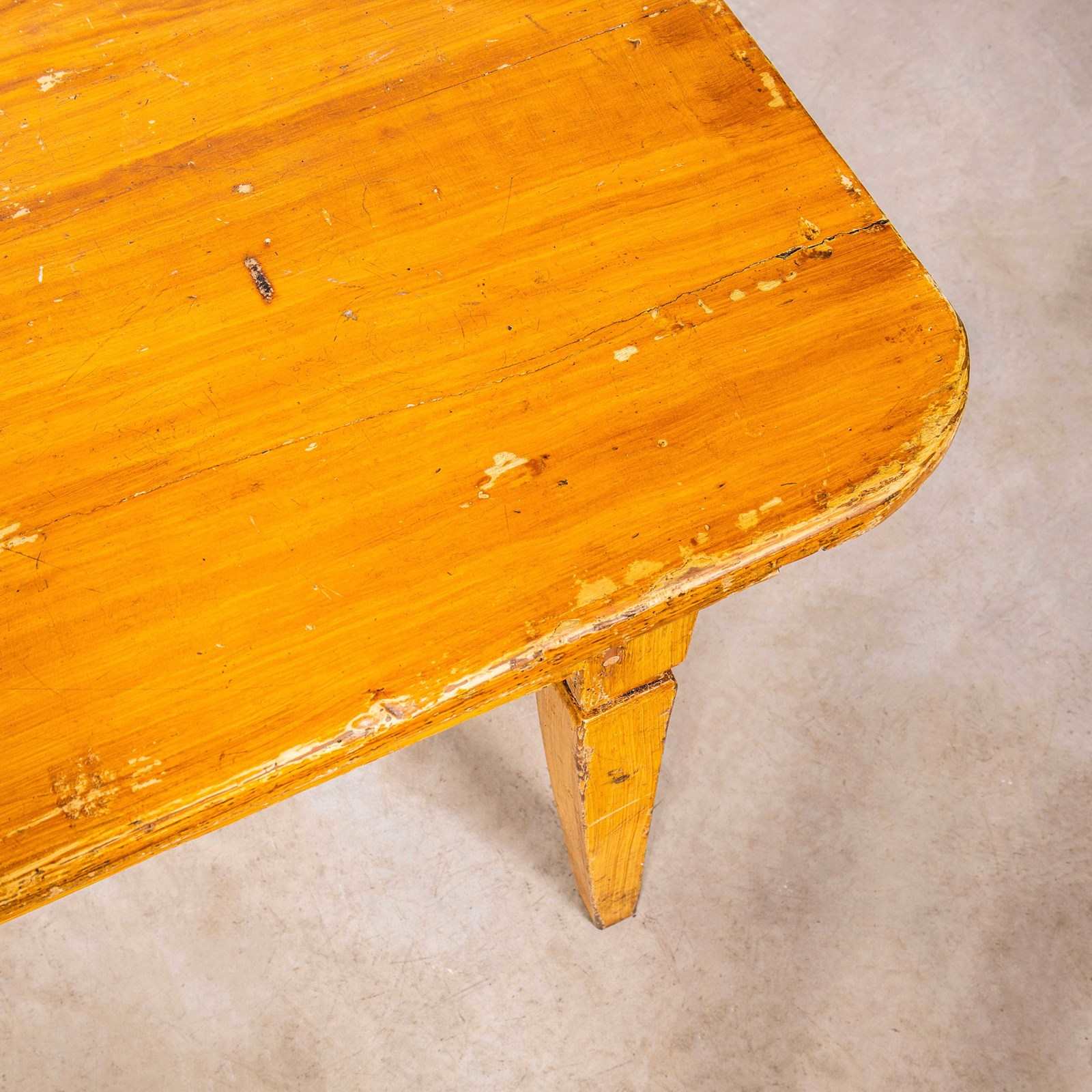 This is a very unusual and well proportioned dining table. Made in pitch pine throughout the table was made, then painted with a white gesso base before being decorated with a warm faux grain finish. The original finish is still largely intact giving a rich interesting colour and faux grain with a slight gloss. The faux finish has aged very well giving a rich character. The table has a smart angular design. We love it. Knee Clearance: 59cm.