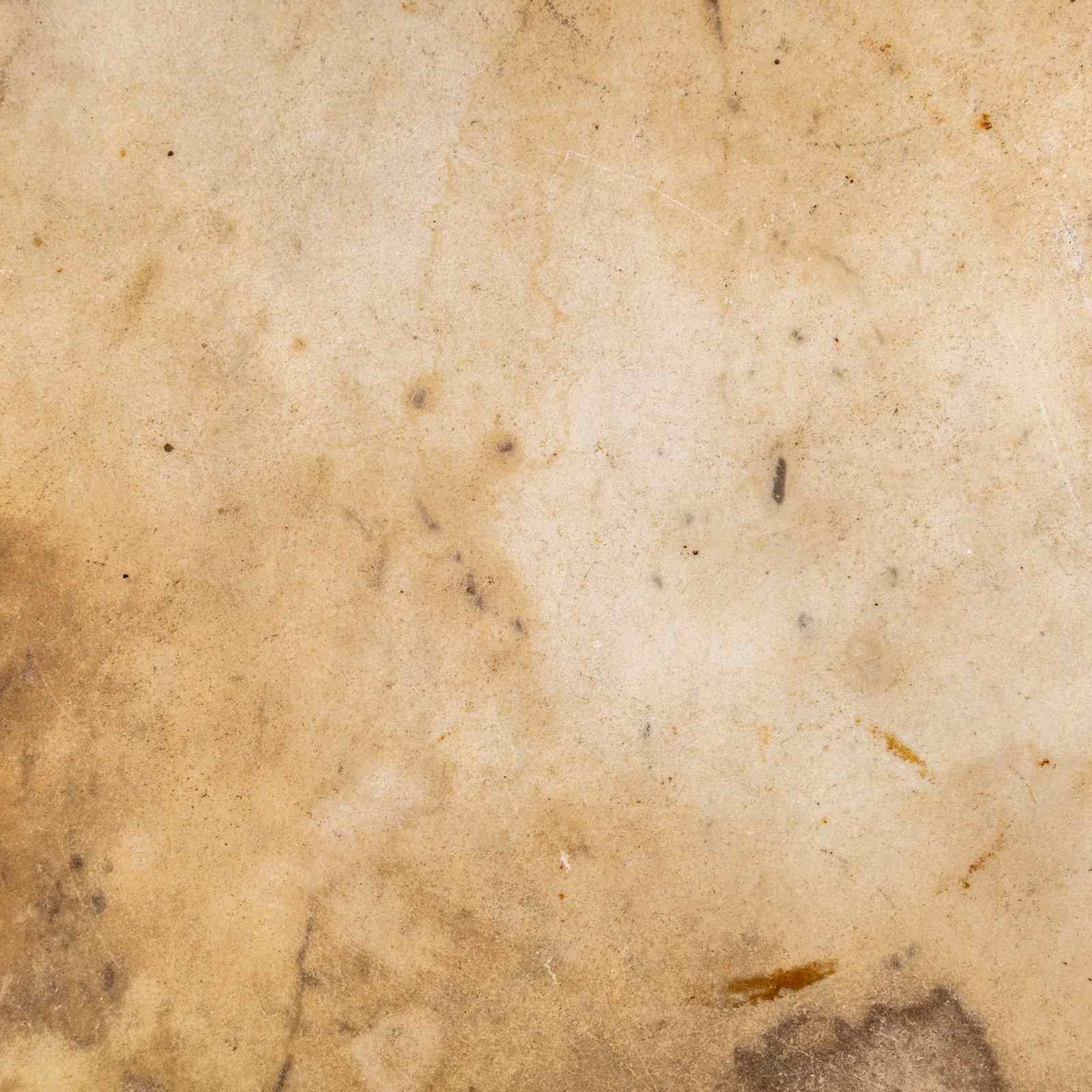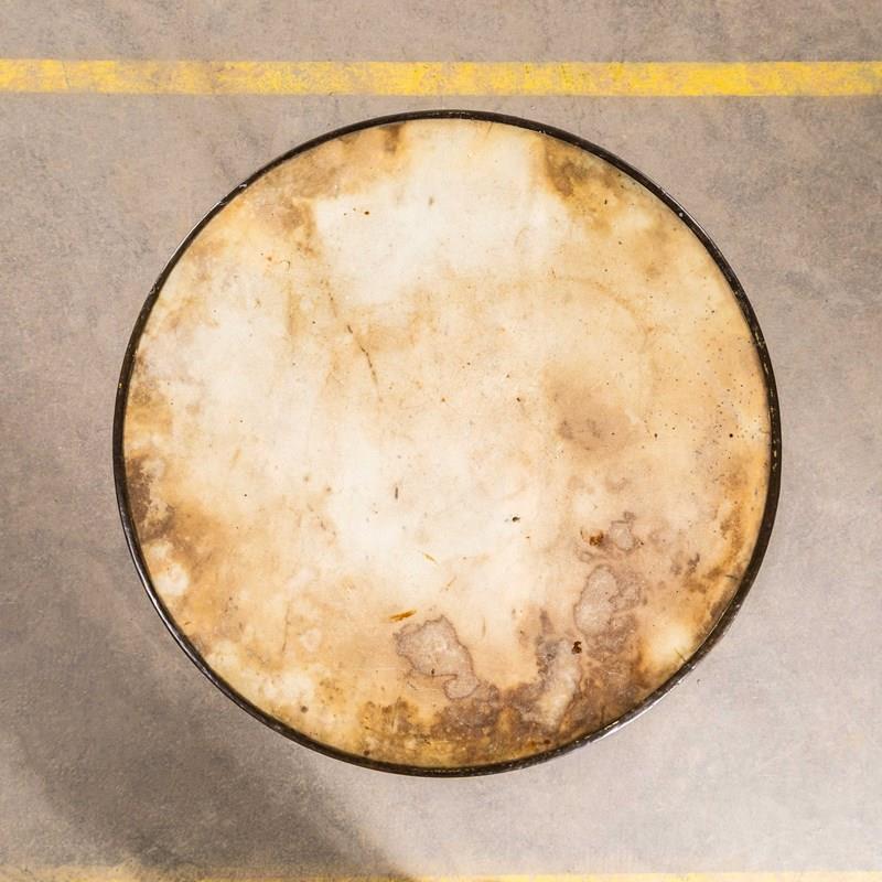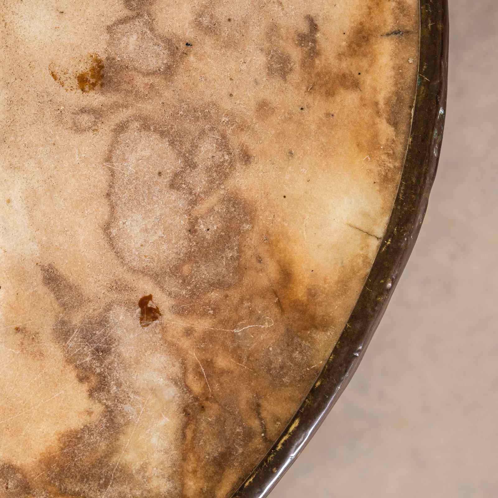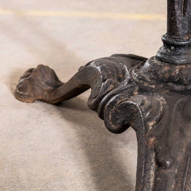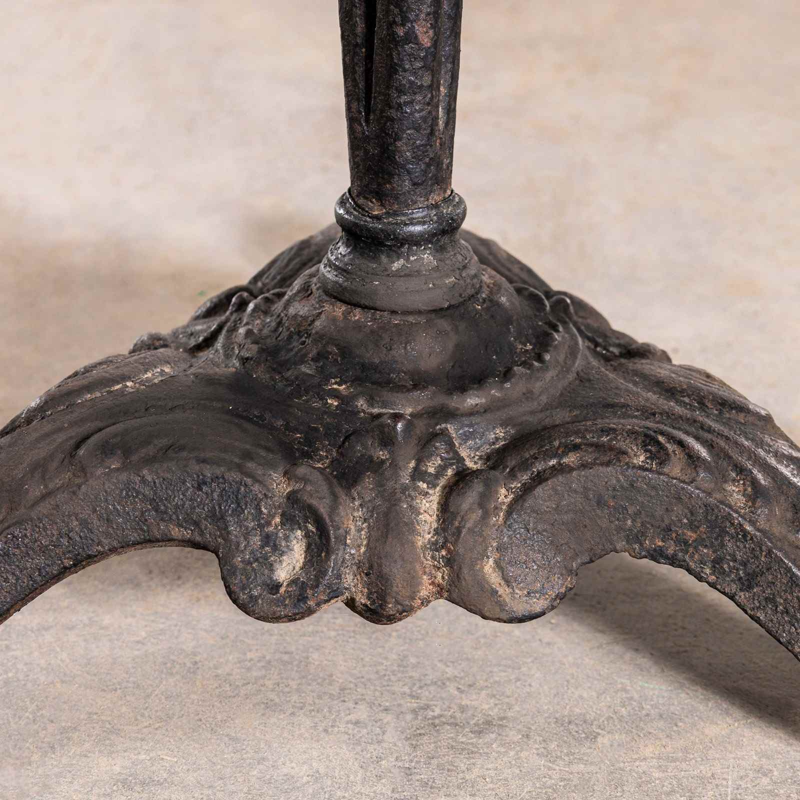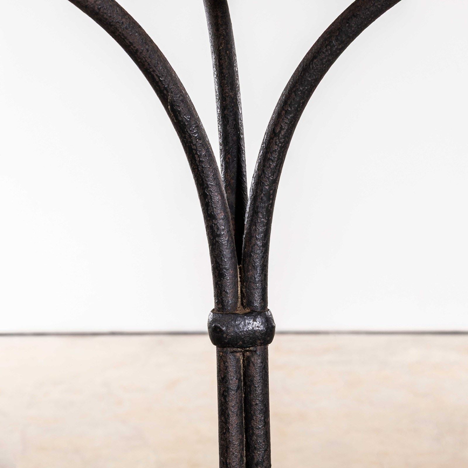 Exceptional original French cast base café table with a rod base made from three forged steel rods joined and hand formed and secured with a slip ring. The marble is original, heavily stained and worn with minor chips and wear. The outer ring is brass. Our workshop has cleaned and serviced the table, it is good to go.