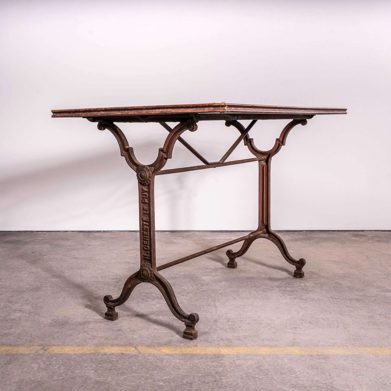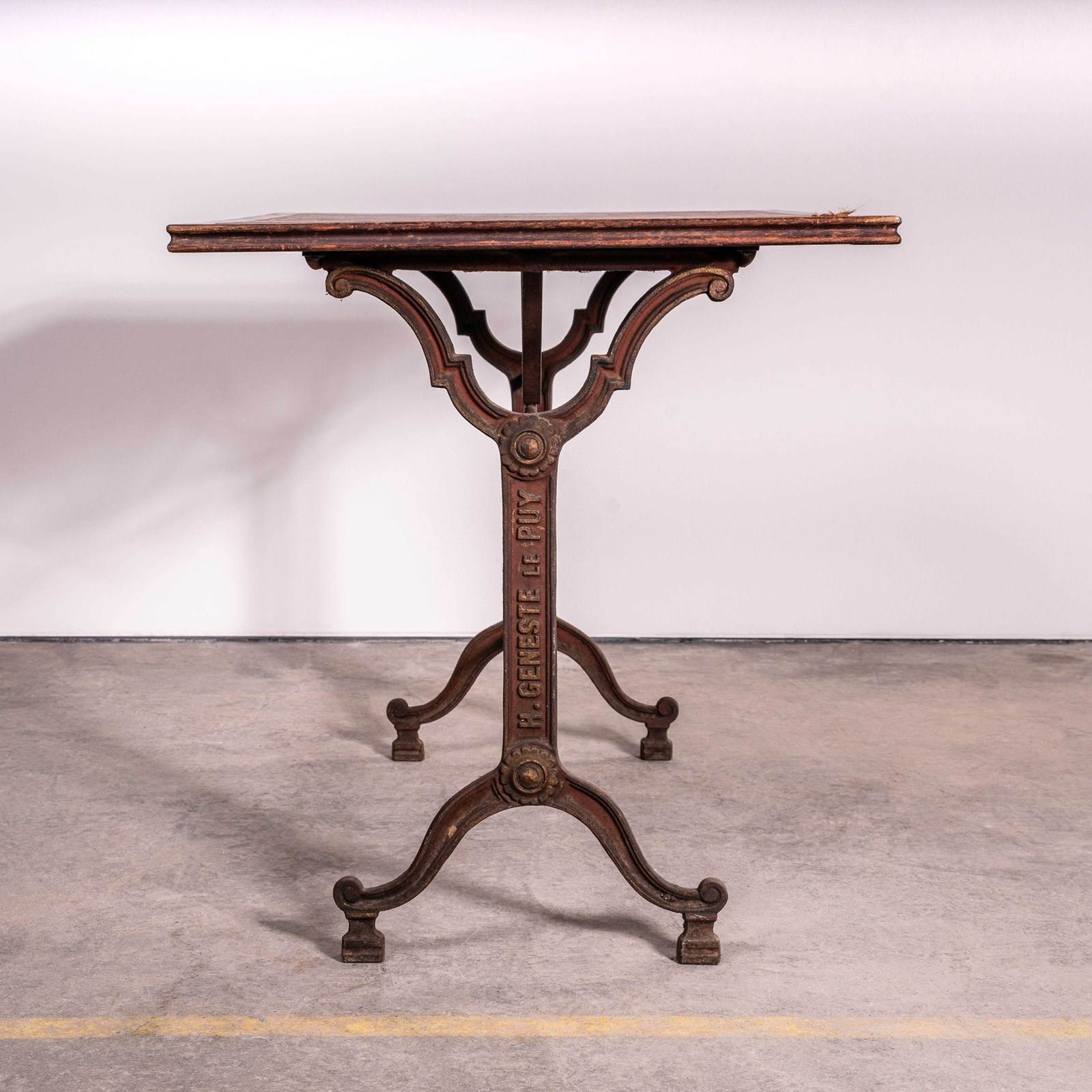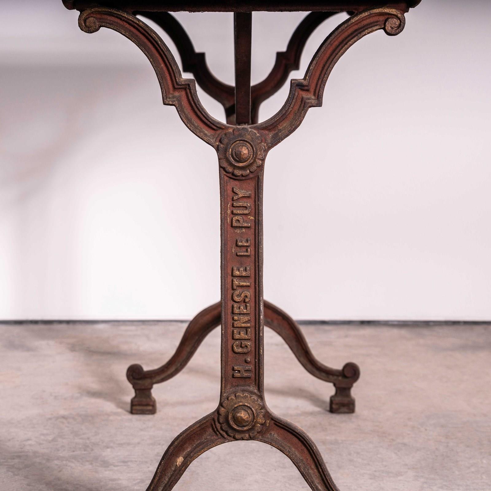 Classic very original French bistro table from the 1920’s by the maker H. Geneste. The base is very well detailed, the top is the original linoleum very well worn showing the textile substrate showing through. Our workshop has cleaned and serviced the table, it is strong and stable and good to go. Knee Clearance: 67cm