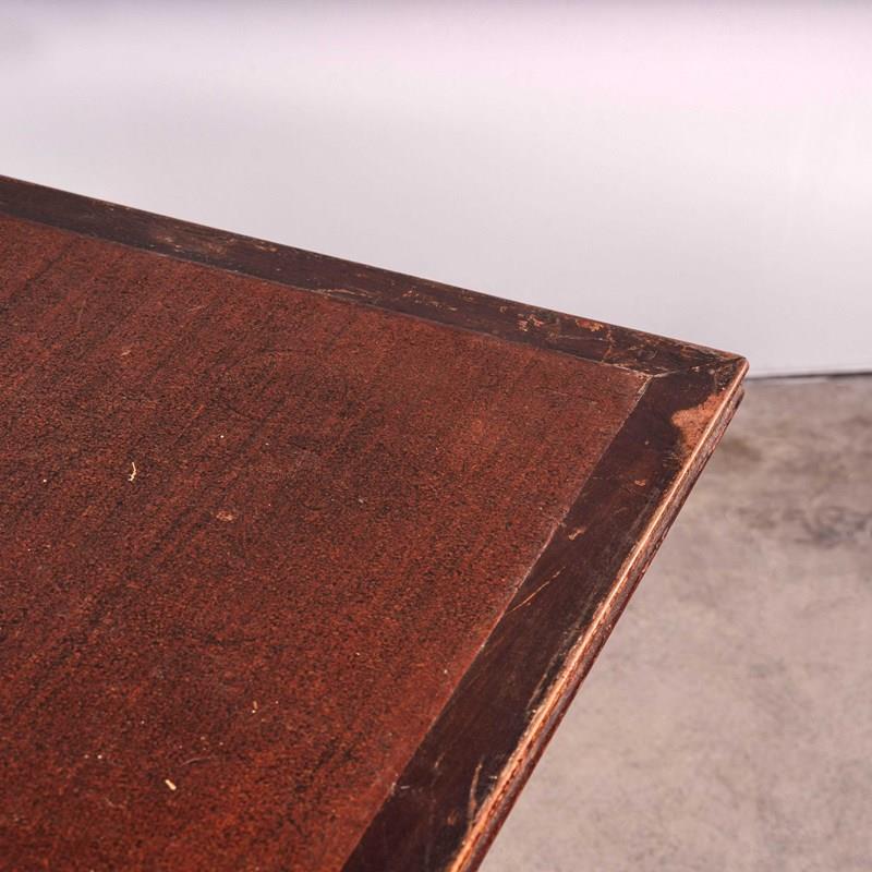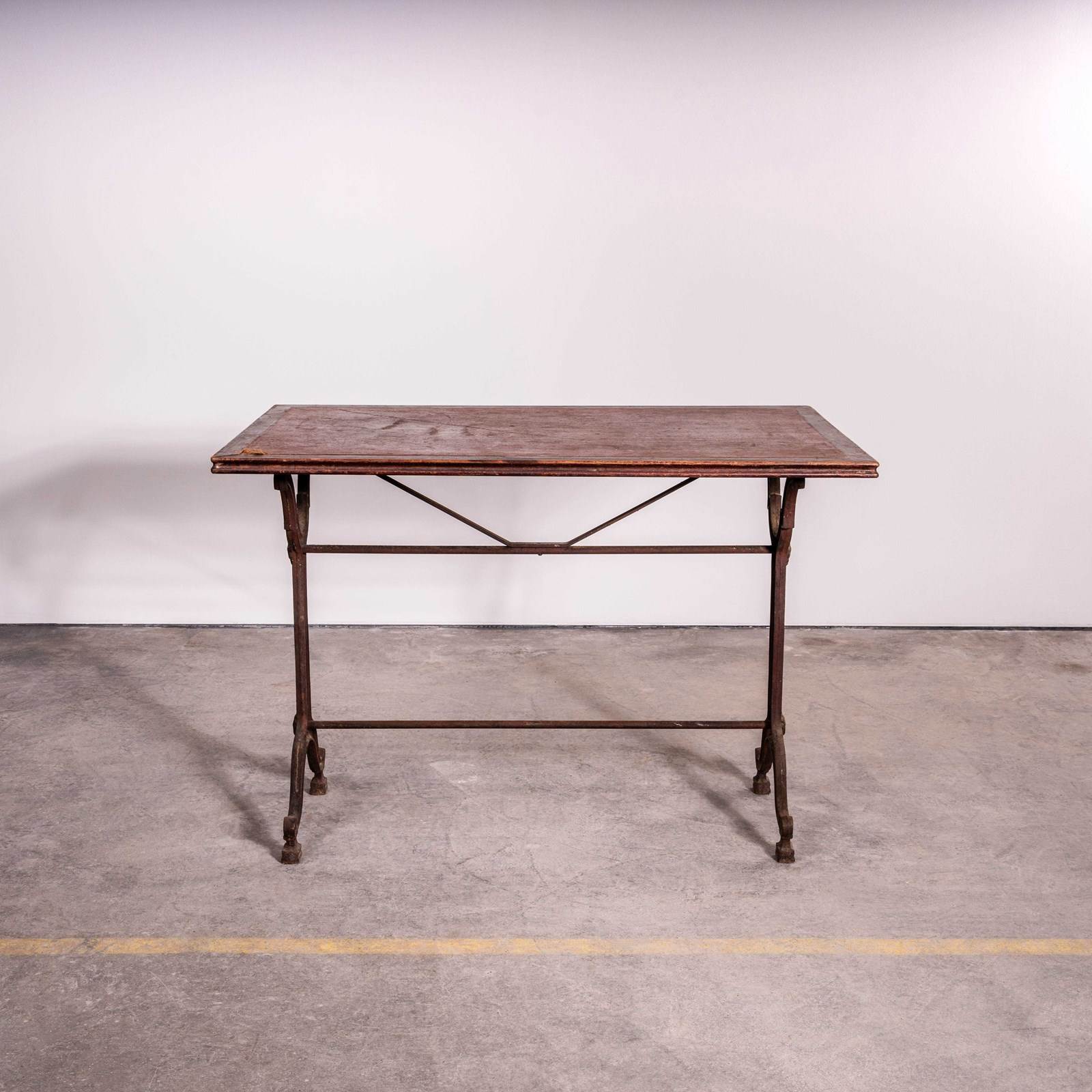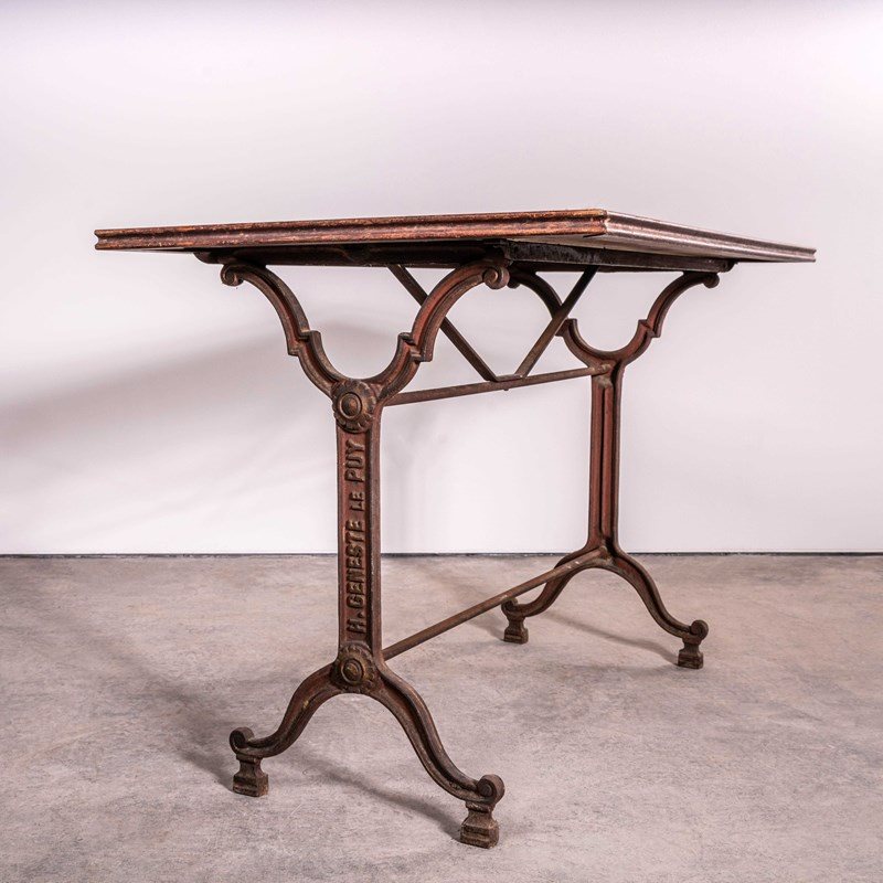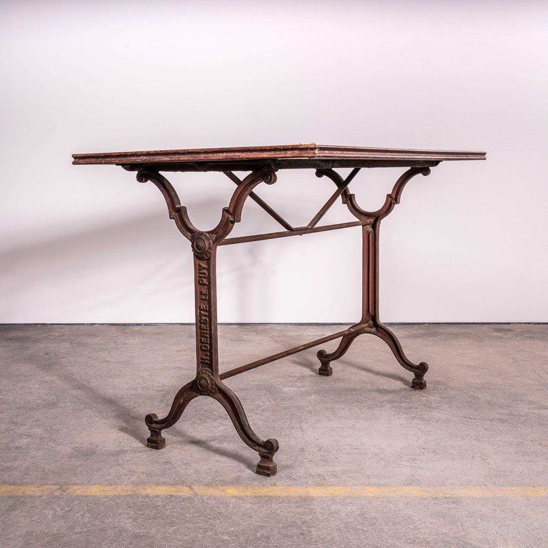 Classic very original French bistro table from the 1920’s by the maker H. Geneste. The base is very well detailed, the top is the original linoleum very well worn showing the textile substrate showing through. Our workshop has cleaned and serviced the table, it is strong and stable and good to go. Knee Clearance: 67cm