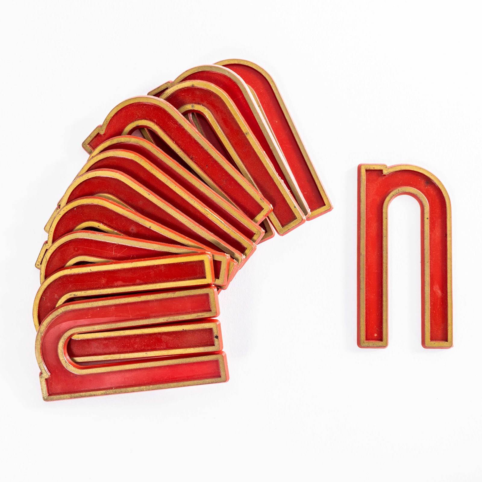 Classic English cinema letters used at cinemas as signage for the film title, actors and so on. Made in acrylic plastic they slotted into tracks on the billboard. The term marquee comes from the French word Marquise, a name given by French soldiers in the 17th Century to a large fabric tent, and then adopted to cover the ‘tent’ like entrance over the entrance to cinemas and theatres. Listing is for one letter as shown. Judging by the condition, these are new old stock or certainly rarely used.
