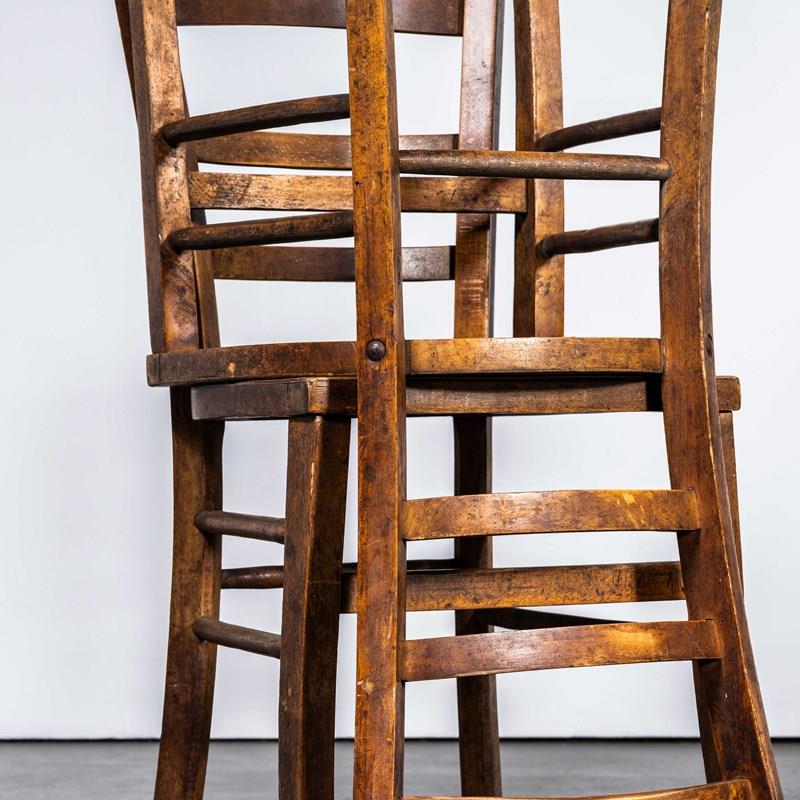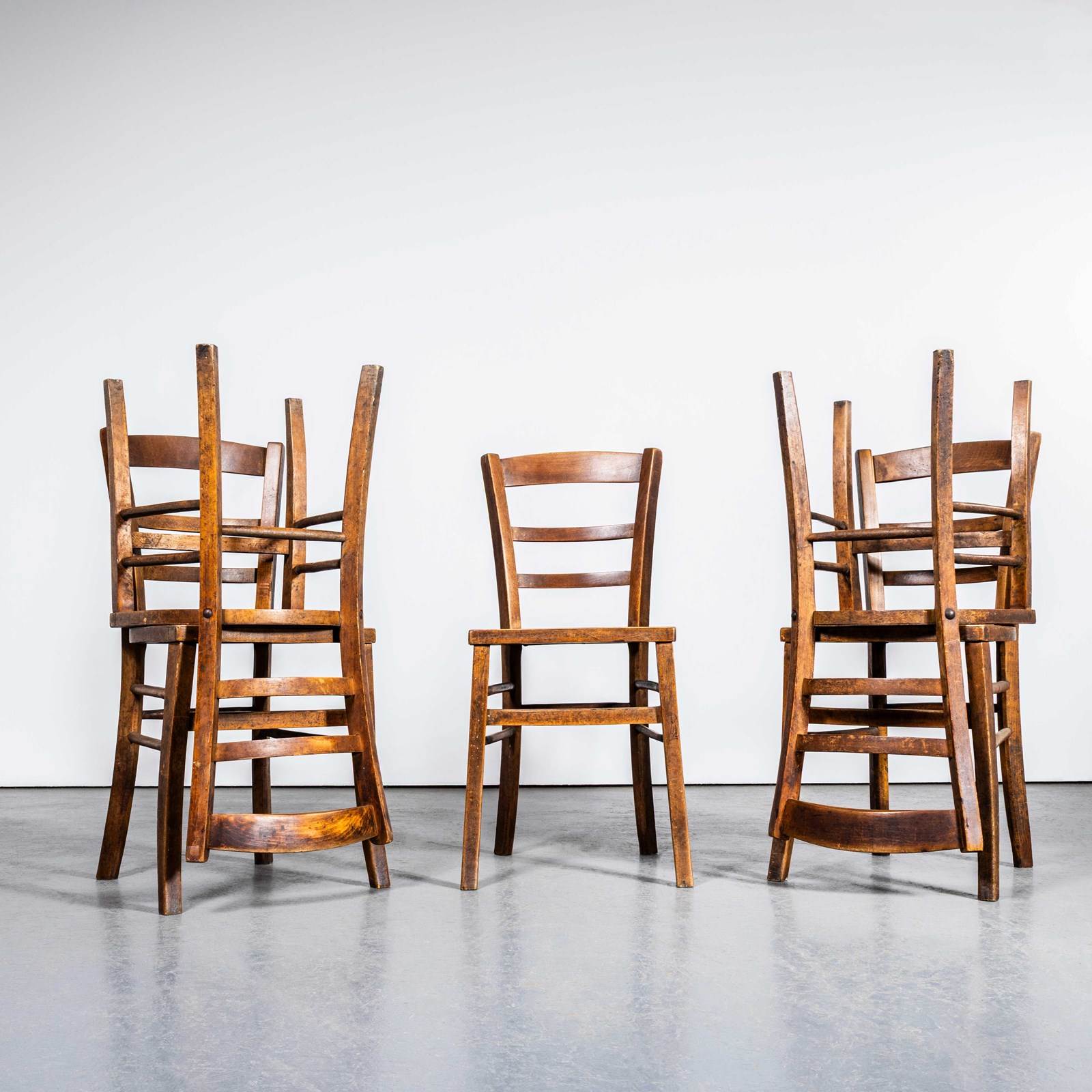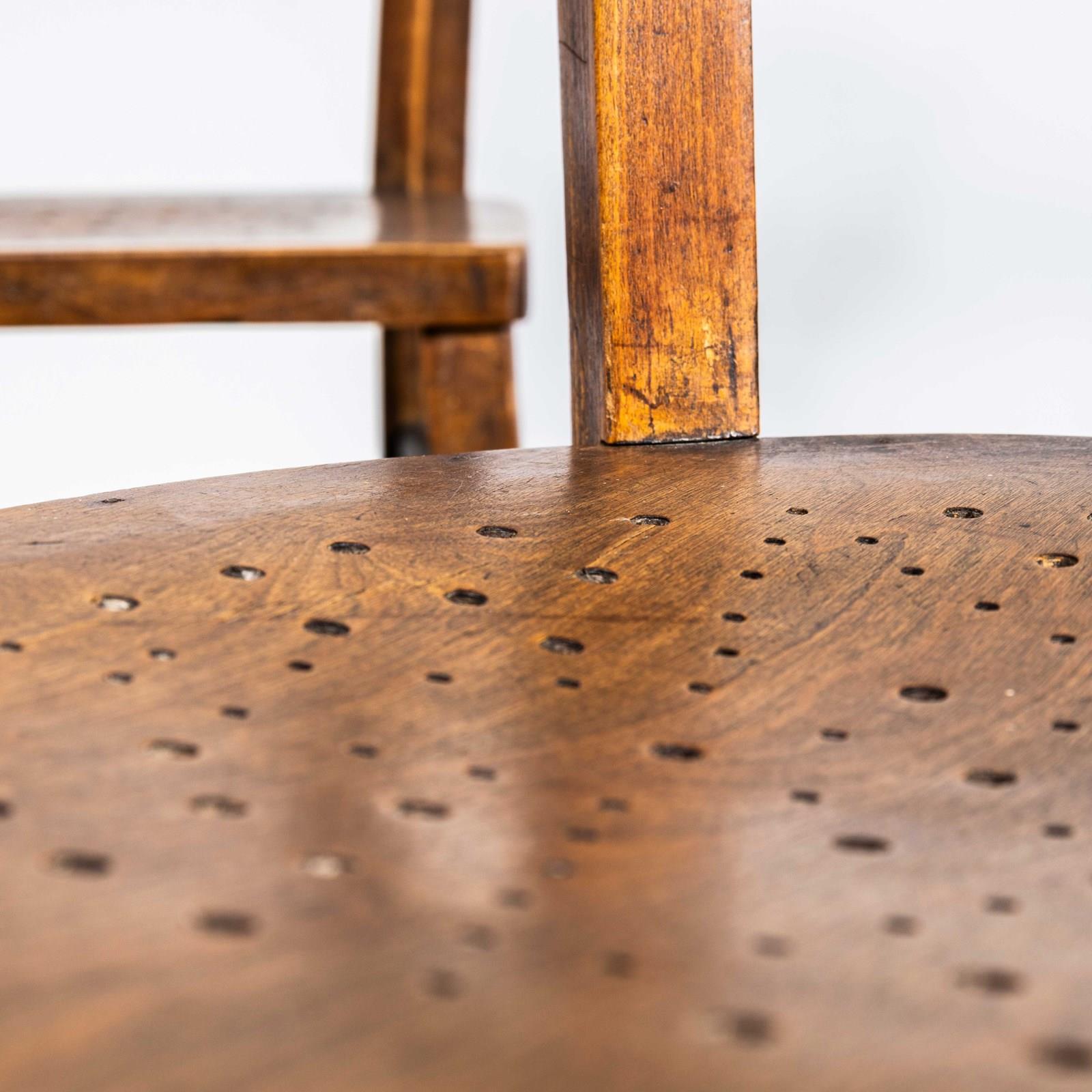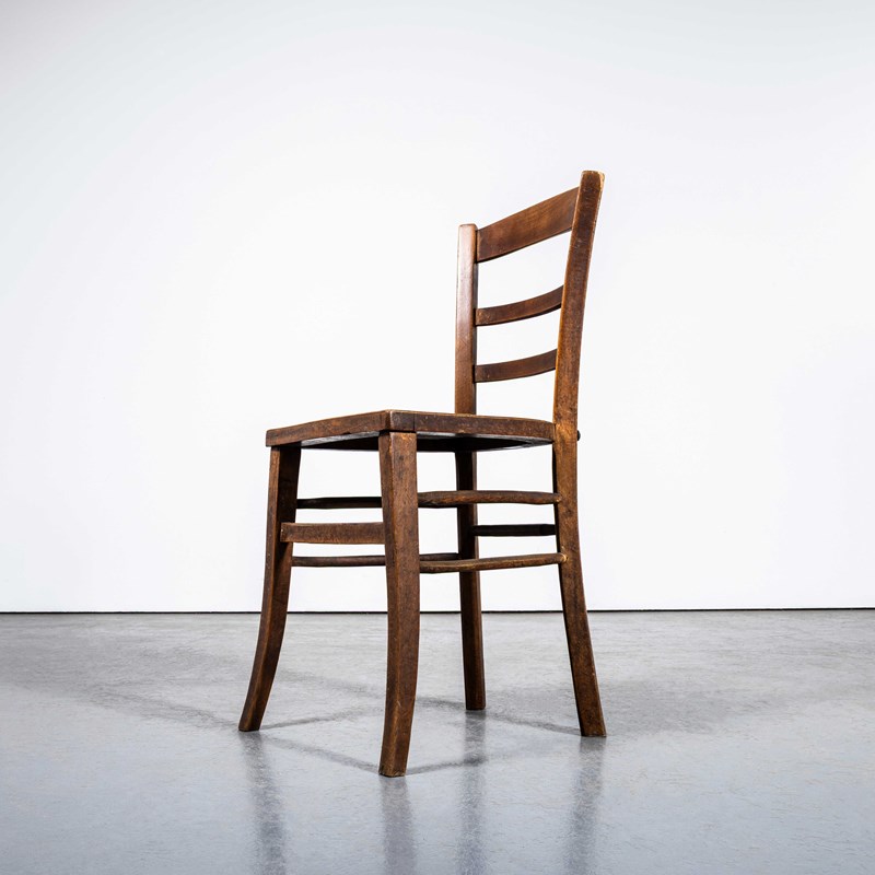 Sourced in the south of France, this is a lovely original and unusual set of chairs, sadly with no makers mark. We haven’t seen this exact shape and perforated seat before so we suspect they were locally made rather than being produced in volume by Baumann or Luterma. A classic farmhouse shape but with a simple ladder back of three slats which is unusual as is the perforated seats. Good original French chairs with a rich darker colour and original character. All our chairs are serviced in our own workshops.