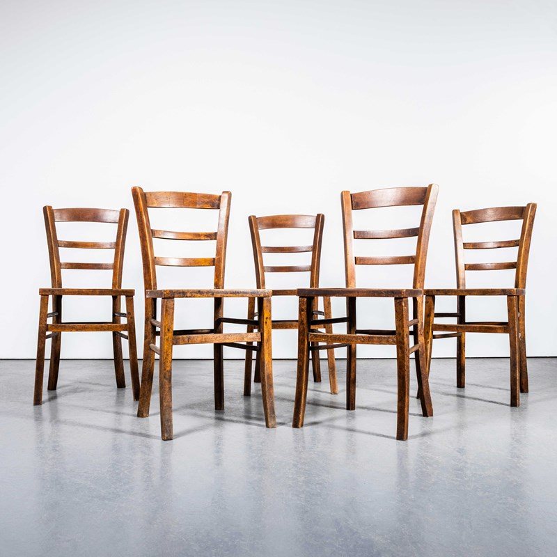 1930’s French Farmhouse Perforated Seat Dining Chairs – Set Of Five.