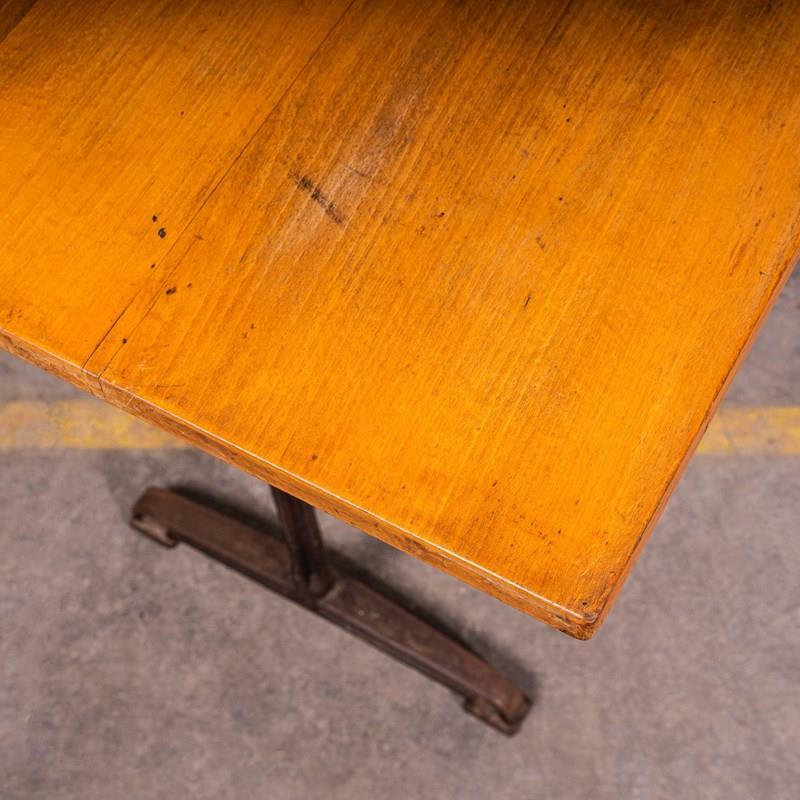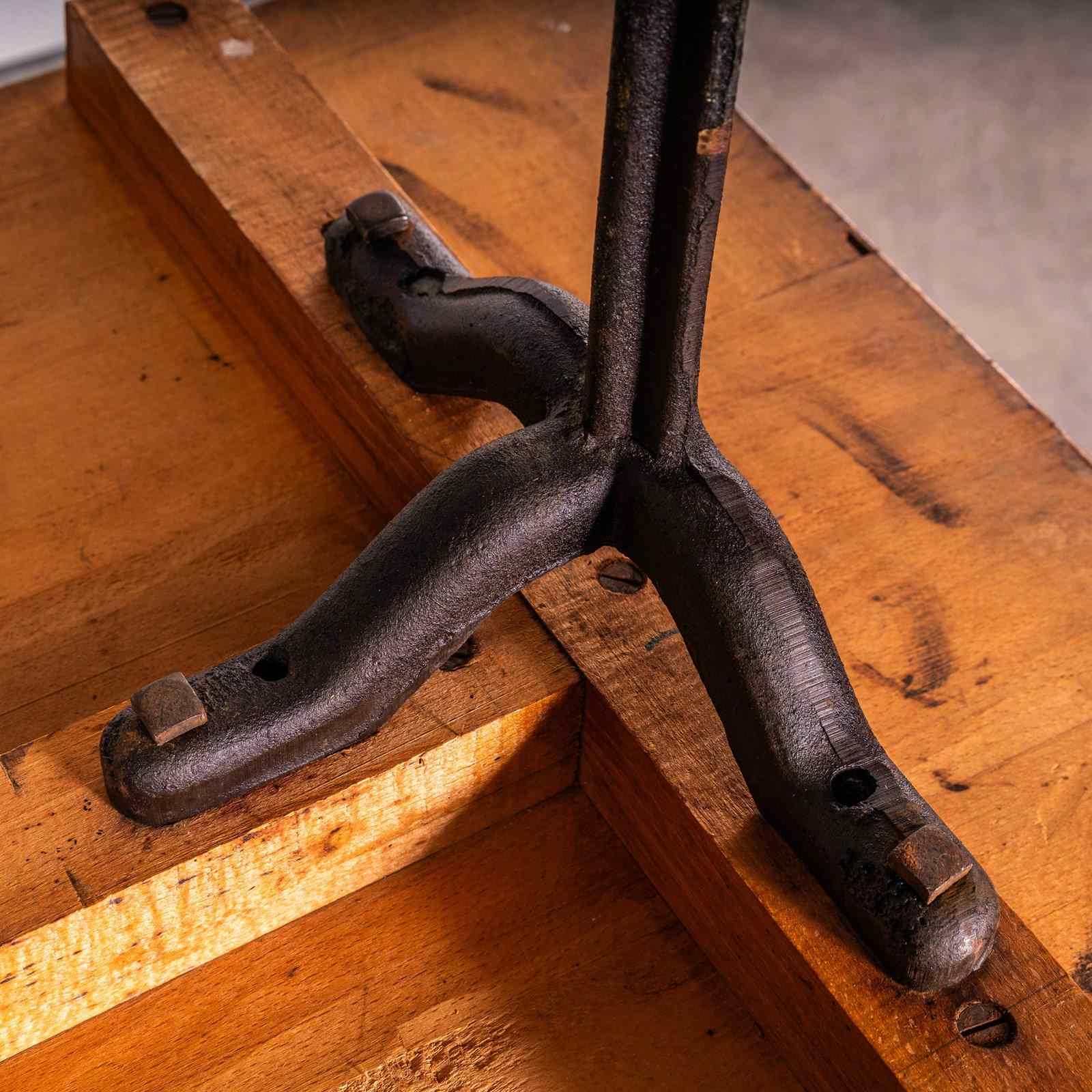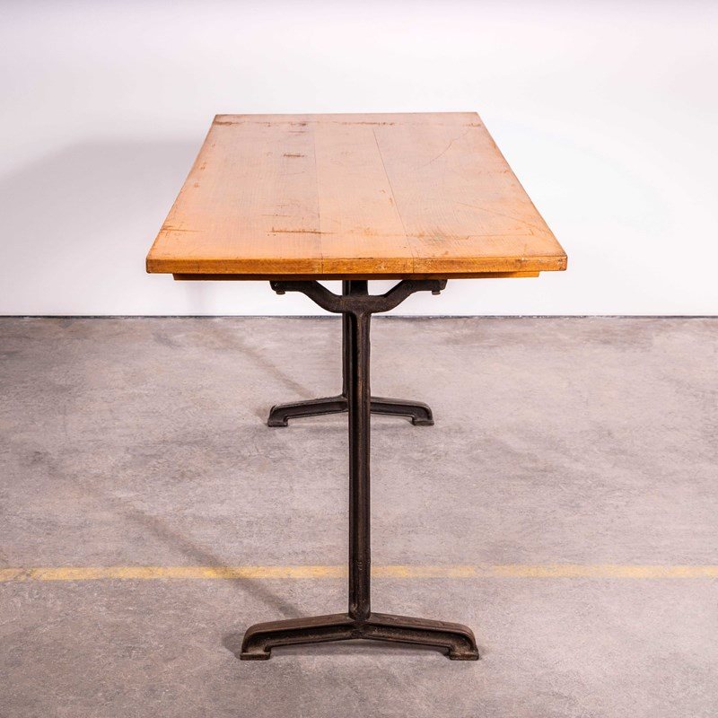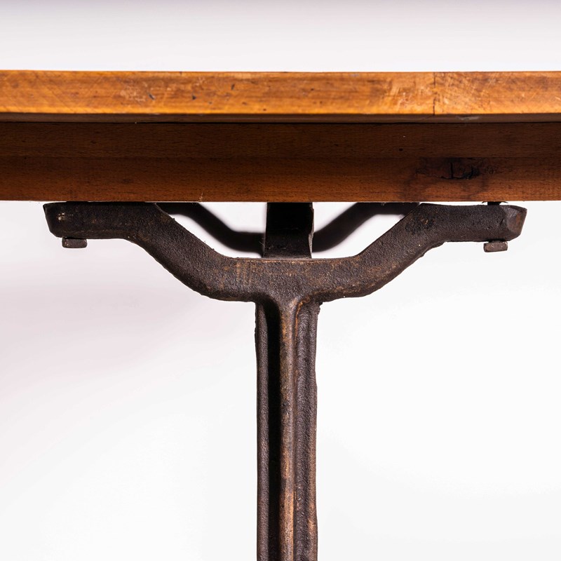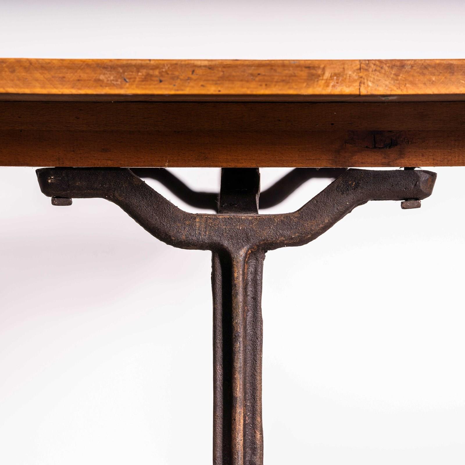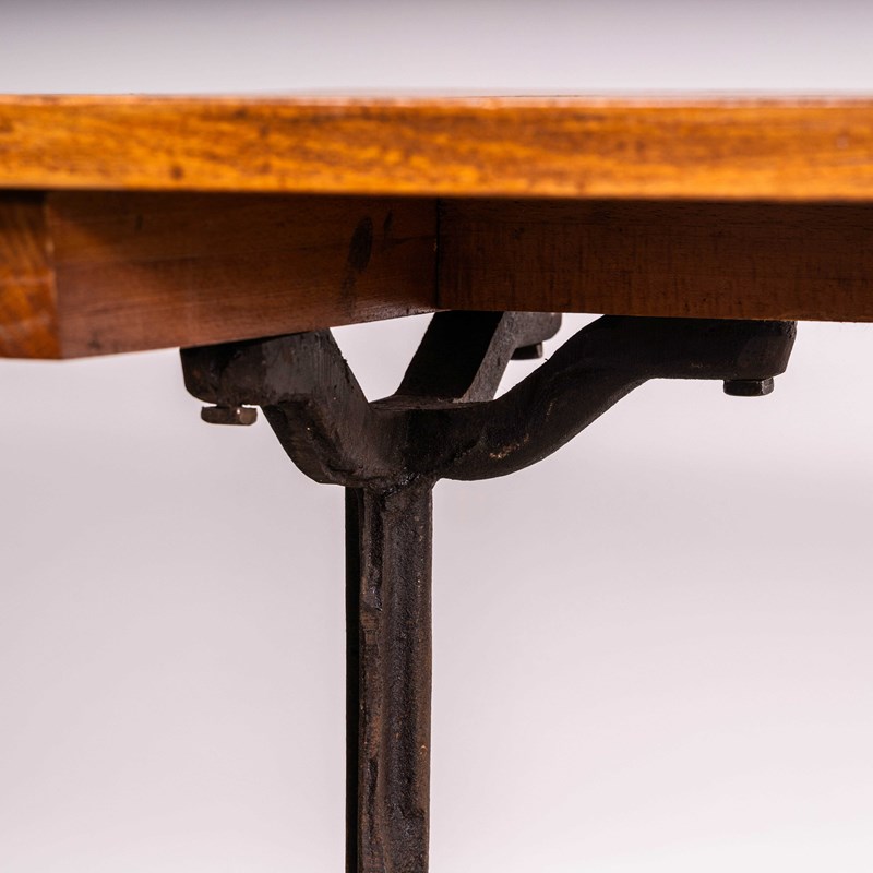 Fischel was founded in 1871 by Czech born David Gabriel Fischel, a successful vegetable oil merchant, using the first hand knowledge of his eldest son who had worked in one of Thonets Czech factories. First production was made in Germany in Niemes near the Danube. Later production moved to France in Alsace and sales offices were opened in most major French cities as Fischel became a major furniture producer. This table dates from the thirties featuring a heavy, solid cast metal base and the original fruitwood top. A beautiful survivor in original condition throughout, a practical table. Knee Clearance: 73cm