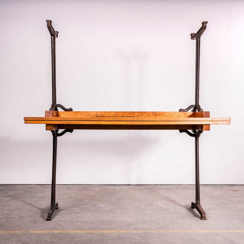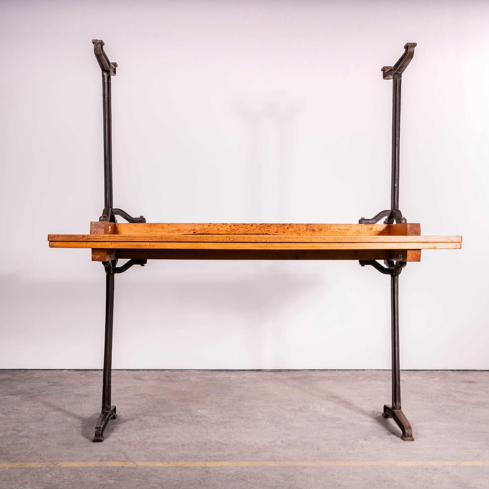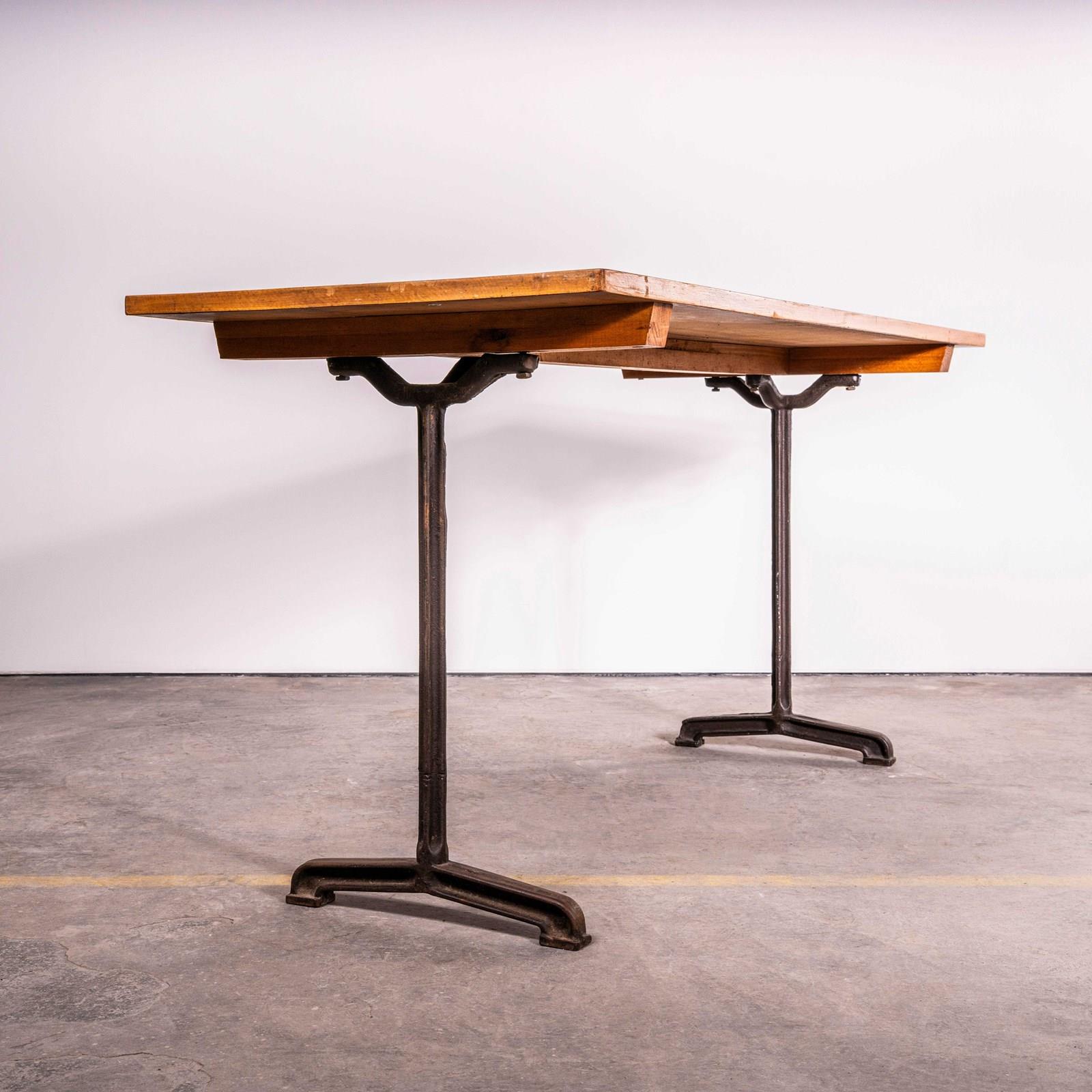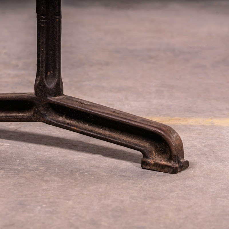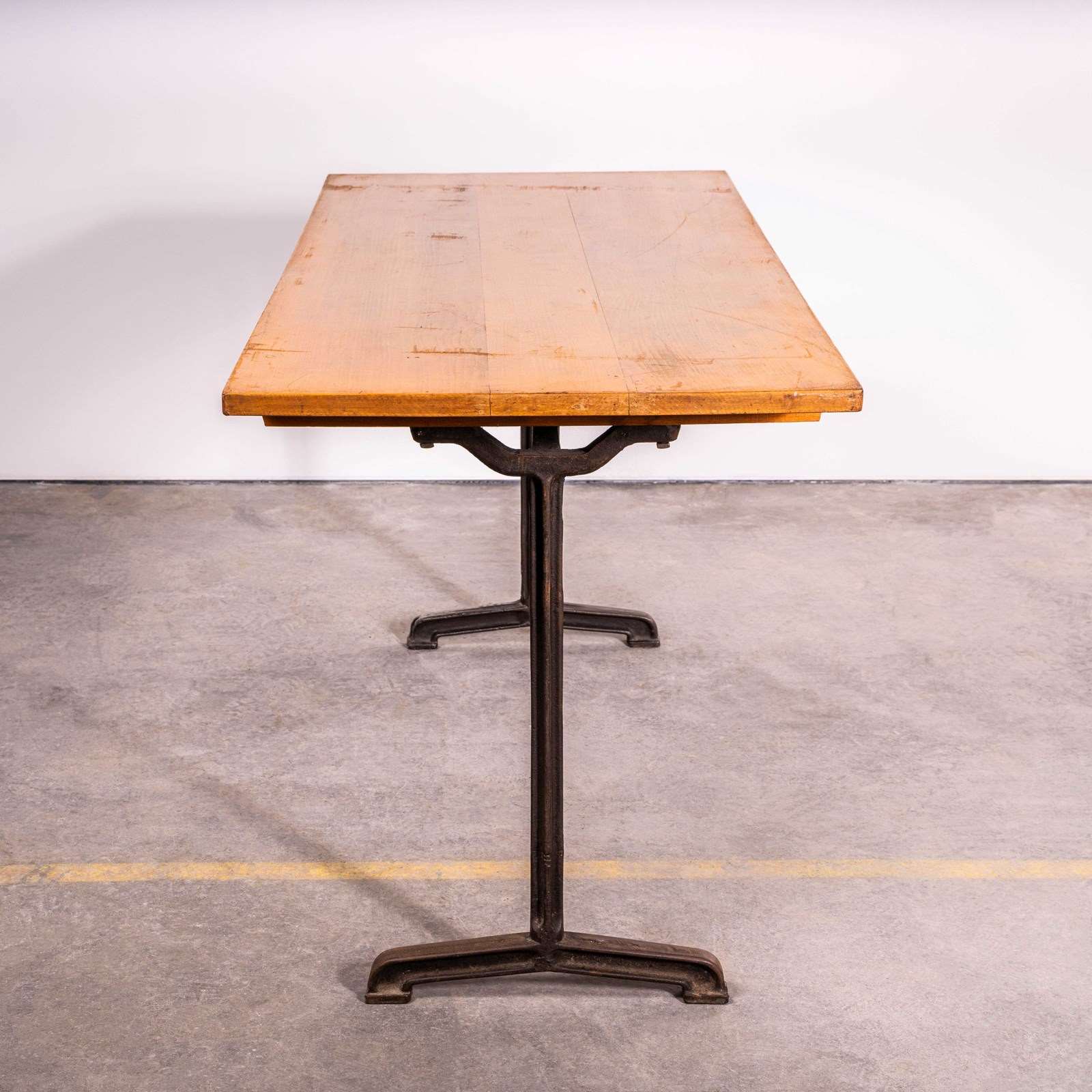 Fischel was founded in 1871 by Czech born David Gabriel Fischel, a successful vegetable oil merchant, using the first hand knowledge of his eldest son who had worked in one of Thonets Czech factories. First production was made in Germany in Niemes near the Danube. Later production moved to France in Alsace and sales offices were opened in most major French cities as Fischel became a major furniture producer. This table dates from the thirties featuring a heavy, solid cast metal base and the original fruitwood top. A beautiful survivor in original condition throughout, a practical table. Knee Clearance: 73cm