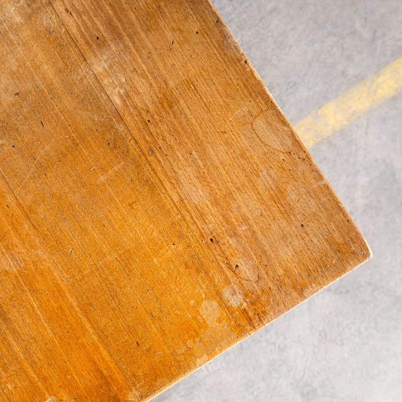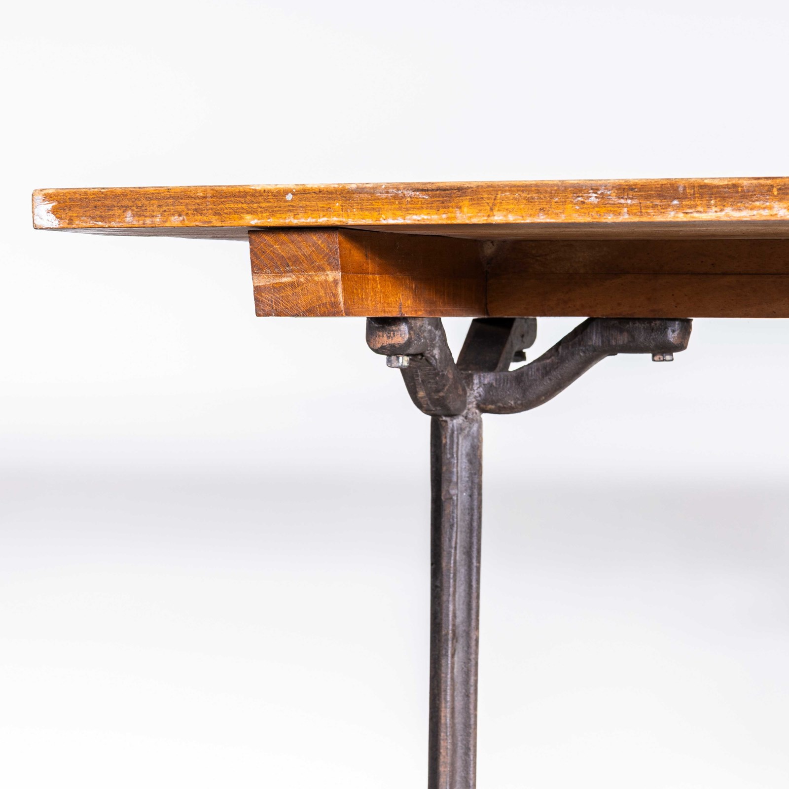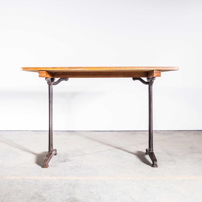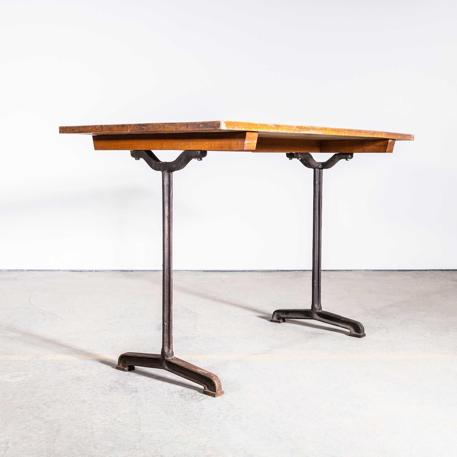 Fischel was founded in 1871 by Czech born David Gabriel Fischel, a successful vegetable oil merchant, using the first hand knowledge of his eldest son who had worked in one of Thonets Czech factories. First production was made in Germany in Niemes near the Danube. Later production moved to France in Alsace and sales offices were opened in most major French cities as Fischel became a major furniture producer. This table dates from the thirties featuring a heavy, solid cast metal base and the original fruitwood top. A beautiful survivor in original condition throughout, a practical table. Knee Clearance: 72cm