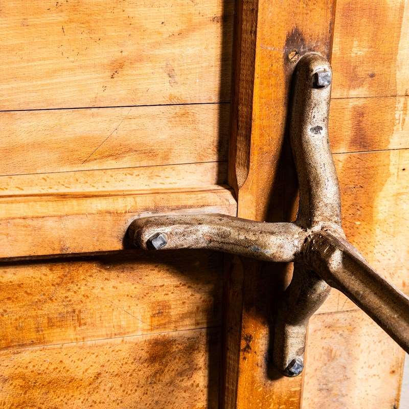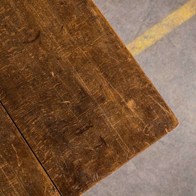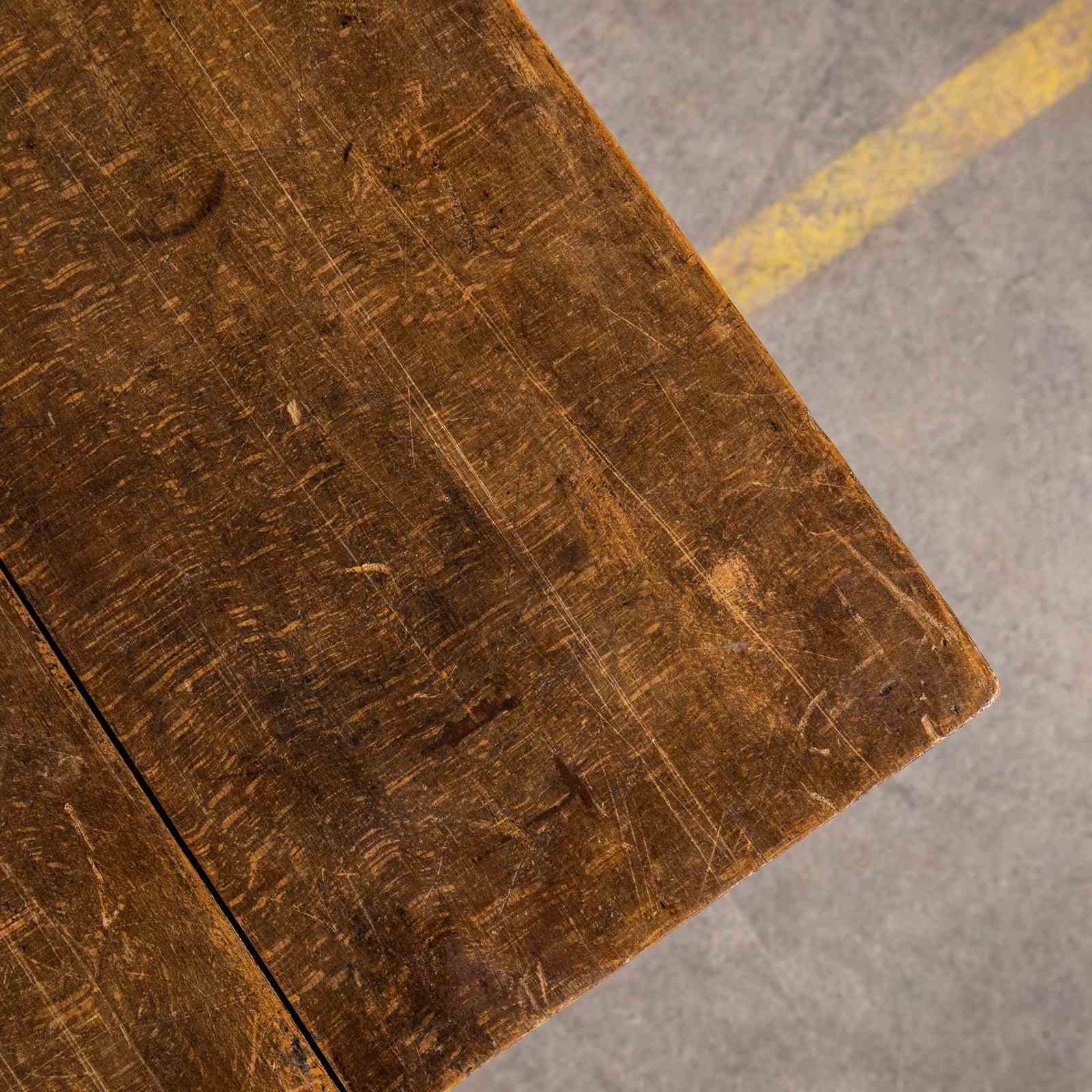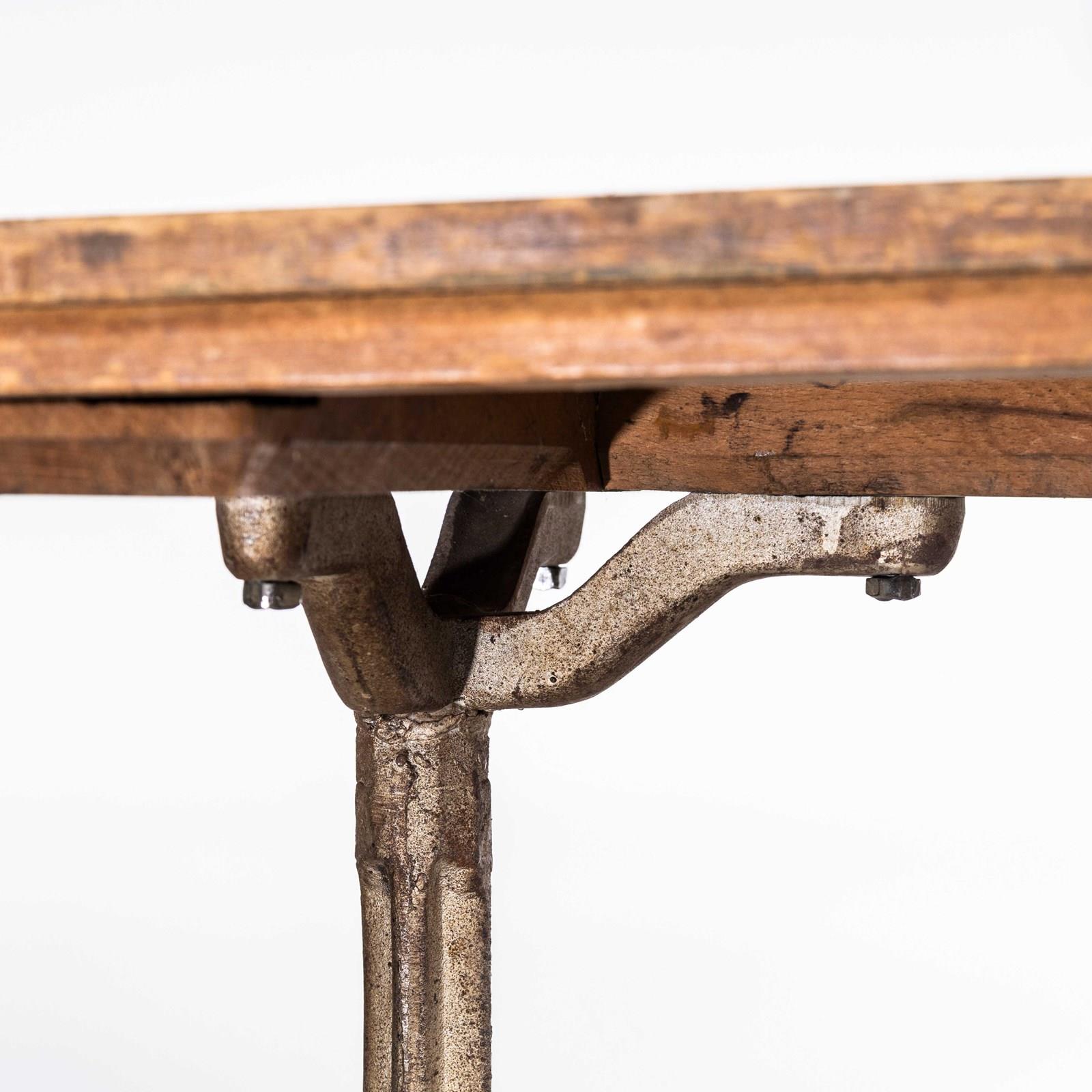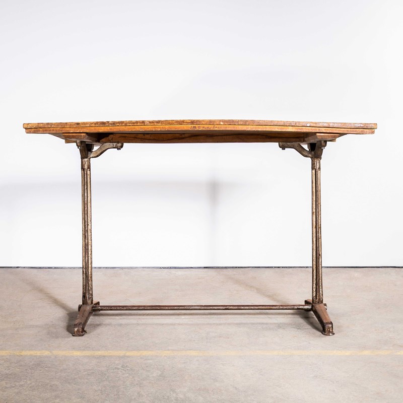 Fischel was founded in 1871 by Czech born David Gabriel Fischel, a successful vegetable oil merchant, using the first hand knowledge of his eldest son who had worked in one of Thonets Czech factories. First production was made in Germany in Niemes near the Danube. Later production moved to France in Alsace and sales offices were opened in most major French cities as Fischel became a major furniture producer. This table dates from the thirties featuring a heavy, solid cast metal base and the original rich coloured oak top. A beautiful survivor in original condition throughout, a practical table. Knee clearance 72cm.