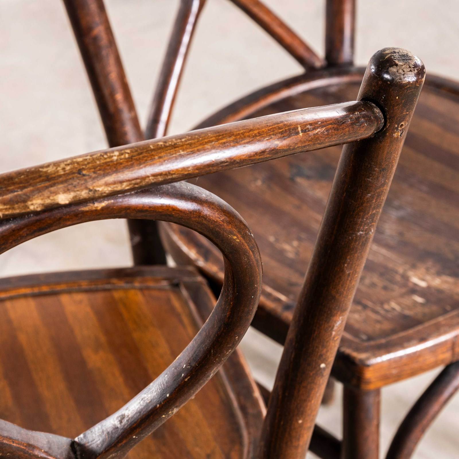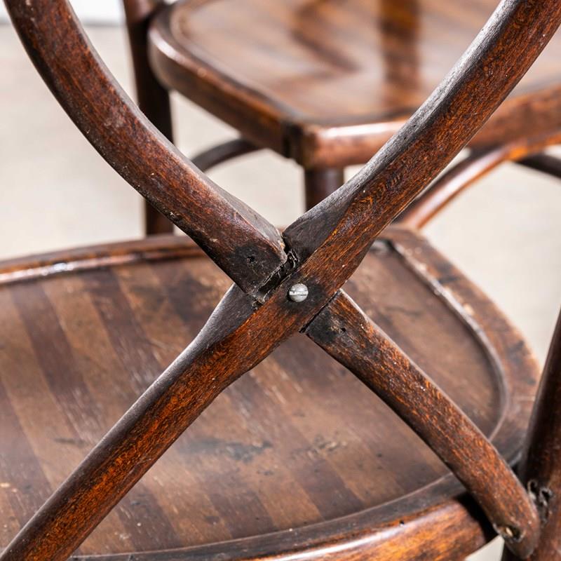 The story of GYF is a bit sketchy but we know GYF produced very few models and this was their main chair, components were bought partly from Luterma (Estonia) but assembled, finished and branded in France GYF at the GYF factory Givry Fourchamboult (Nievre). The process of steam bending beech to create elegant chairs was discovered and developed by Thonet, but when its patents expired in 1869 many companies including Luterma launched production. Luterma was one of the brands marketed by Estonian factory A.M. Luther which was founded in the late 19th Century in Tallinn. Luthers production was principally in Estonia but they also had factories in France for local market production. At the time of the Bauhaus movement Walter Gropius and Marcel Breuer worked with the factory to develop various models. These chairs date from the 1940’s, a simple classic shape with a beautiful rich colour and elegant grill shaped backs and seats. We service and rejuvenate each chair before it leaves our workshop and we deliver chairs of excellent quality.