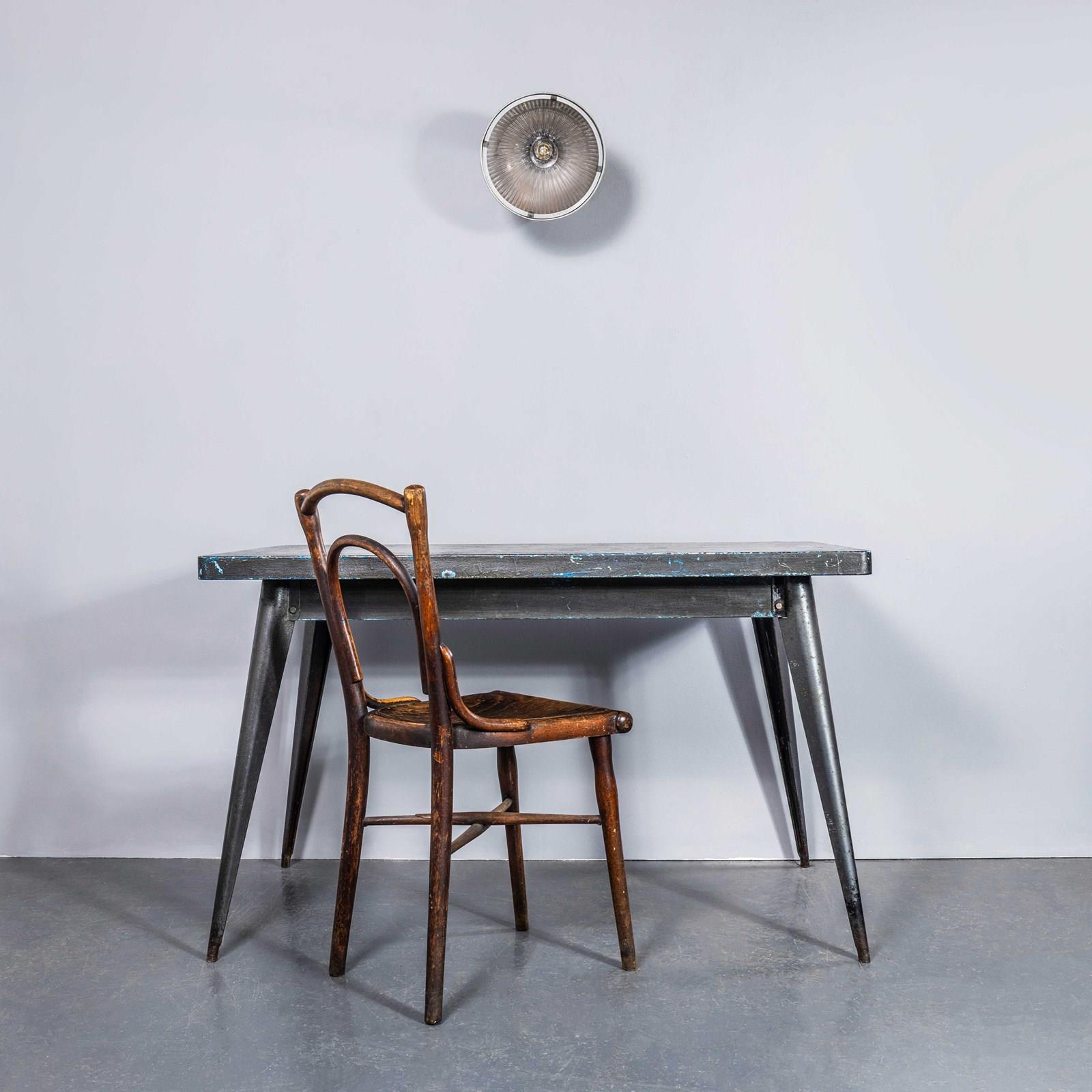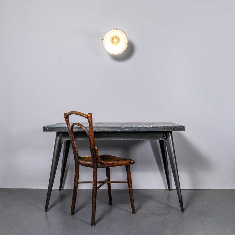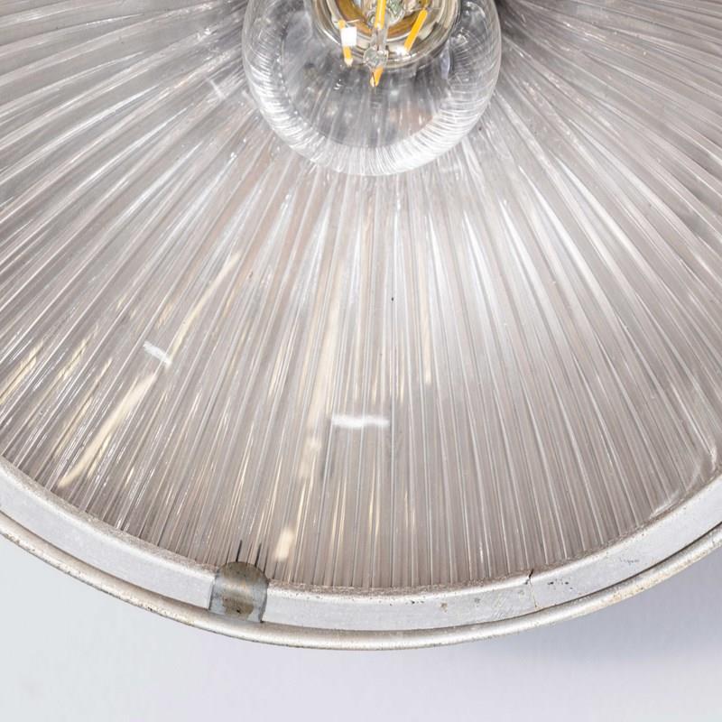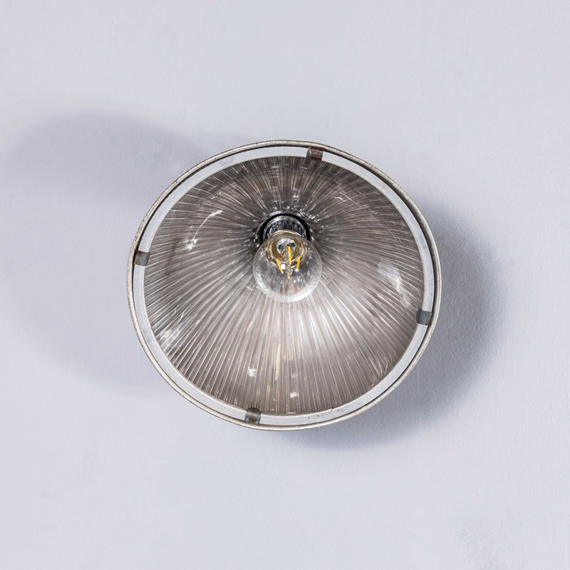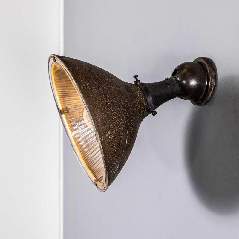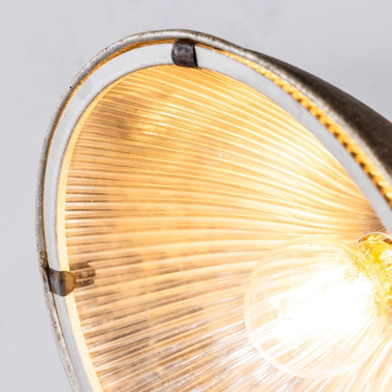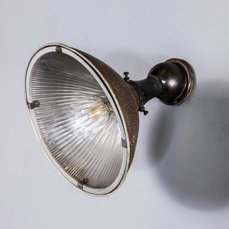 Holophane was founded in France in the late 19th Century and they are famous for their inventing and perfecting borosilicate glass reflectors often with intricate cast glass patterns which give a diffused and beautiful light. This is a simple adjustable Holophane task lamp that can be put on the ceiling or wall. The lamp has been cleaned and restored and tested and labelled to BS EN 60598. The lamp comes completely wired and ready to install, due to the nature of the lamp holder design we have left the original lamp holder which is in excellent condition. The lamp is fitted with a standard E27 threaded lamp holder for which a wide range of modern and vintage style filament bulbs are widely available. We do not currently sell bulbs and recommend LED bulbs 6W maximum. The lamp is currently wired and fitted for UK and EU compliance. The lamp can be wired for compliance in the US or any global market.