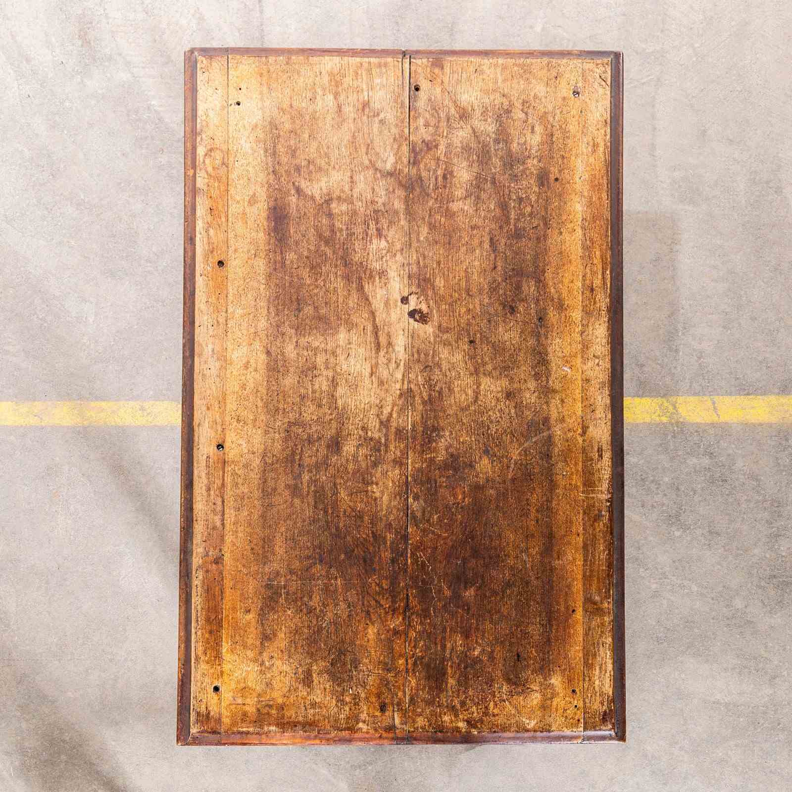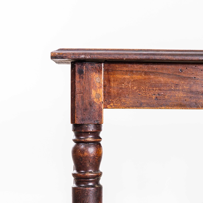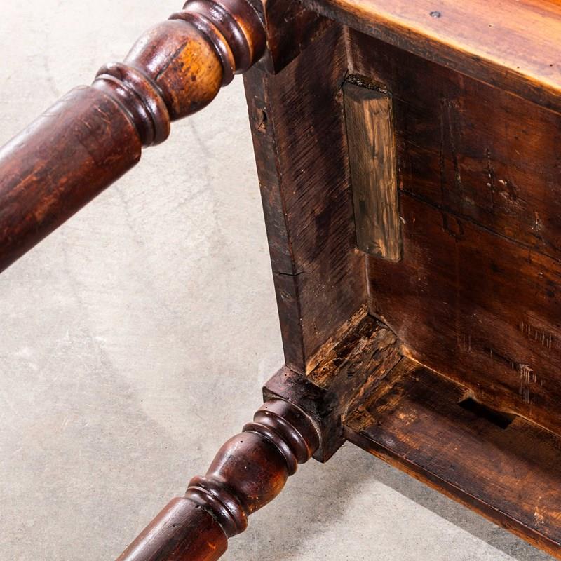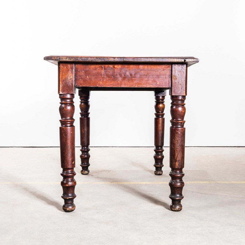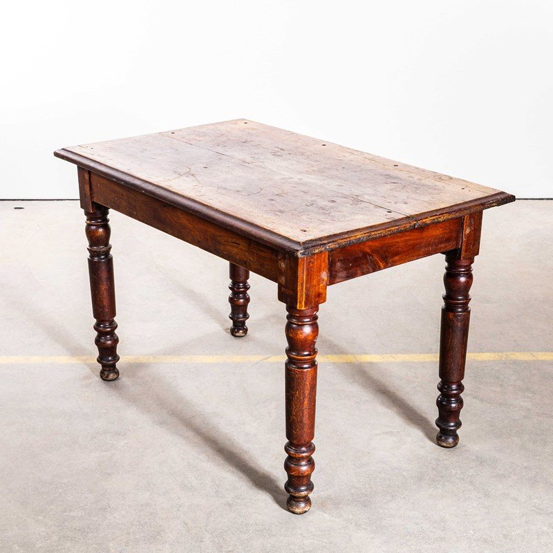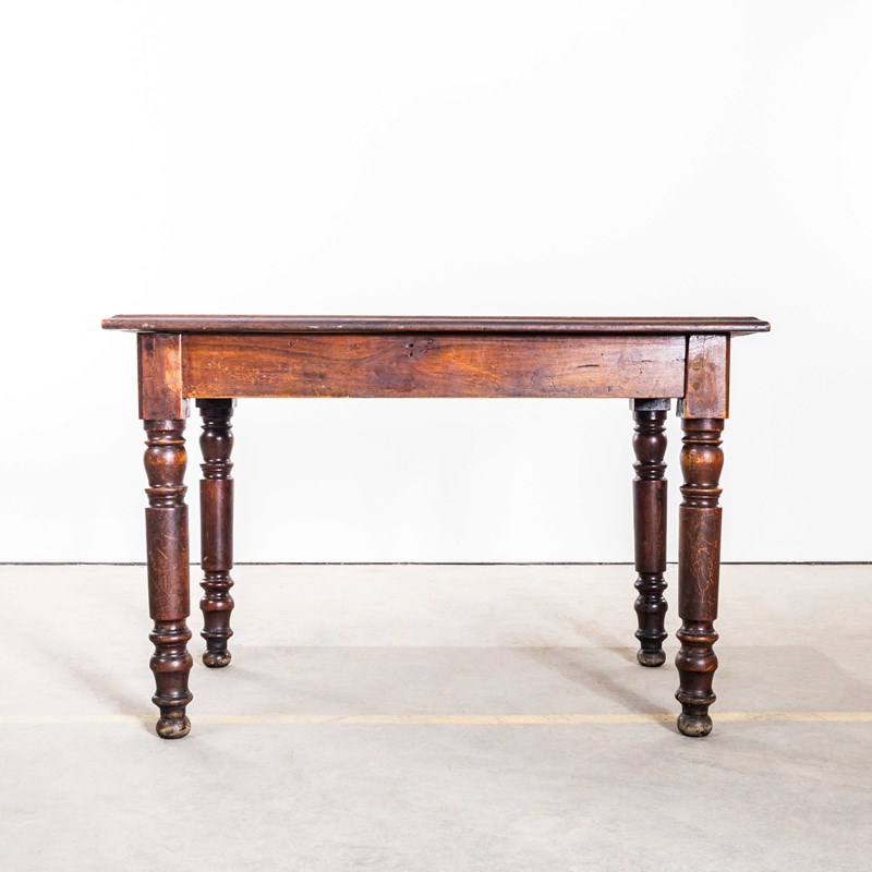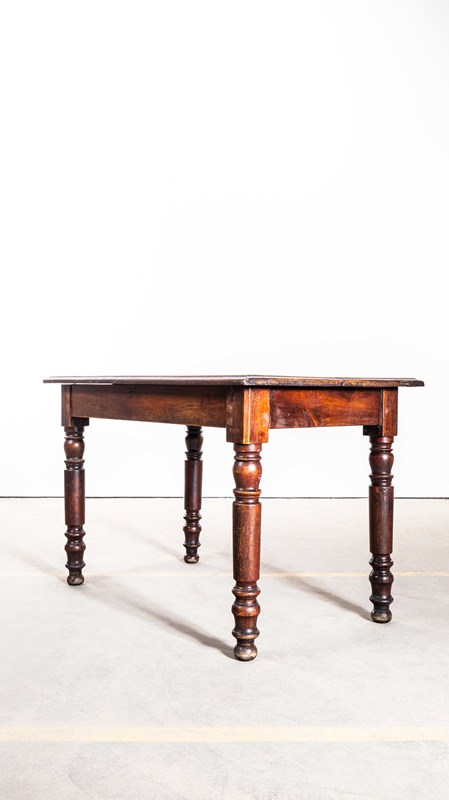 Practical sized original French table with a planked character fruitwood top and turned bobbin legs. Beautifully made with a dark oak colour, the table is made with doweled joints and good construction. Our workshop has serviced the table, it is strong and stable waxed and ready to go.