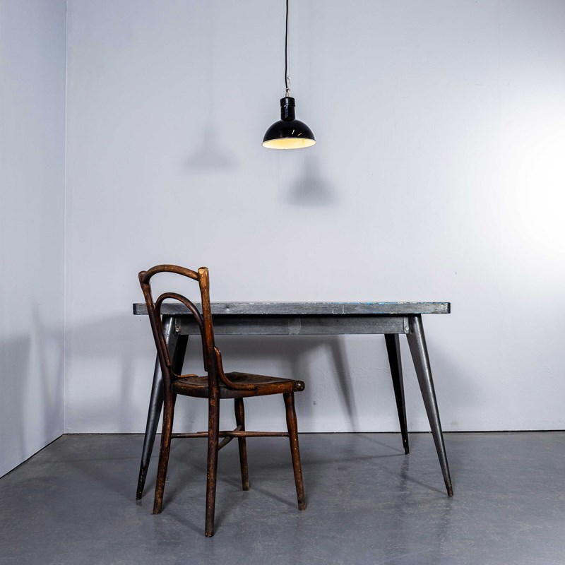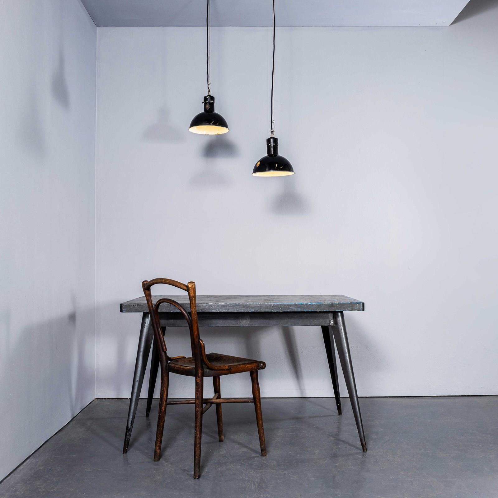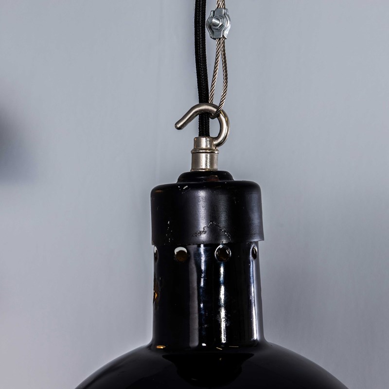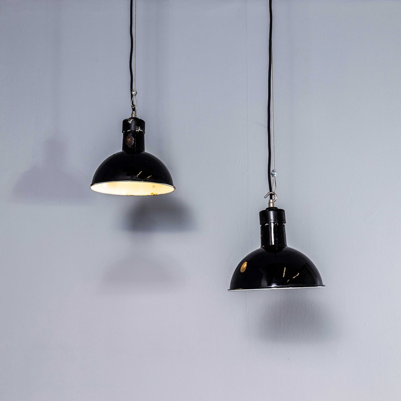 Good early GEC enamelled pendant lamps. GEC, or The General Electric Company, had a significant history in the development of lighting in Britain. Founded in 1886, it was a major electrical component manufacturer and a large supplier of lighting for various applications, including industrial, commercial, and even street lighting. Made from spun and enamelled steel with simple domed tops. The lamps were covered in paint, grease and dirt which was removed to reveal lamps in exceptional original condition. Each lamp has been cleaned and restored and all electrical components have been removed and replaced with modern European CE standard components to BS EN 60598. Each lamp is individually tested and labelled to BS EN 60598. INCLUDED: Each lamp comes completely wired and ready to install including; 2 metres of black silk covered electrical cable and a ceiling rose as shown. The lamp is fitted with a standard E27 threaded lamp holder for which a wide range of modern and vintage style filament bulbs are widely available. We do not currently sell bulbs and recommend LED bulbs 6W maximum. Additional special order colours are available and we can also supply more than 2 metres of hanging cable/wire/chain etc as required, please contact us separately to discuss. We are specialists in refurbishment of vintage lighting, please contact us with any questions regarding purchase or installation. The lamp is currently wired and fitted for UK and EU compliance. The lamp can be wired for compliance in the US or any global market.