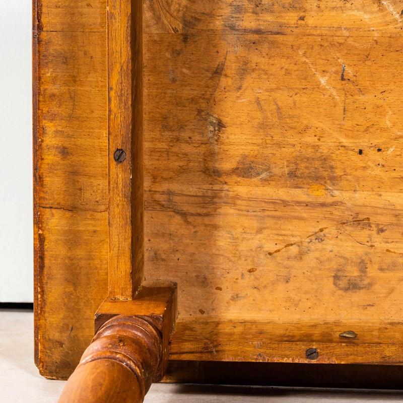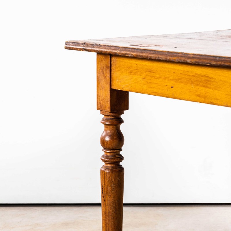 Practical sized original French table with a planked character fruitwood top and turned bobbin legs. Beautifully made with a rich honey colour, the table is made with doweled joints and good construction. Our workshop has serviced the table, it is strong and stable waxed and ready to go. Knee clearance - 60 cm.