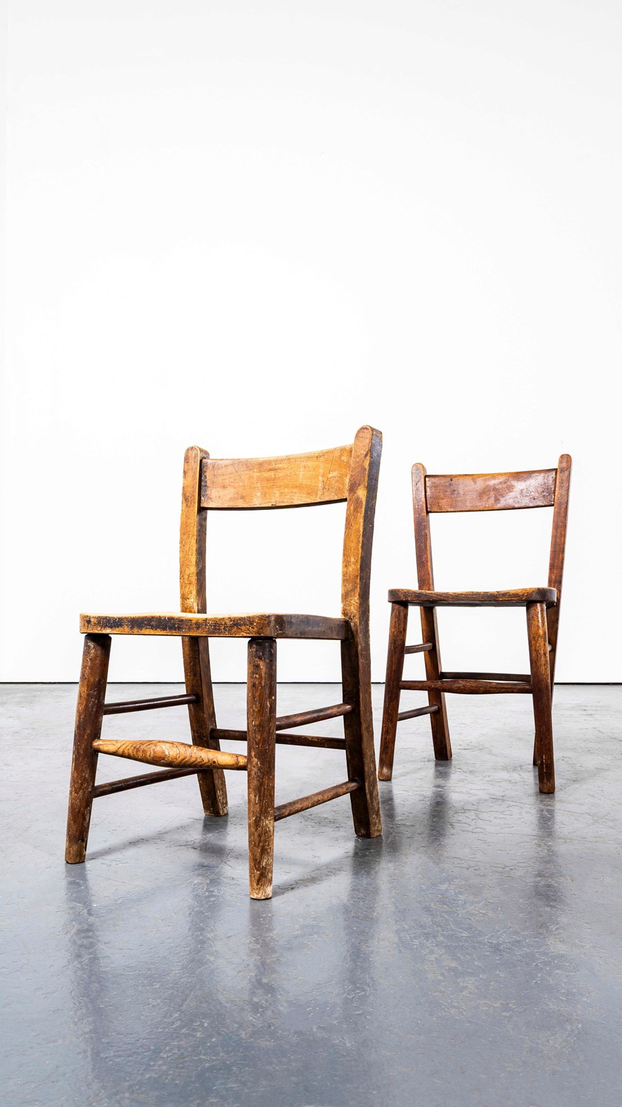 England has a wonderfully rich heritage for making chairs. At the height of production at the turn of the last century over 4500 chairs were being produced daily in the villages around High Wycombe. Each chair was hand made typically in Oak or Elm. Sadly Churches find non stacking chairs take up too much space so they find their way to us to for a second rich life. We came across this batch of rare beautiful single low children’s chairs, all differ slightly in design but together they look amazing. We service and wax each chair individually before they leave our workshop to deliver chairs of excellent quality. You will receive a random style as photographed.