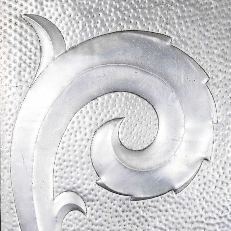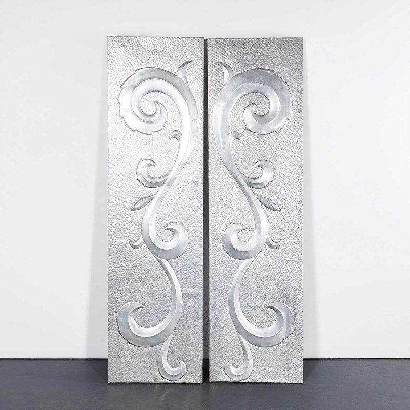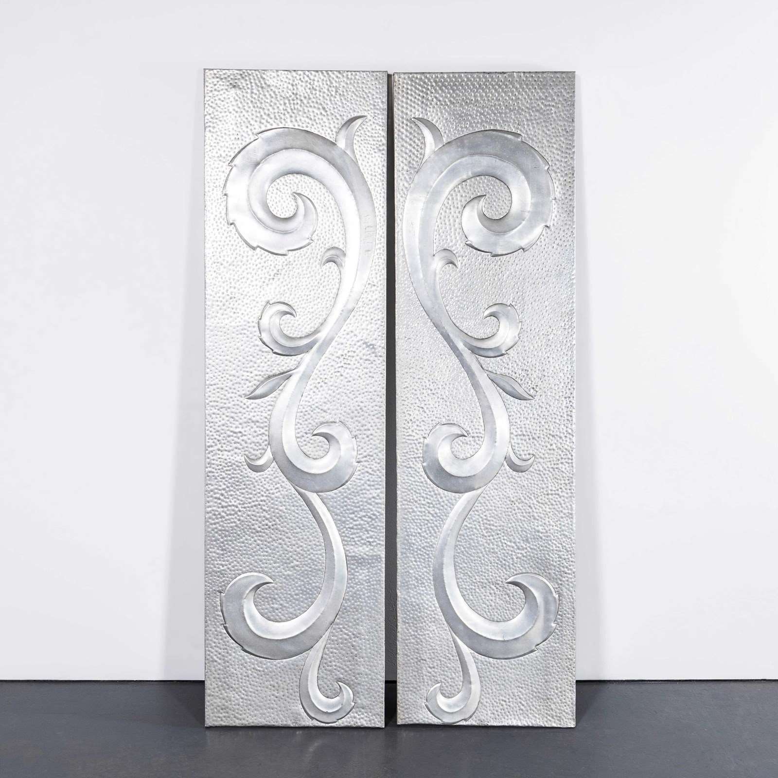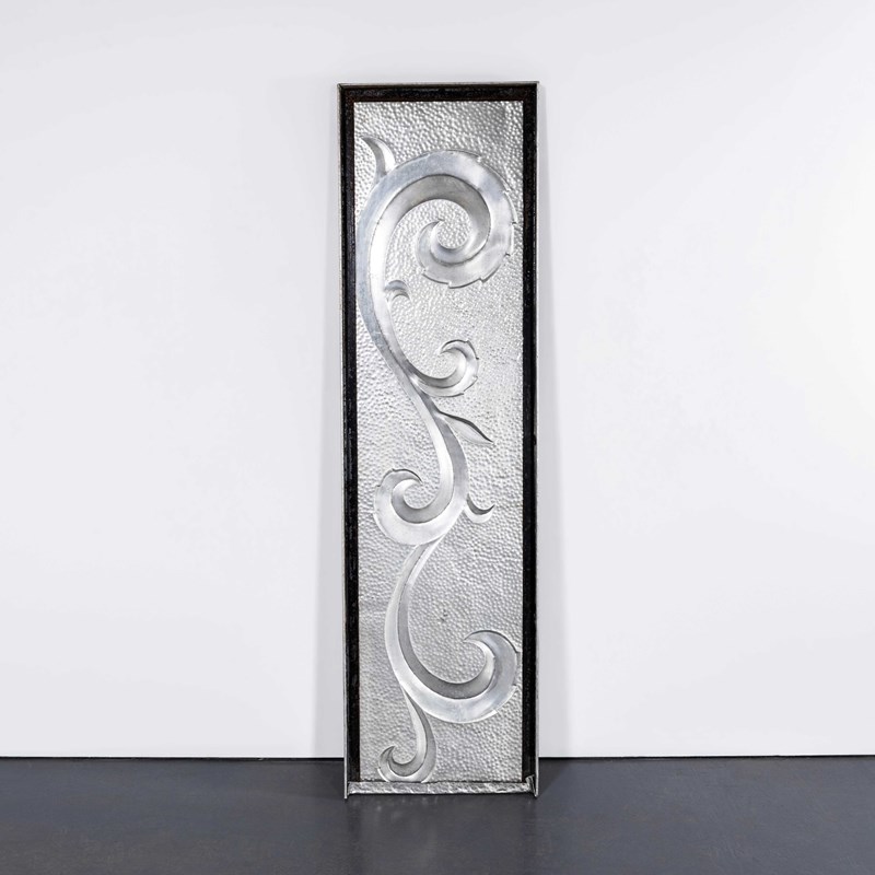 Sourced from a factory boardroom in Latvia, the panels were used as decoration in the factory boardroom. The factory produced electronic components and the panels were likely made in house. The panels are made of sheet aluminium hand punched and decorated and hung on steel frames. The panels can be wall mounted or displayed as photographed.