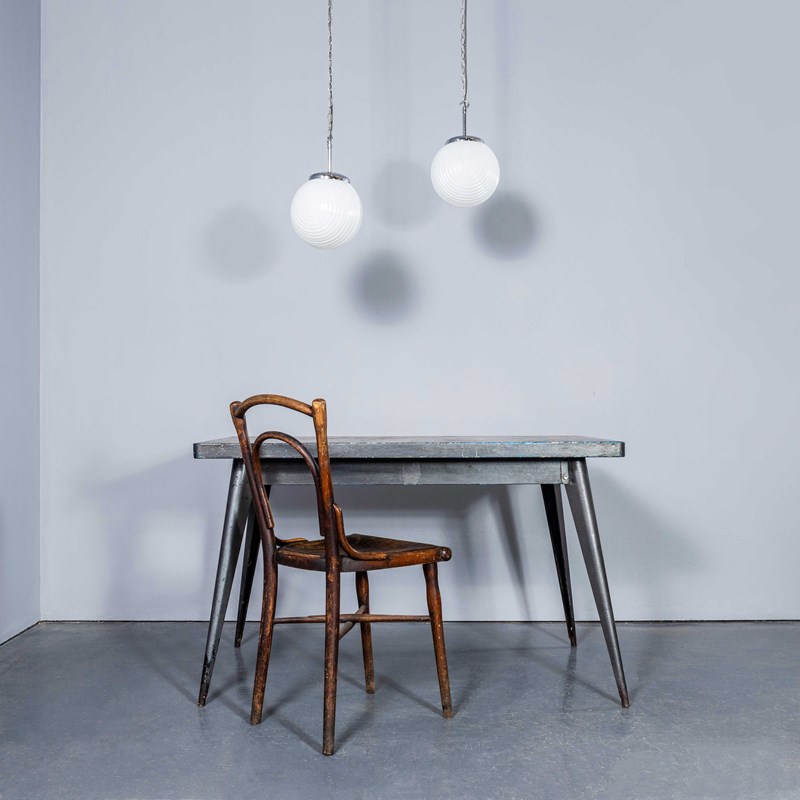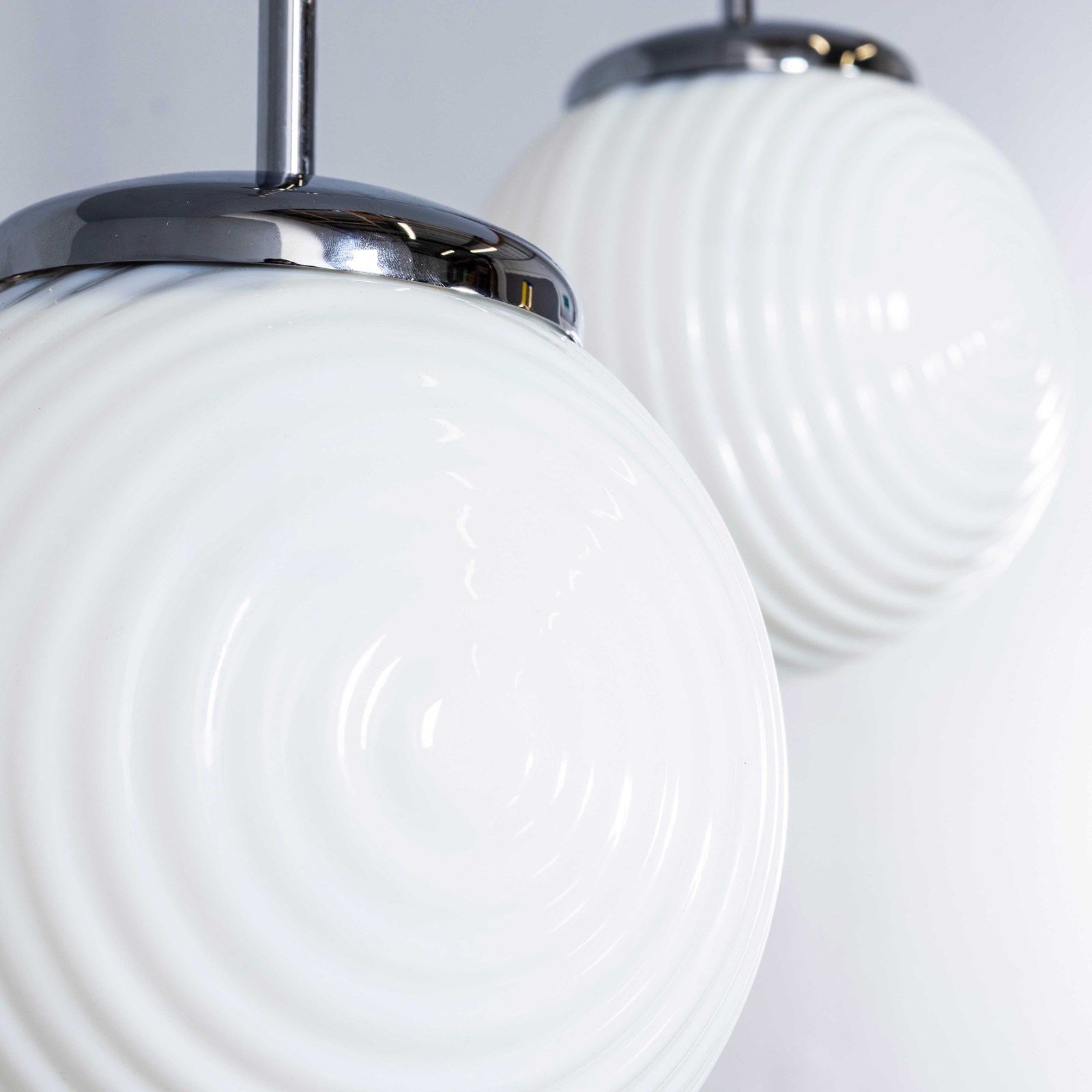 Beautiful original ribbed opaline pendant lamps featuring mouth blown glass in a ribbed pattern reminiscent of Michelin. We have a number of these stunning original lamps available, salvaged from a hotel in the Czech republic.