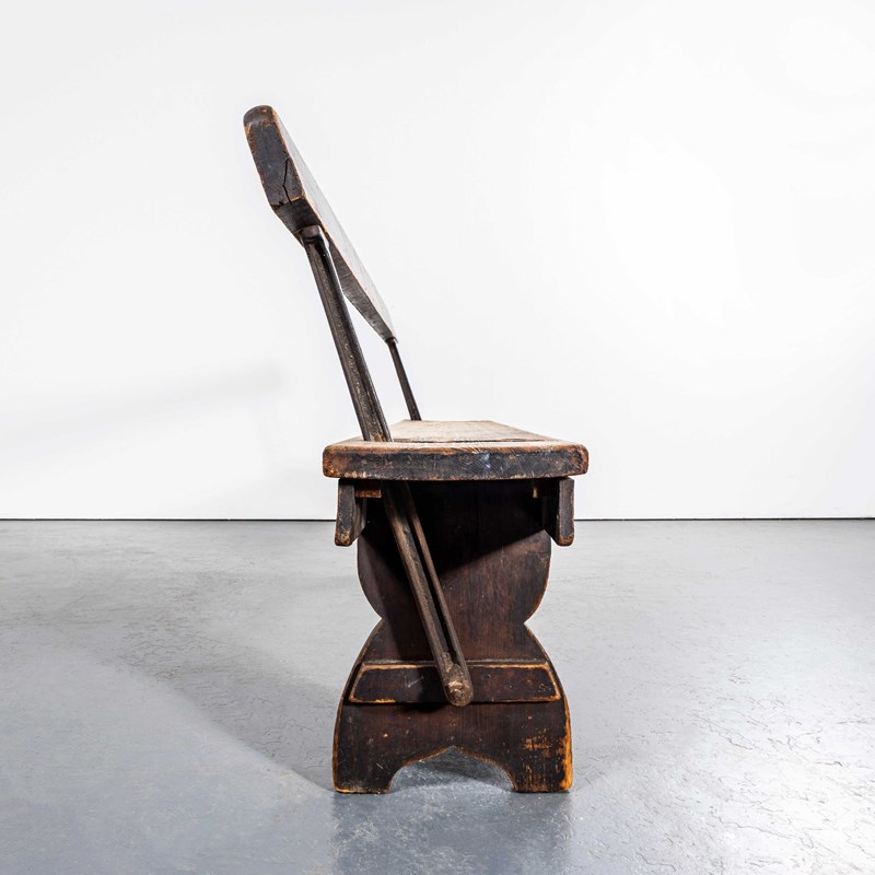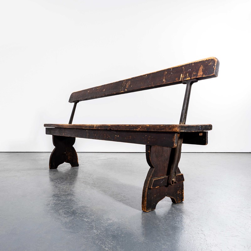 A Good honest very original railway bench made from heavy solid planks of pitch pine, still retaining elements of the original rusty brown utilitarian paint. The bench back easily flips from side to side, typical of platform or waiting room design.