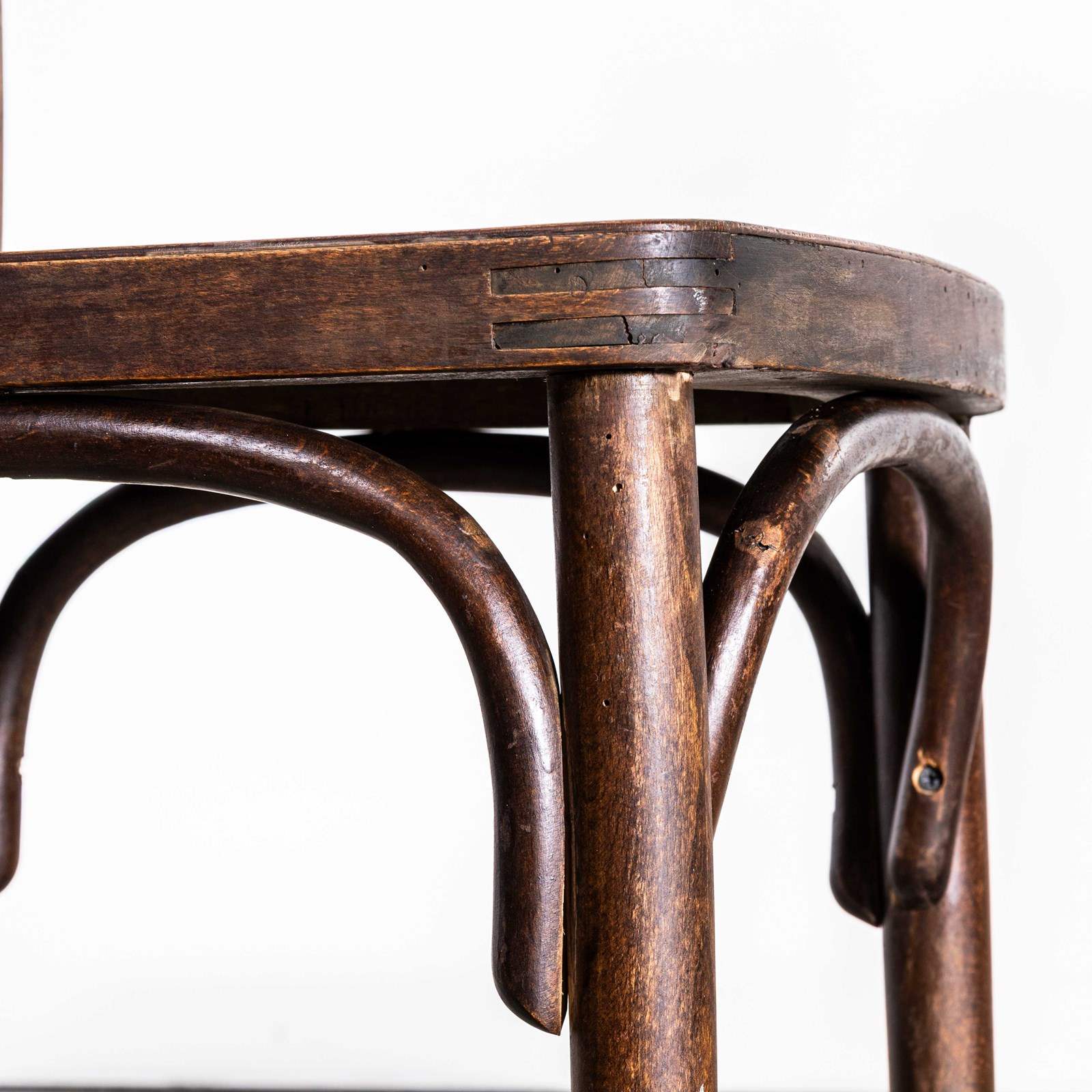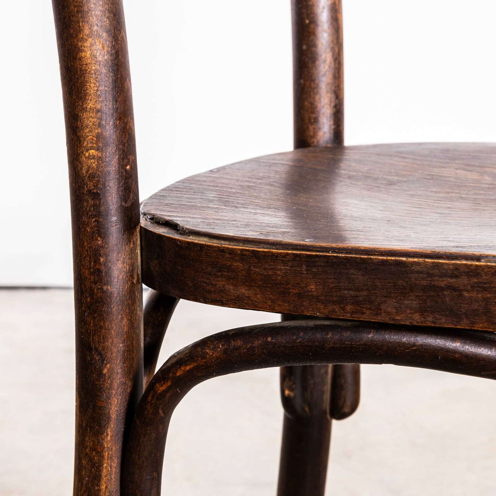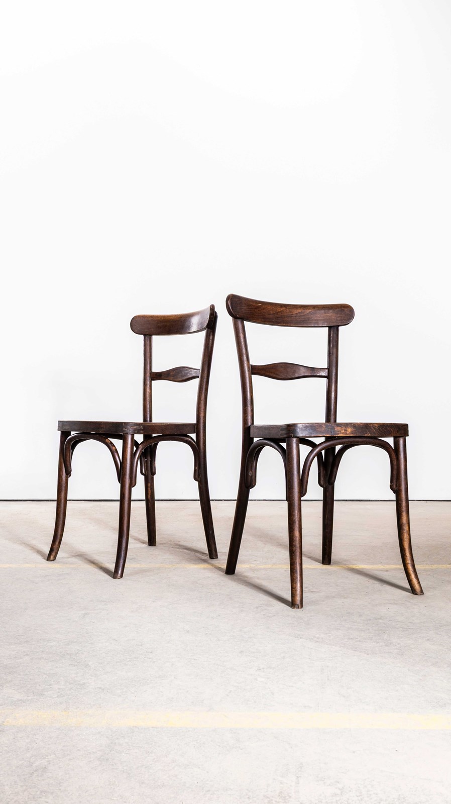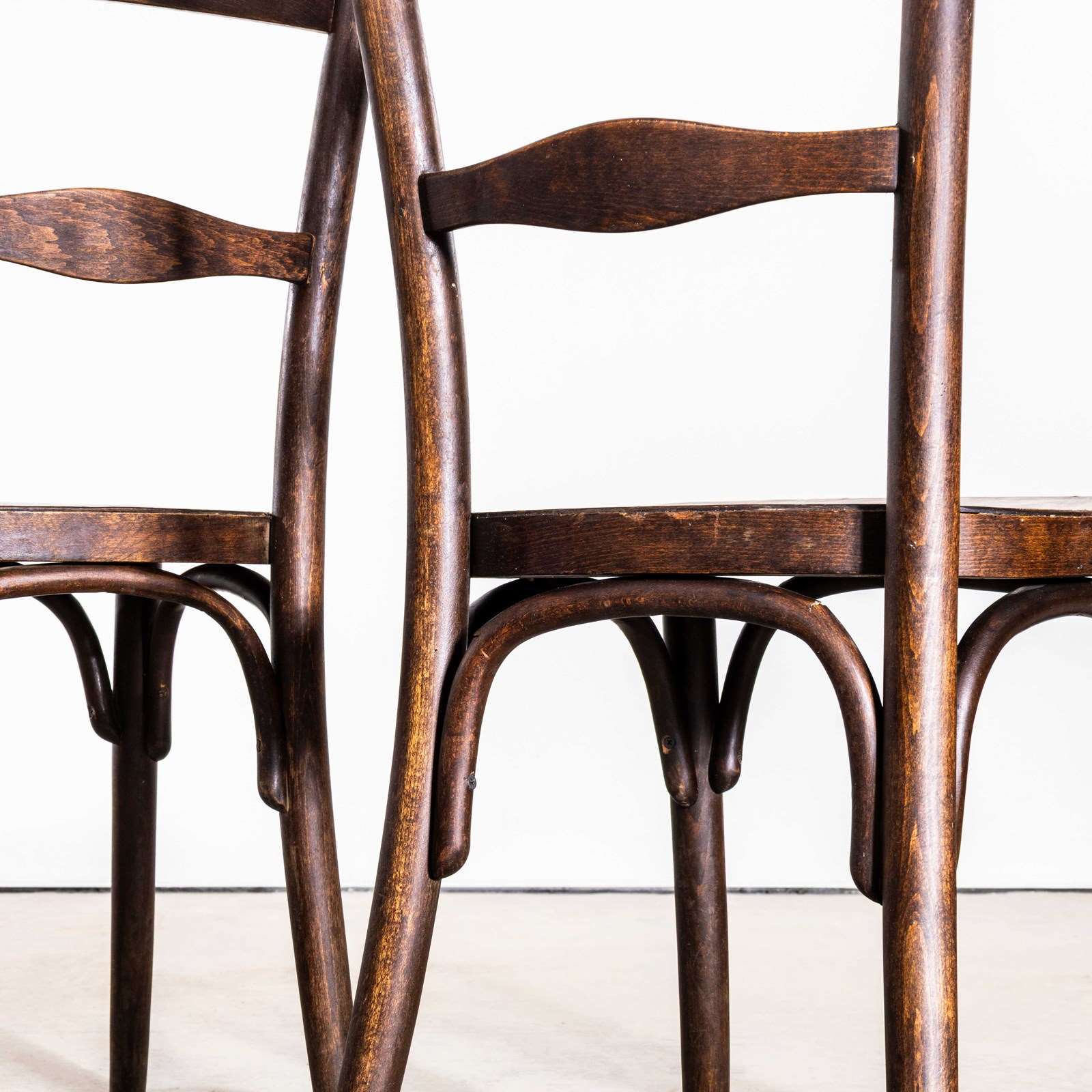Founded in the early 19th Century by Michael Thonet, Thonet invented the process of steam bending wood under pressure and used this to design the classic bentwood chairs still in production today. In the 19th Century he had a large network of shops throughout Europe and was a huge furniture retailer. This is a simple elegant pair of original Thonet chairs, stamped with the makers mark. The chairs have a very rich colour and character and are in exceptional condition. The chairs have the distinctive single bar back. The chairs have been gently refurbished in our own workshops and are in excellent working condition. The chairs are made in the classic bentwood style of early Thonet pieces.
