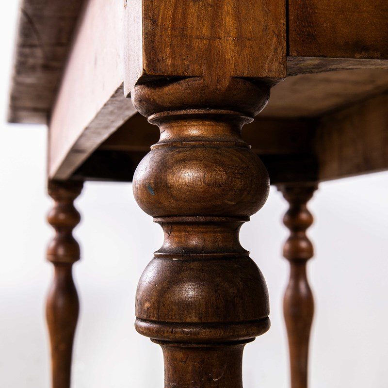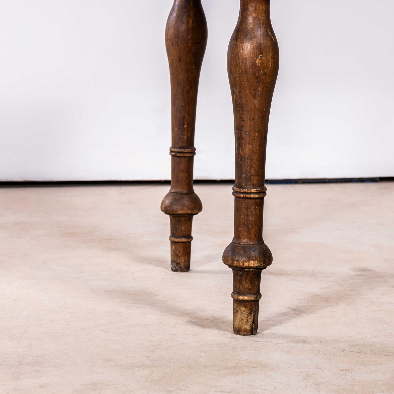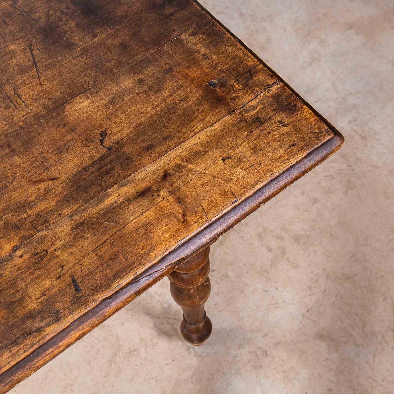 Compact sized original French table with a rich golden colour and character. Beautifully made in solid fruitwood throughout. The table is made with turned bobbin legs and good construction. Our workshop has serviced the table, it is strong and stable, waxed and ready to go. Knee Clearance: 65cm.