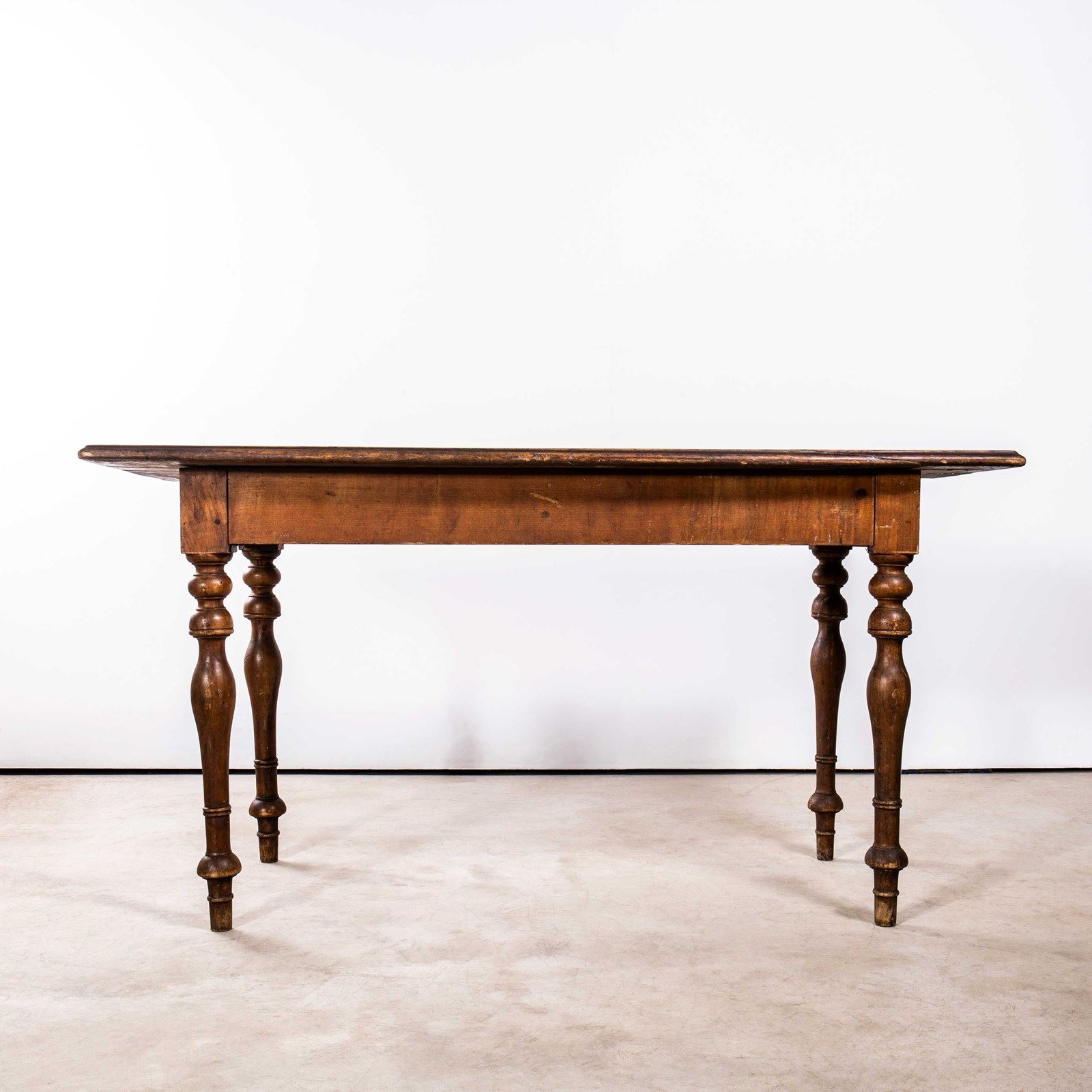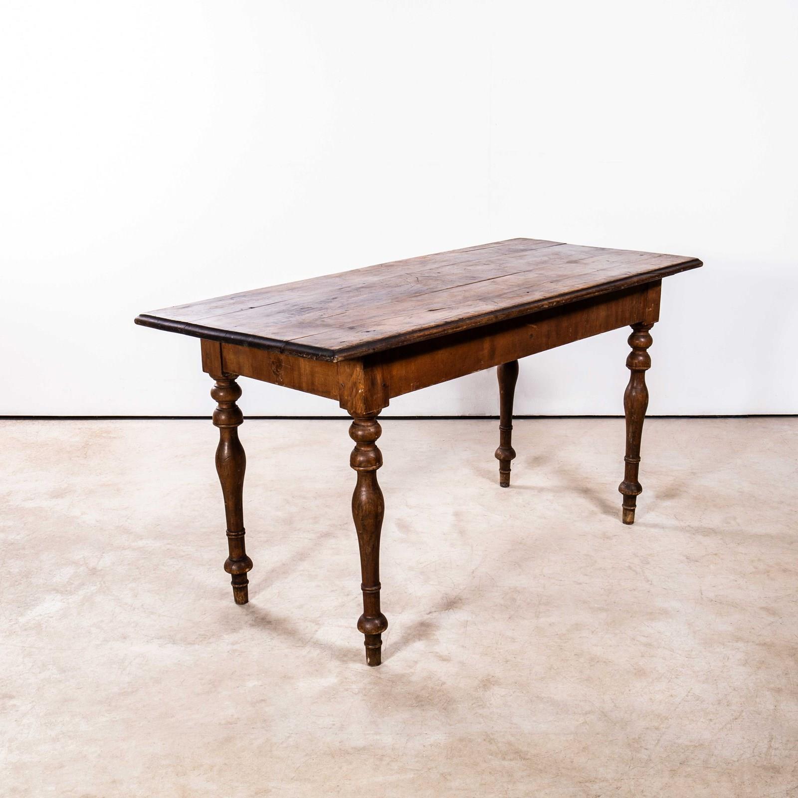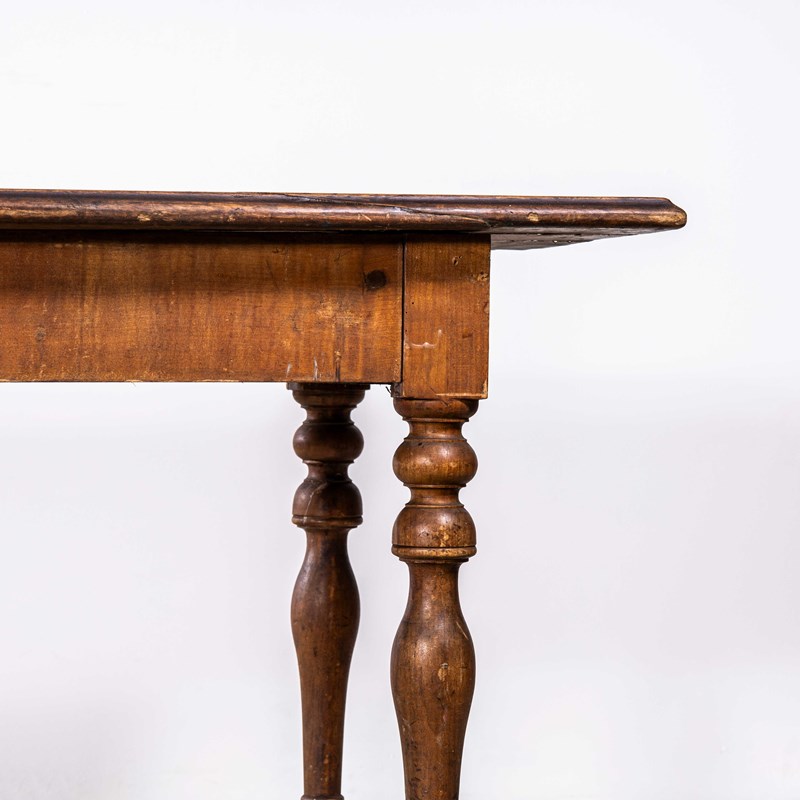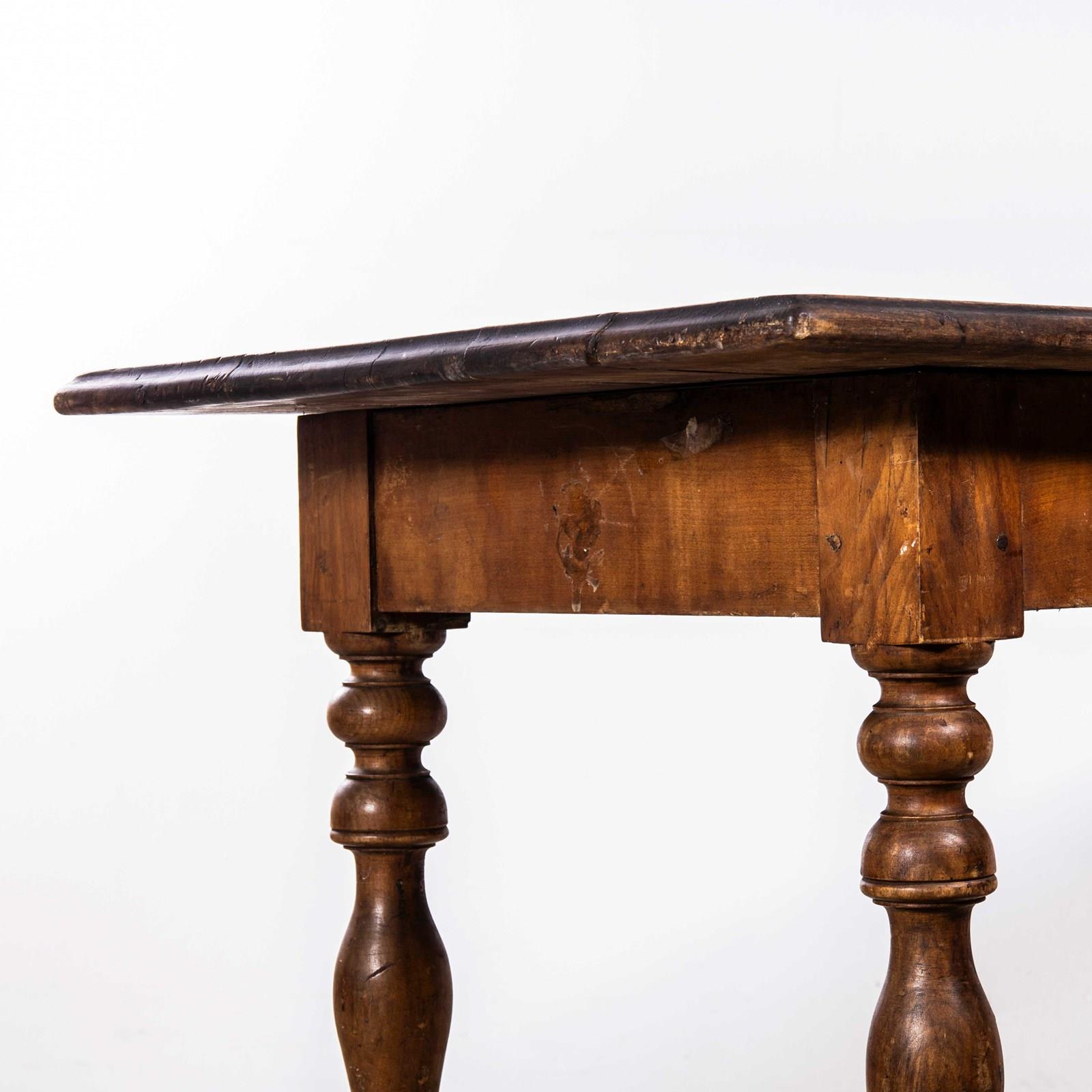 Compact sized original French table with a rich golden colour and character. Beautifully made in solid fruitwood throughout. The table is made with turned bobbin legs and good construction. Our workshop has serviced the table, it is strong and stable, waxed and ready to go. Knee Clearance: 65cm.