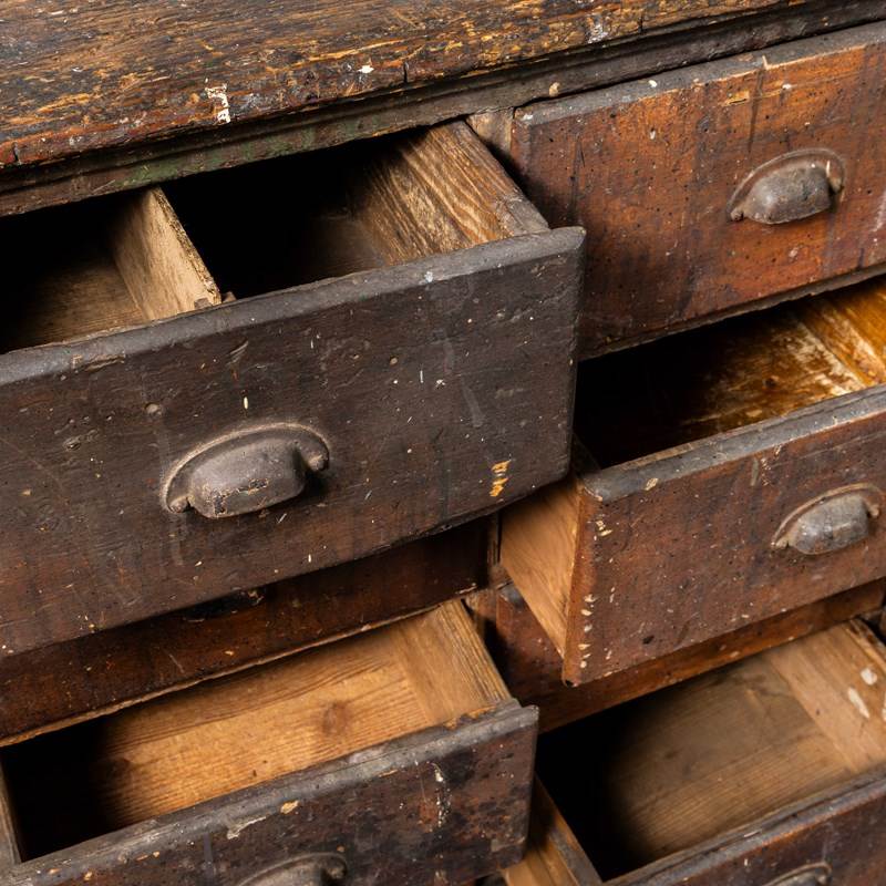 One of the most characterful pieces we have come across in our travels. Originally the drawers were from a hardware merchants, the practical drawer size and labels indicate, as well as the lower cost use of pitch pine, but with heavy duty dovetail joints. The cabinet has unfinished ends, so it was in a shop with cabinets either side. The cabinets condition looks like it was repurposed in a workshop for day to day use where it has had a rich history with scars and paint spills but we have left it as it is, that’s its history. Our workshop has serviced all the drawers they are well used but are strong and shut fine. A hugely original piece, we have cleaned and serviced it but left the character.