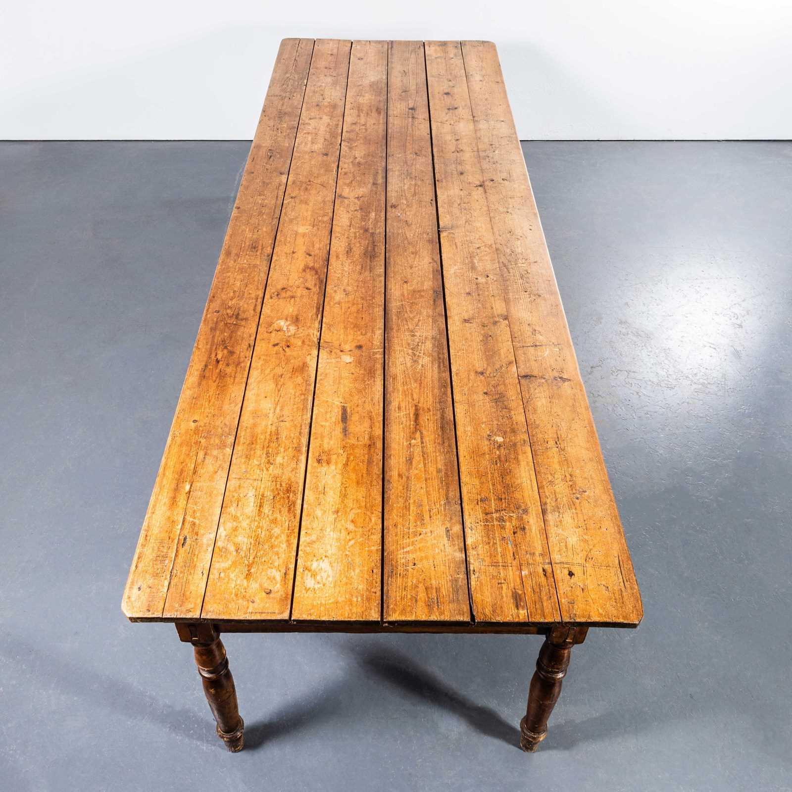 At just over 3 metres this a stunning long planked top table, original throughout, with a rich honey colour and character top. Beautifully made in solid pine throughout. The table is made with turned bobbin legs and good construction with visible tenant joints on the legs, the top has incredible grain and colour and is solid planked pine. Our workshop has serviced the table, it is strong and stable, and ready to go.