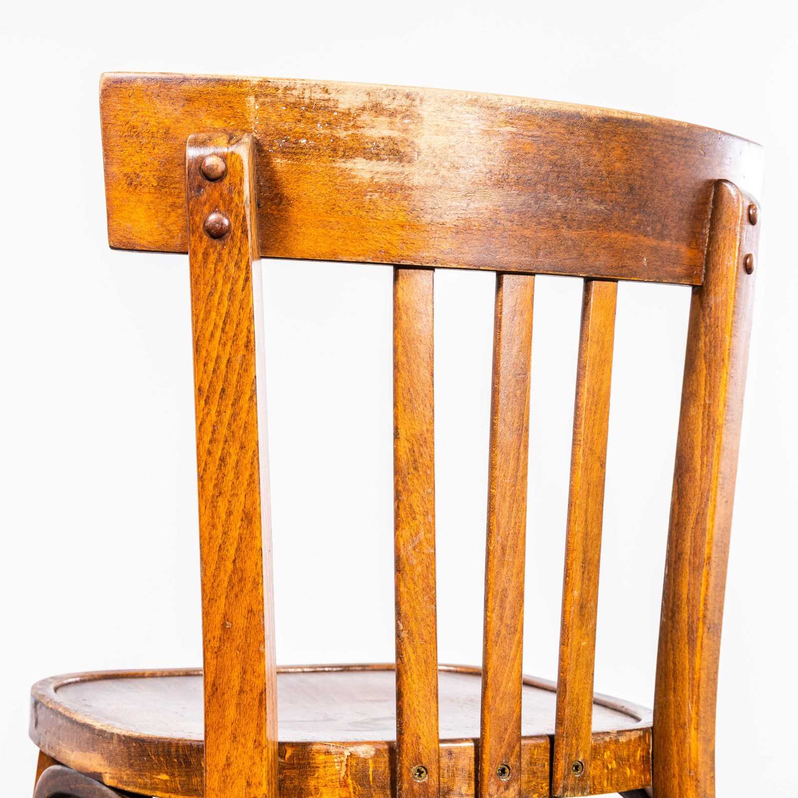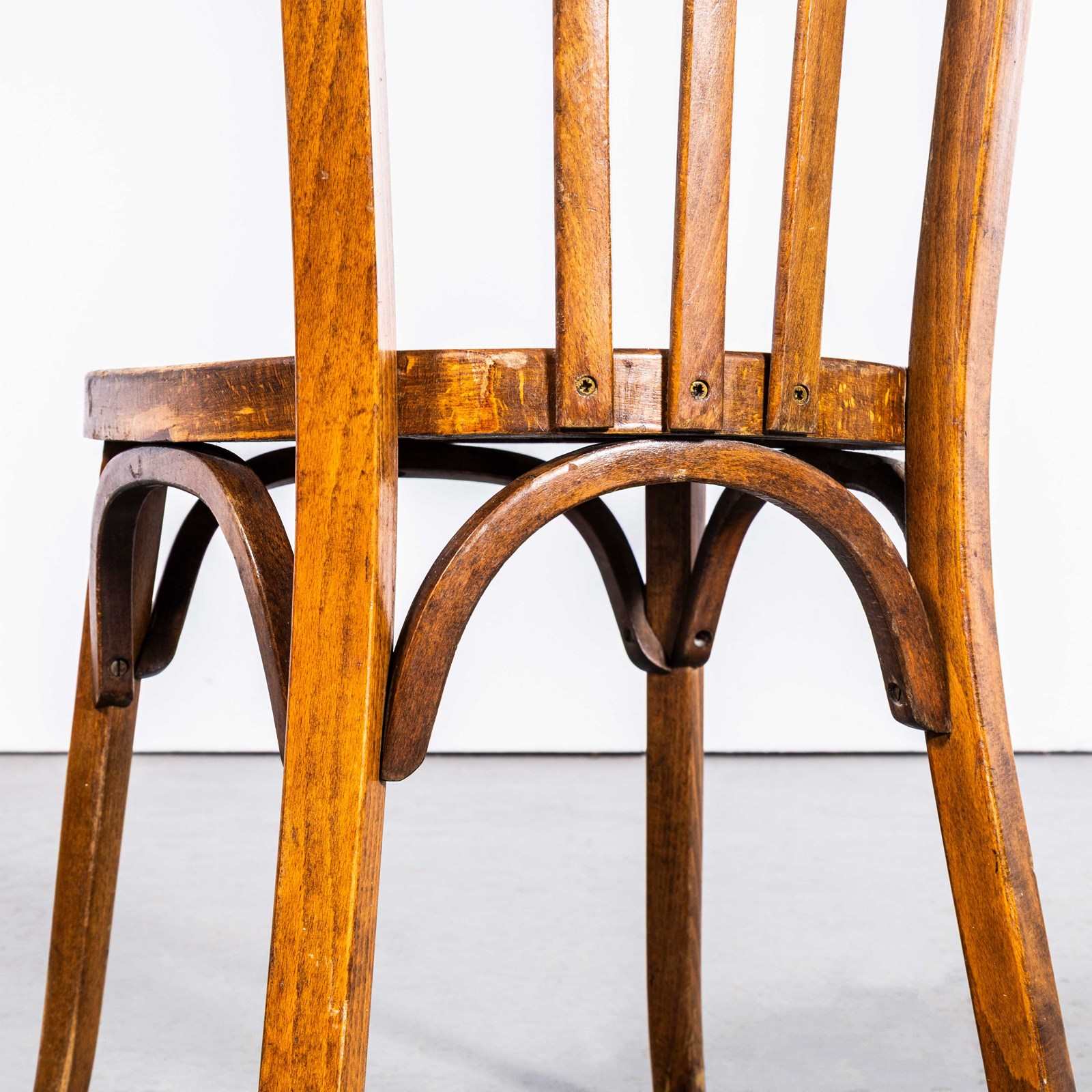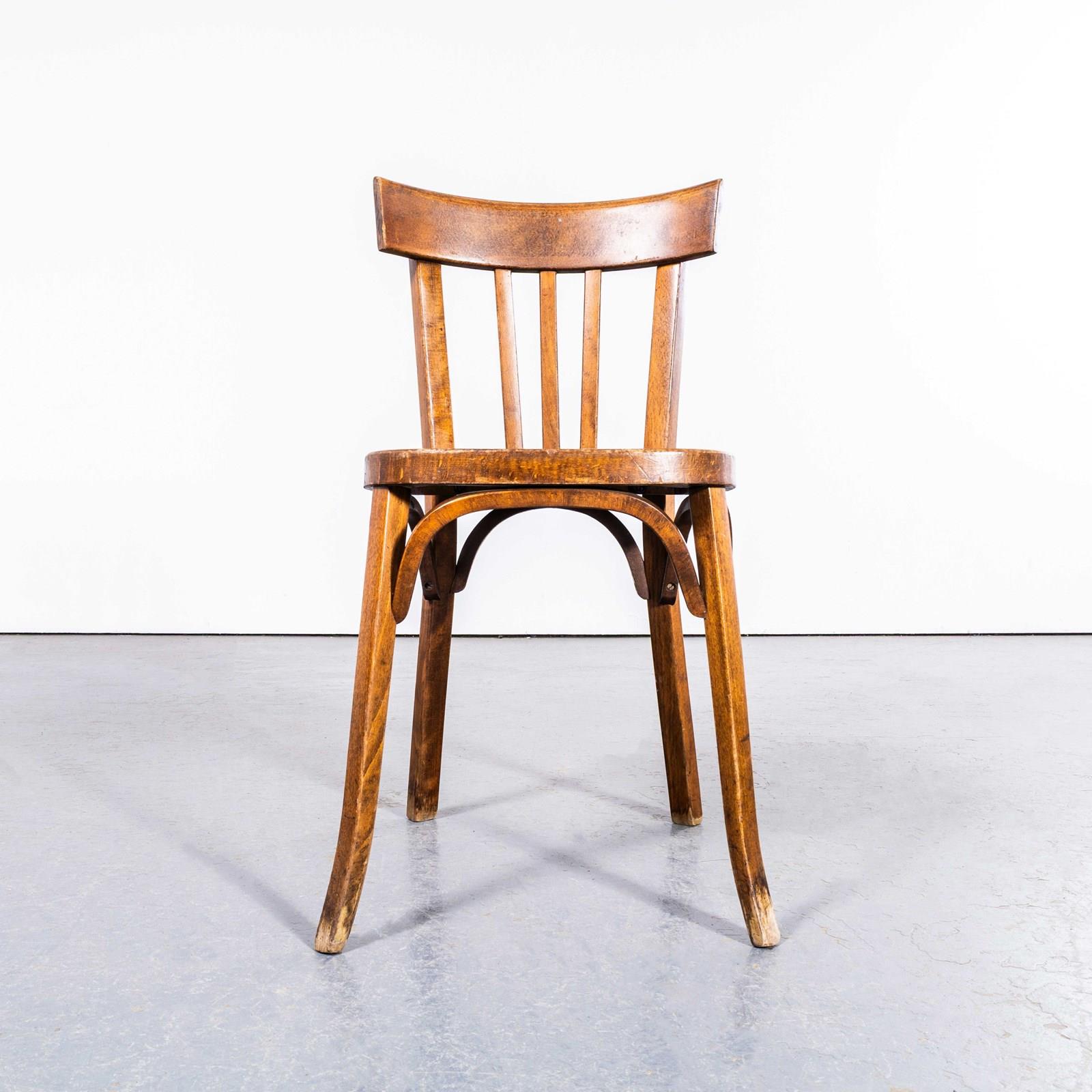 1950’s Angular French Bentwood Dining Chairs – Set Of Five. Made by the maker Baumann. Baumann is a slightly off the radar French producer just starting to gain traction in the market. Baumann was founded in 1901, by Swiss man Emile Baumann, in Colombier Fontaine, France. Baumann started producing a simple child’s chair but grew rapidly to be a large bentwood producer with showrooms all over France. Beautifully made and designed. Stunning original patina with lovely sun bleached frames. We service and wax each chair before they leave our workshop and we deliver chairs of excellent quality.