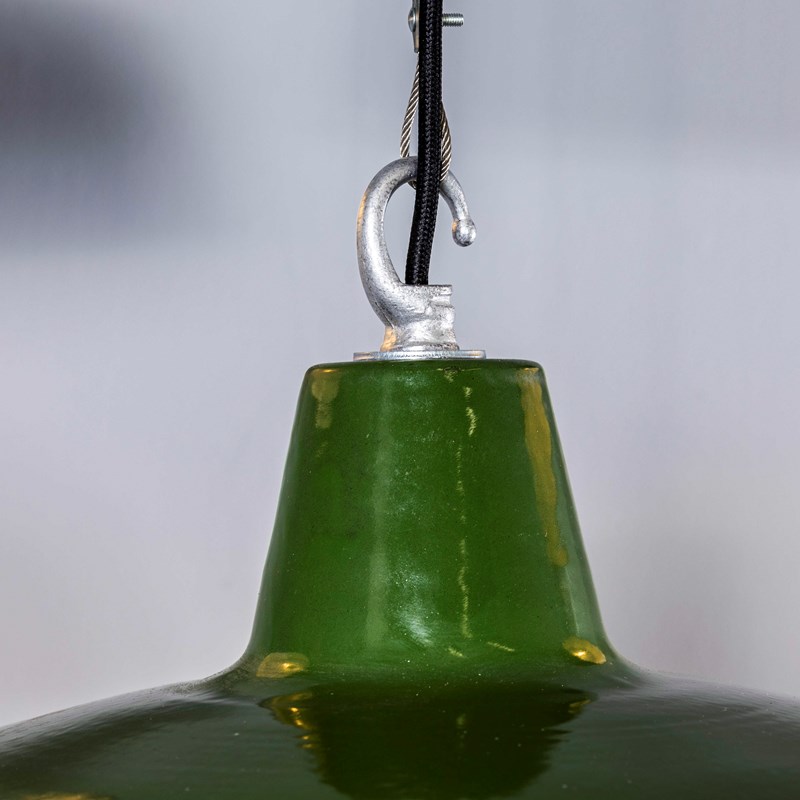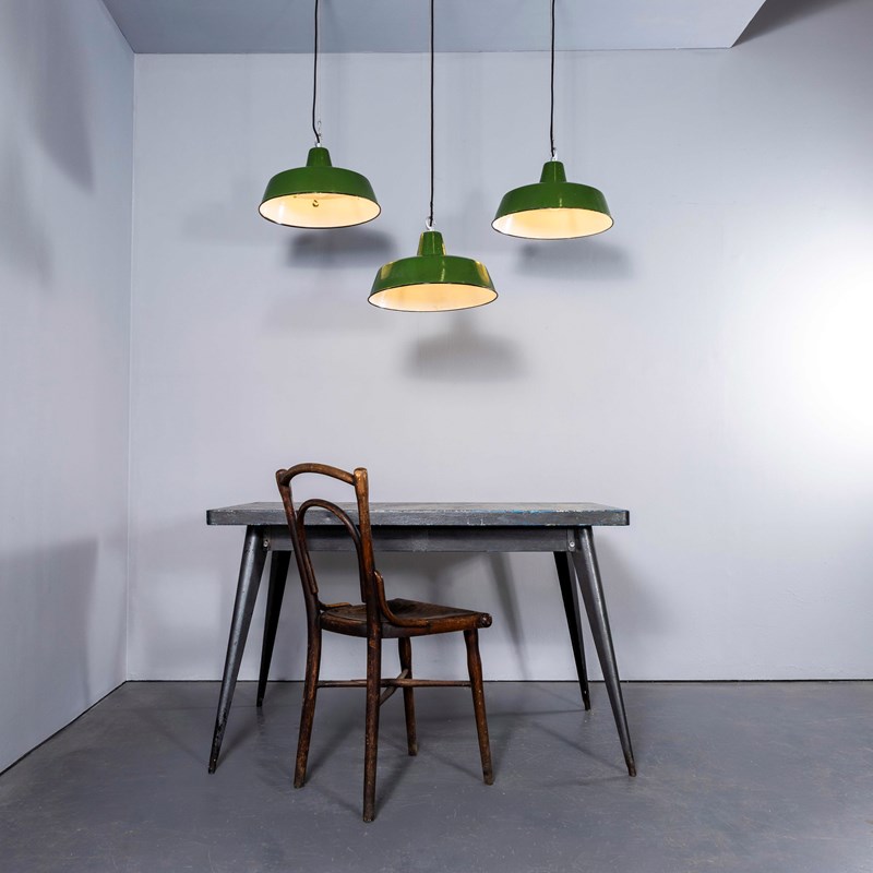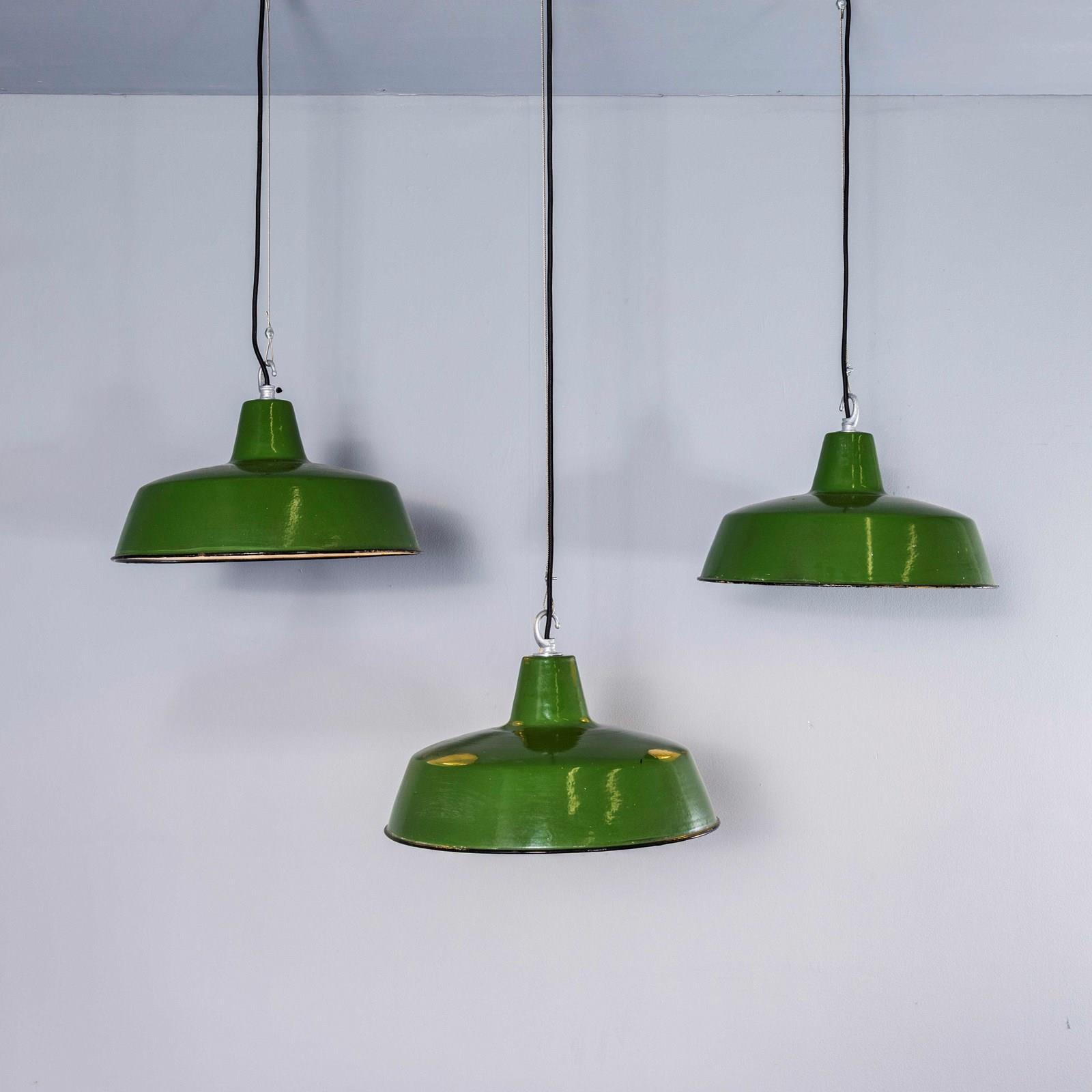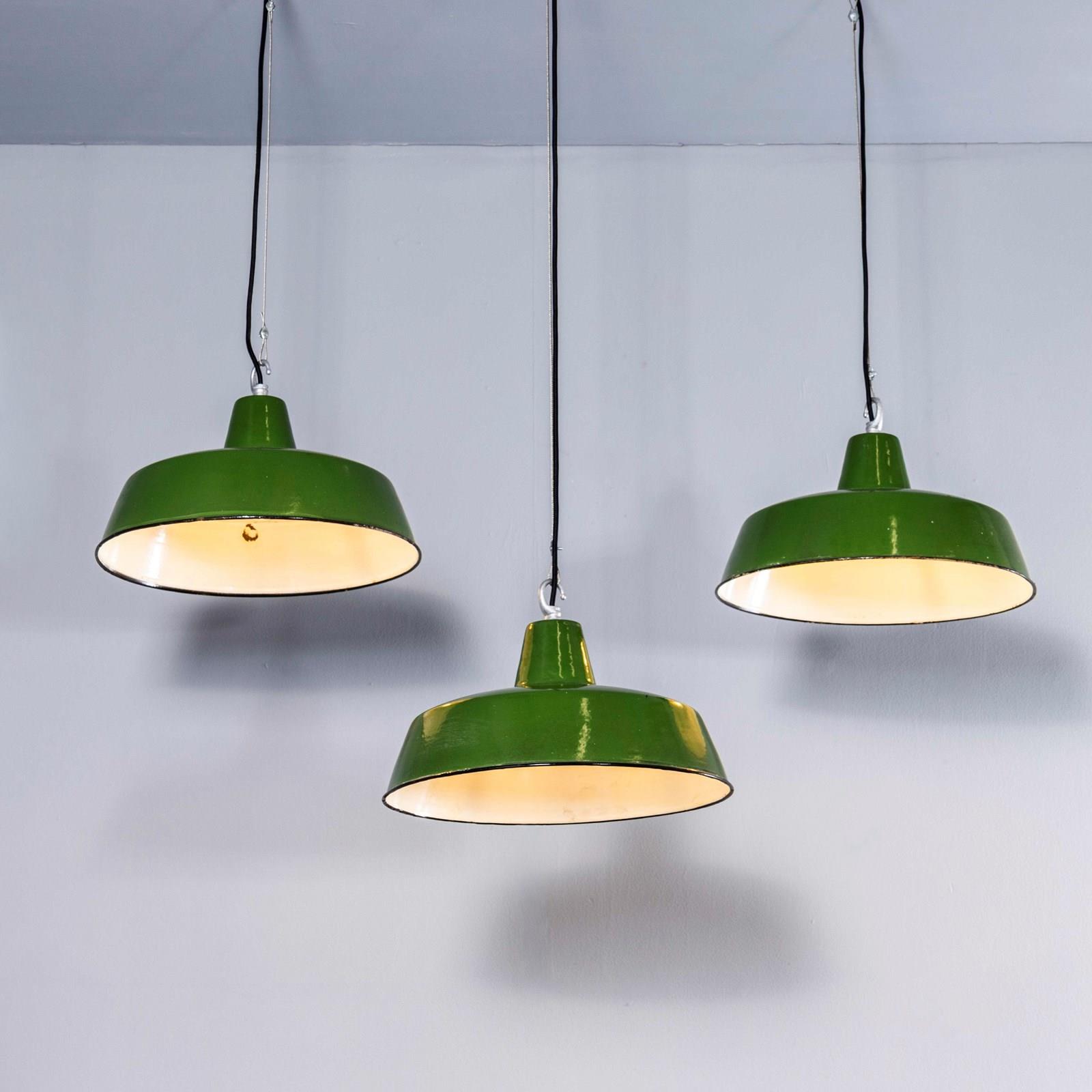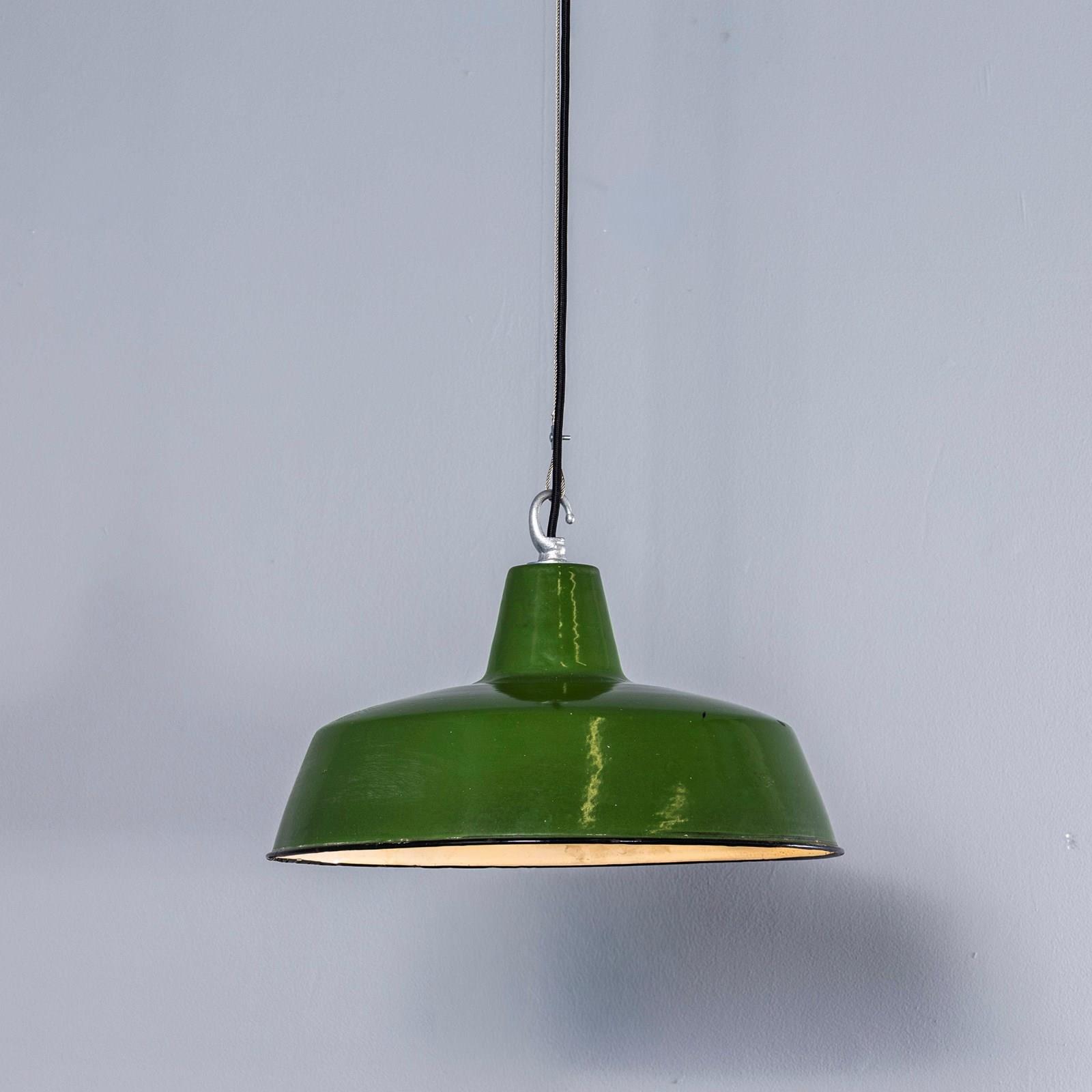 Classic industrial lamps from Eastern Europe, the shade is enamelled green, the reflective inside is white enamel. High quality clean industrial lamps. Each lamp has been cleaned and restored and all electrical components have been removed and replaced with modern European CE standard components to BS EN 60598. Each lamp is individually tested and labelled to BS EN 60598. INCLUDED: Each lamp comes completely wired and ready to install including; 2 metres of wire for hanging the lamps, 2 metres of black fabric covered electrical cable and a ceiling hook as shown. The lamp is fitted with a standard E27 threaded lamp holder for which a wide range of modern and vintage style filament bulbs are widely available. We do not currently sell bulbs and recommend LED bulbs 6W maximum. We can supply more than 2 metres of hanging cable/wire/chain etc. as required, please contact us separately to discuss. We are specialists in refurbishment of vintage lighting, please contact us with any questions regarding purchase or installation. The lamp is currently wired and fitted for UK and EU compliance. The lamp can be wired for compliance in the US or any global market. Listing is for one lamp.