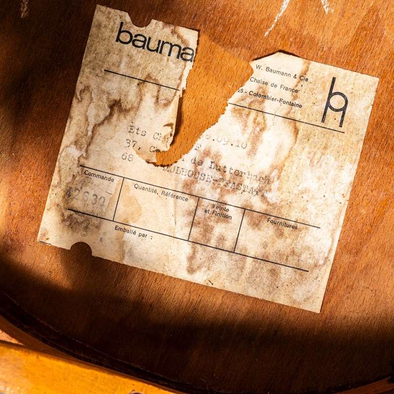 Made by the maker Baumann. Baumann is a slightly off the radar French producer just starting to gain traction in the market. Baumann was founded in 1901, by Swiss man Emile Baumann, in Colombier Fontaine, France. Baumann started producing a simple child’s chair but grew rapidly to be a large bentwood producer with showrooms all over France. Beautifully made and designed. We have cleaned them, that’s all. Stunning original colour and character with lovely golden frames. We service and wax each chair before they leave our workshop and we deliver chairs of excellent quality.