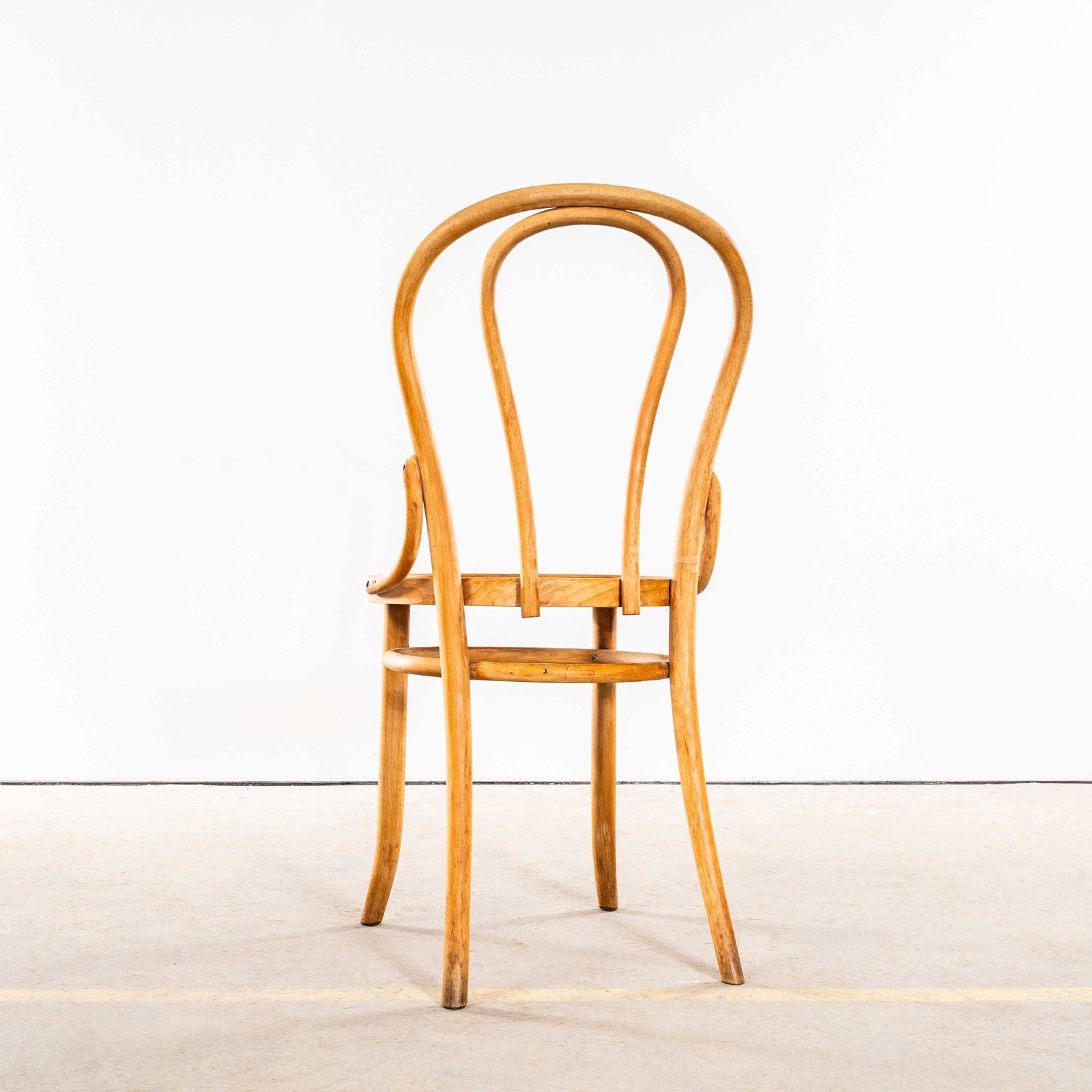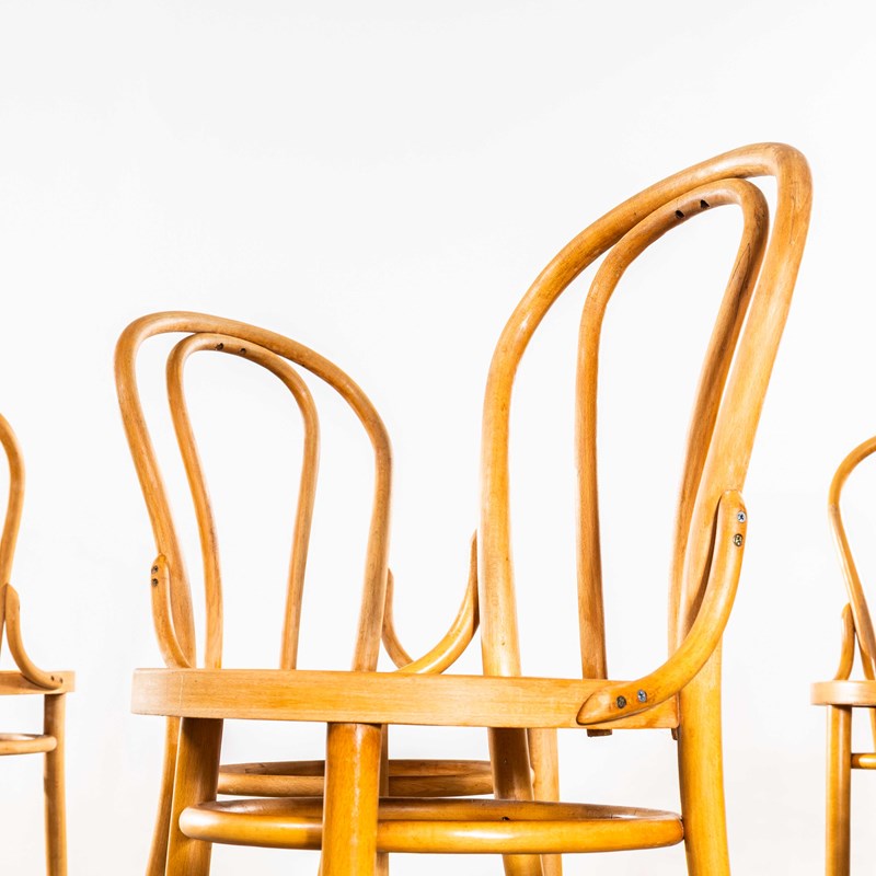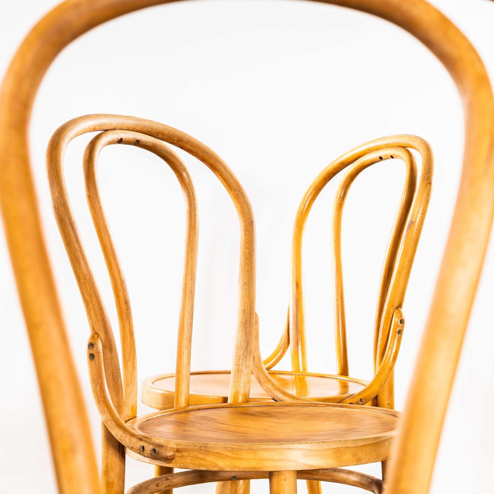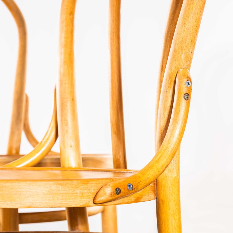 Good quality classic bentwood chairs with a mid blonde colour and classic hoop back bistro design. The chairs were made in Eastern Europe using solid steam bent beech, they are a good weight robust chair with a good wear and age. Our workshop services each chair, checking joints, cleaning and waxing them.
