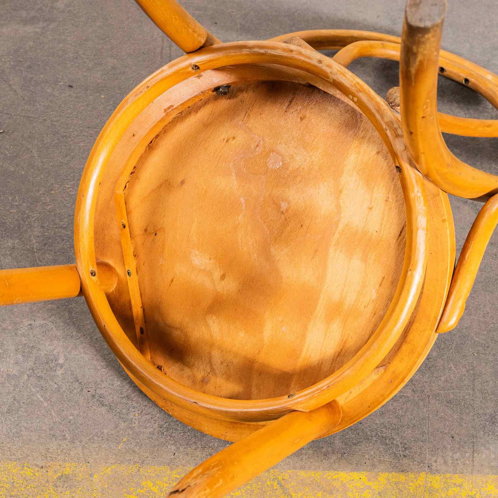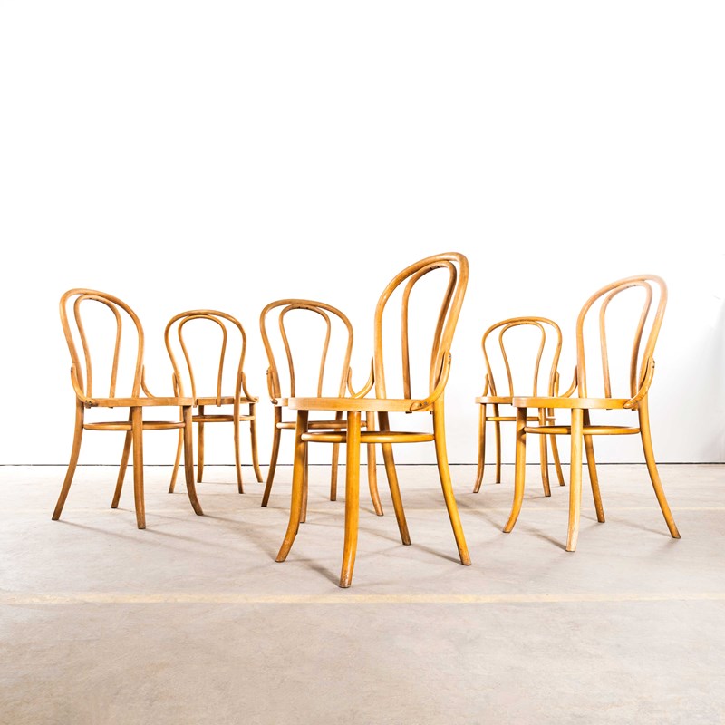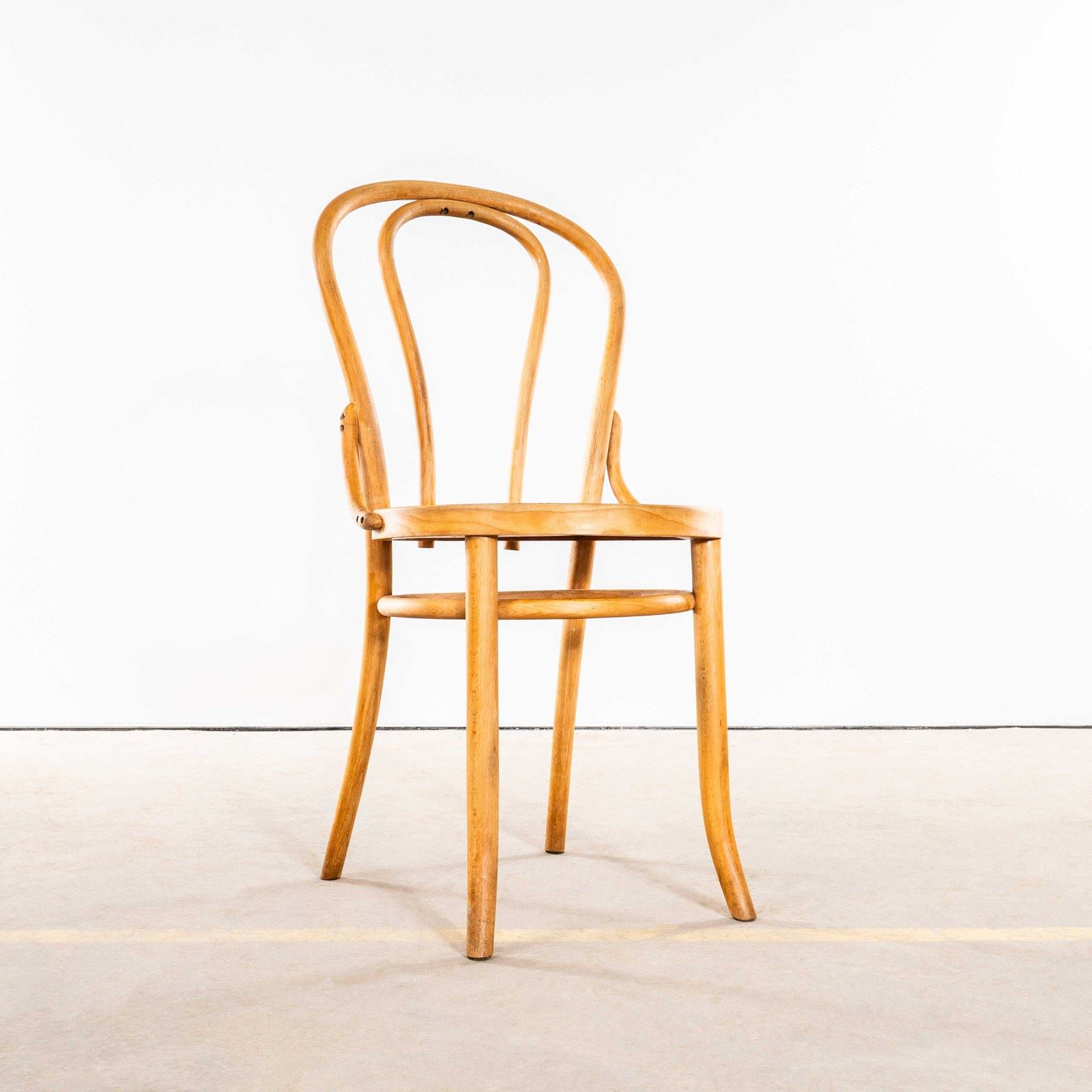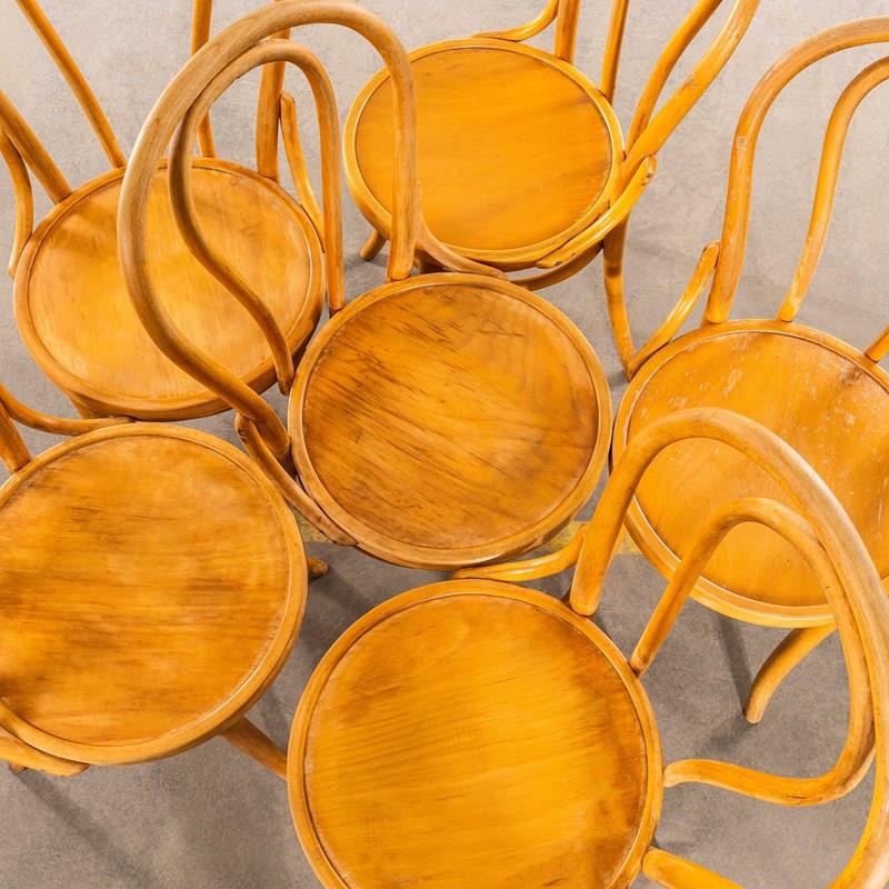 Good quality classic bentwood chairs with a mid blonde colour and classic hoop back bistro design. The chairs were made in Eastern Europe using solid steam bent beech, they are a good weight robust chair with a good wear and age. Our workshop services each chair, checking joints, cleaning and waxing them.
