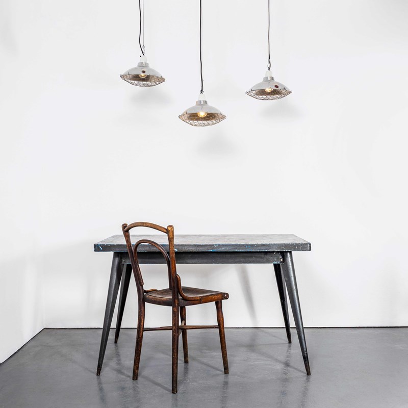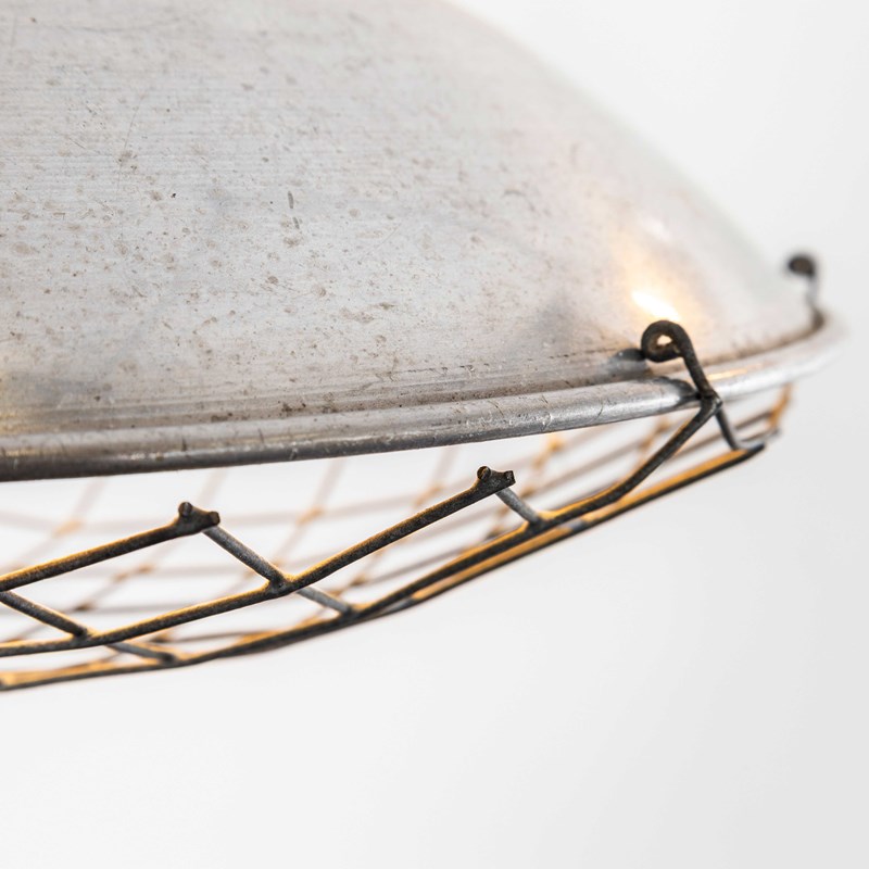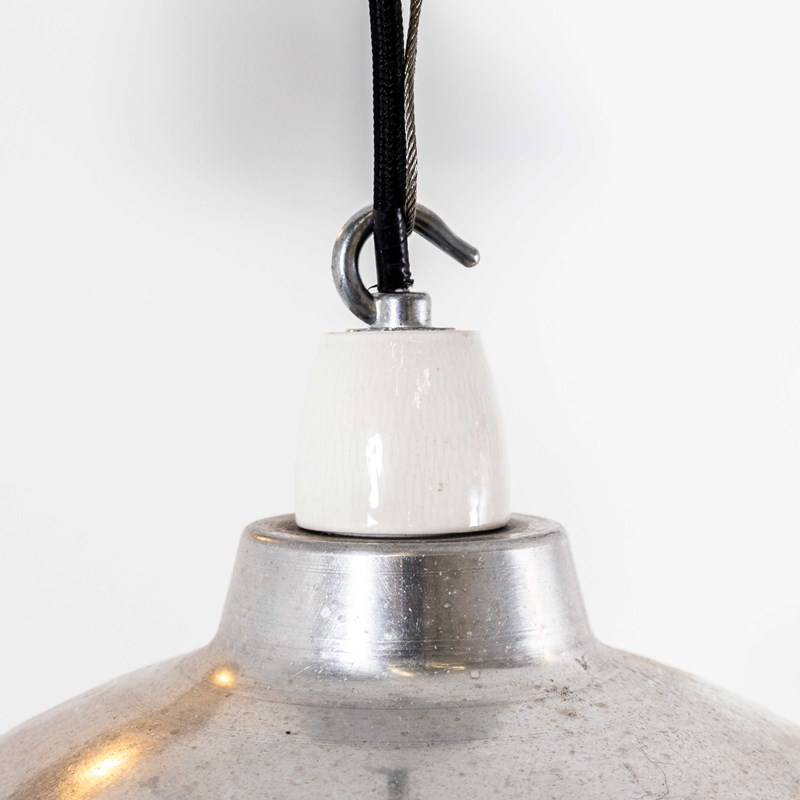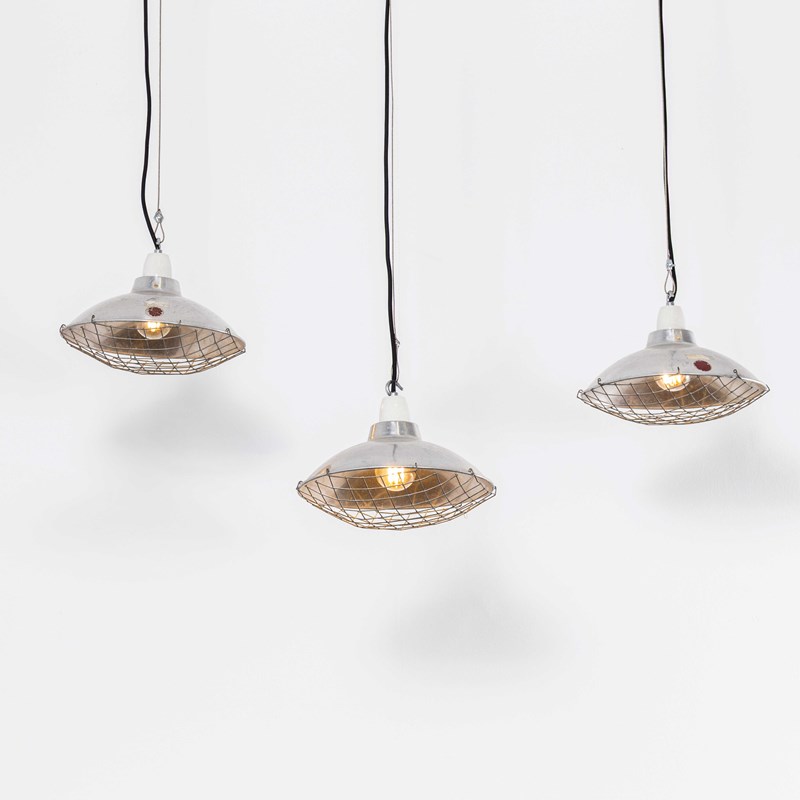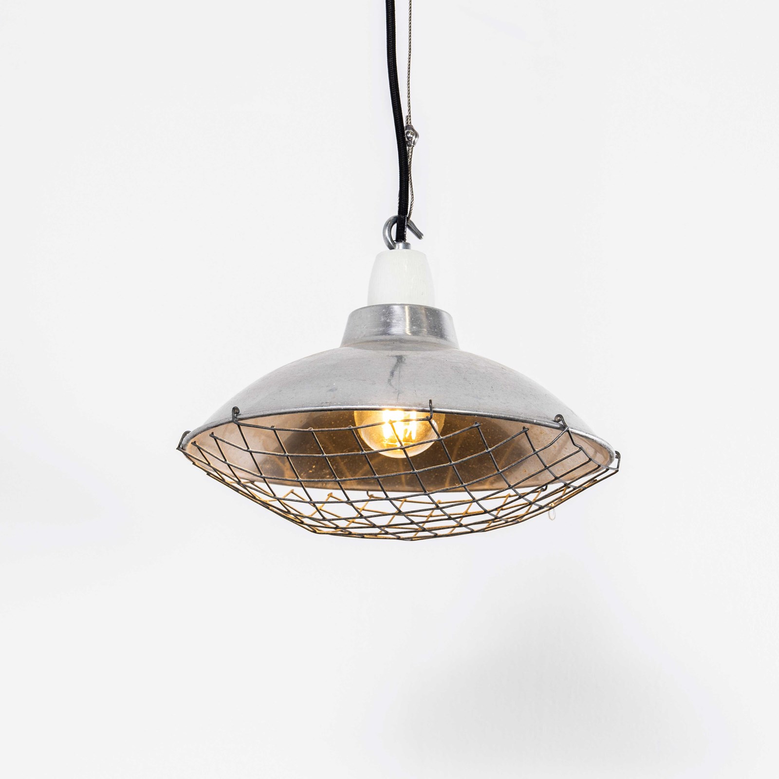 We salvaged these from a large commercial plant nursery in the UK where they had been hanging since the 50’s. Made from spun aluminium with their original wire cages. Each lamp has been cleaned and restored. Each lamp is individually tested and labelled to BS EN 60598. INCLUDED: Each lamp comes completely wired and ready to install including; 2 metres of stainless steel 2mm diameter wire rope for hanging the lamp (with 2 easy to use simplex grips), 2 metres of fabric covered electrical cable and a ceiling hook as shown. The lamp is fitted with a standard E27 threaded lamp holder for which a wide range of modern and vintage style filament bulbs are widely available. We do not currently sell bulbs and recommend LED bulbs 6W maximum. We can also supply more than 2 metres of hanging cable/wire/chain etc as required, please contact us separately to discuss. We are specialists in refurbishment of vintage lighting, please contact us with any questions regarding purchase or installation.
