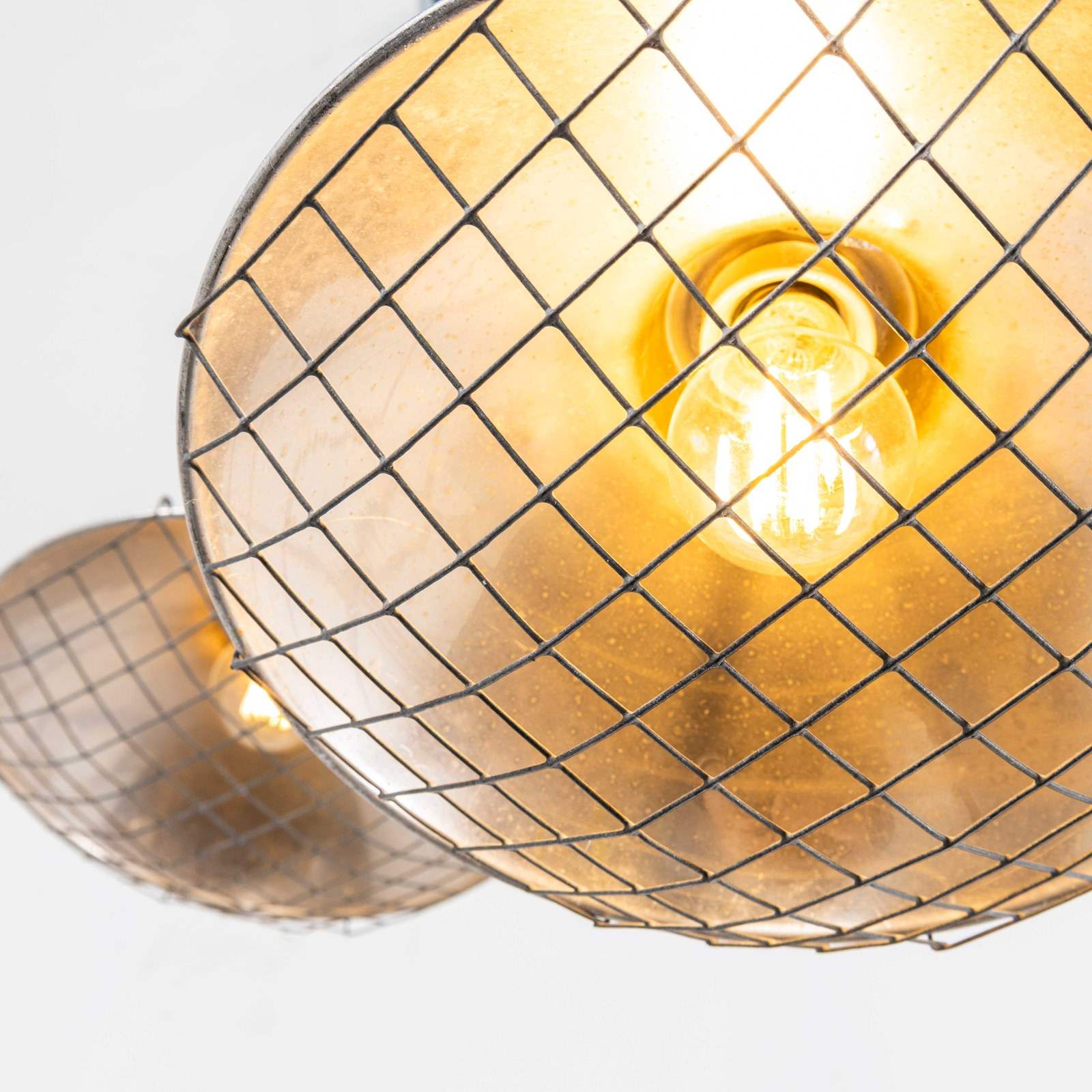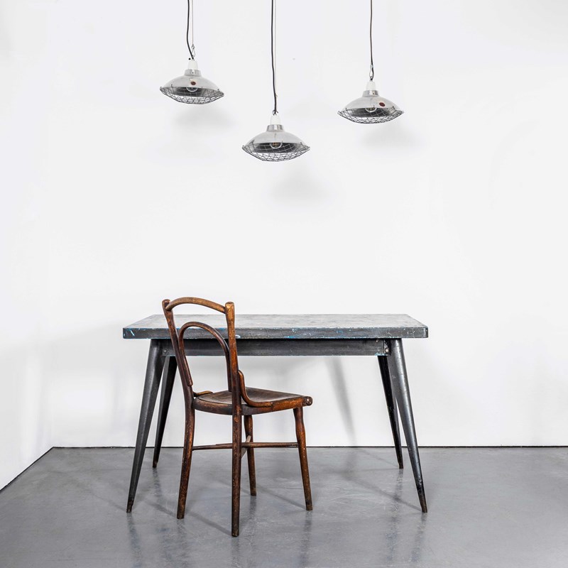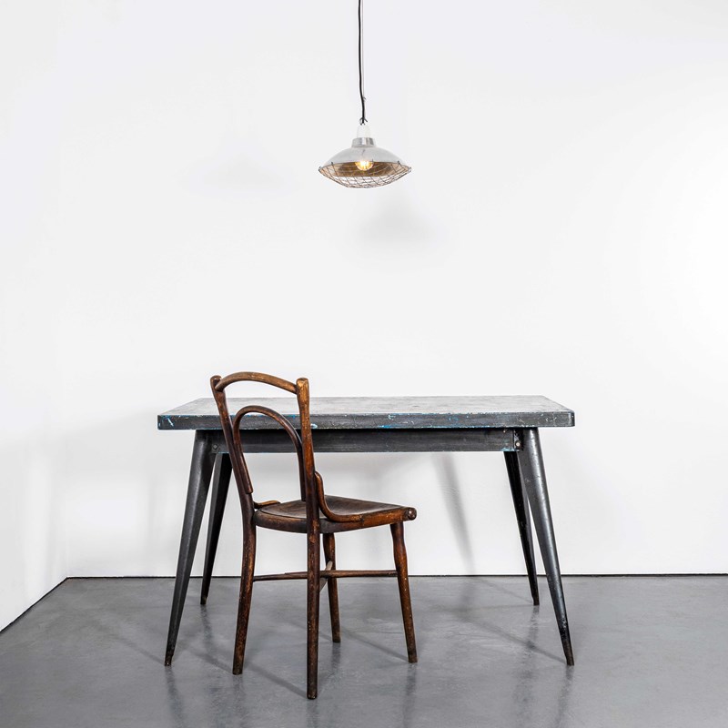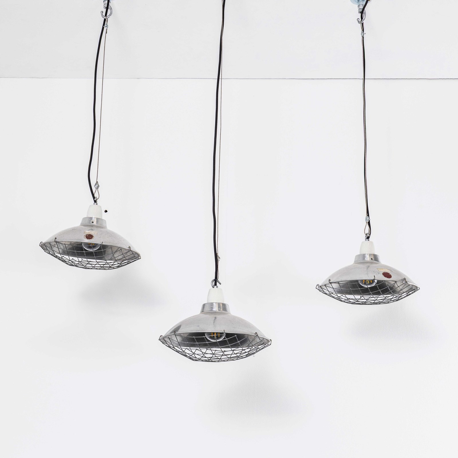 We salvaged these from a large commercial plant nursery in the UK where they had been hanging since the 50’s. Made from spun aluminium with their original wire cages. Each lamp has been cleaned and restored. Each lamp is individually tested and labelled to BS EN 60598. INCLUDED: Each lamp comes completely wired and ready to install including; 2 metres of stainless steel 2mm diameter wire rope for hanging the lamp (with 2 easy to use simplex grips), 2 metres of fabric covered electrical cable and a ceiling hook as shown. The lamp is fitted with a standard E27 threaded lamp holder for which a wide range of modern and vintage style filament bulbs are widely available. We do not currently sell bulbs and recommend LED bulbs 6W maximum. We can also supply more than 2 metres of hanging cable/wire/chain etc as required, please contact us separately to discuss. We are specialists in refurbishment of vintage lighting, please contact us with any questions regarding purchase or installation.