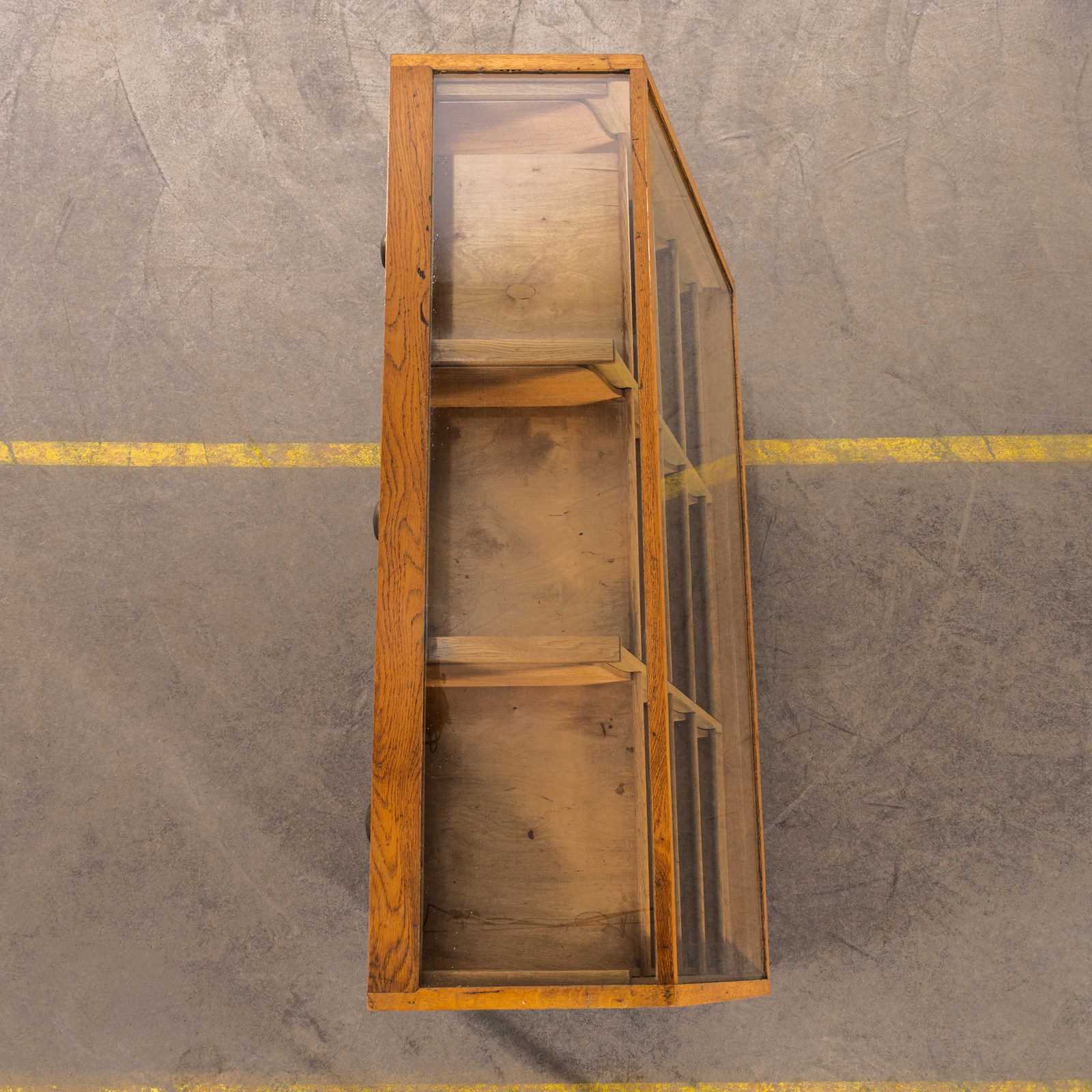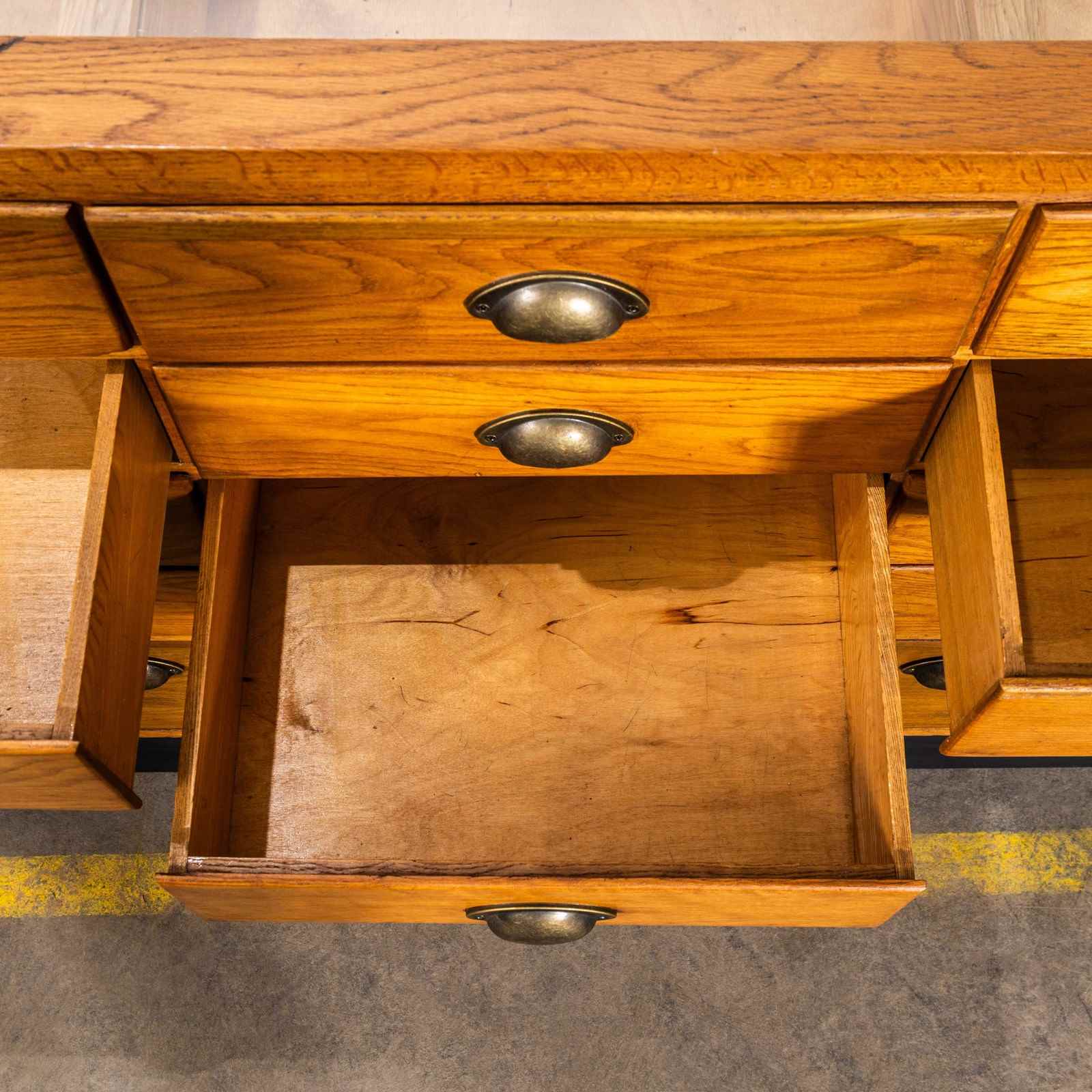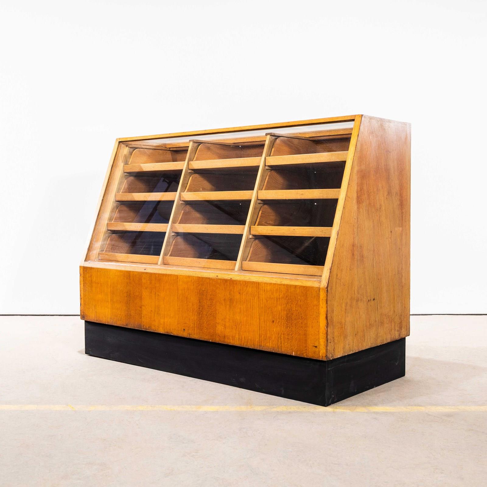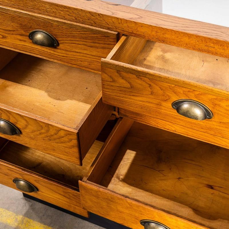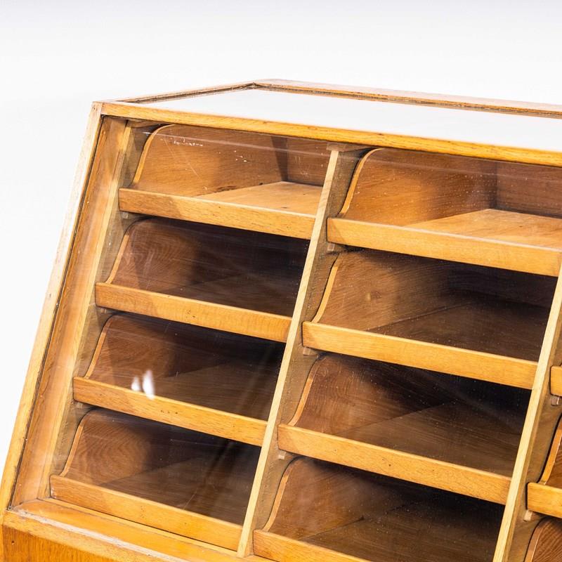 Late 50’s haberdashery cabinet with twelve tiered drawers and two pull down pigeon hole storage spaces. The cabinet has a very unusual angled front design. The cabinet is made entirely in oak with beautifully finger jointed drawers. The cabinet retains all it’s original pressed steel handles mounted on birch fronted drawers. This cabinet is a good compact size in exceptional condition. Our workshop has gently cleaned and rejuvenated the cabinet, all drawers run smoothly.