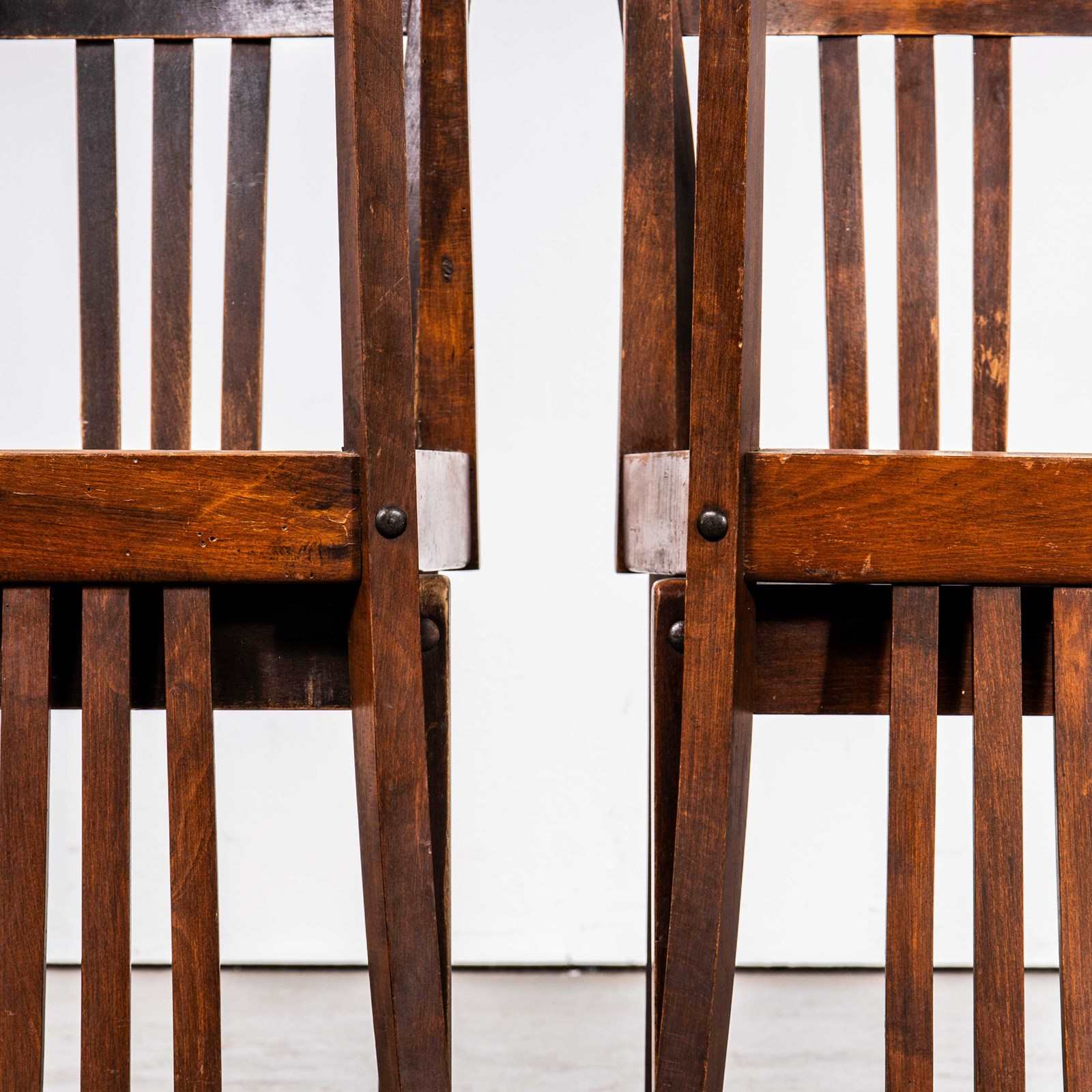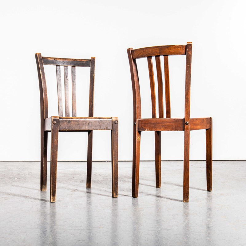 Stella is a lesser known French chair manufacturer founded originally in 1912 as the Auriol company making wheelbarrows. In 1922 Léon Ruisseau used his technical knowledge to create a stronger chair using hidden bolts to strengthen the structure. The process made the construction stronger but also allowed him to manage his inventory better in component form. Based in Labruguière in the South of France Stella exists to this day. This listing is for a set of four classic Stella chairs from the fifties in a rich warm oak. The chairs are in excellent original condition, the wide seats make them very comfortable and strong. Our workshop has tightened the ‘Stella’ bolts and waxed them. Seat Height: 46cm.