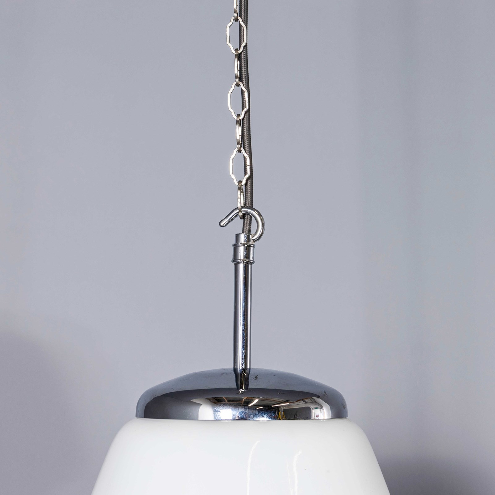 • Chrome gallery tops suspended on gothic chain and grey fabric flex.