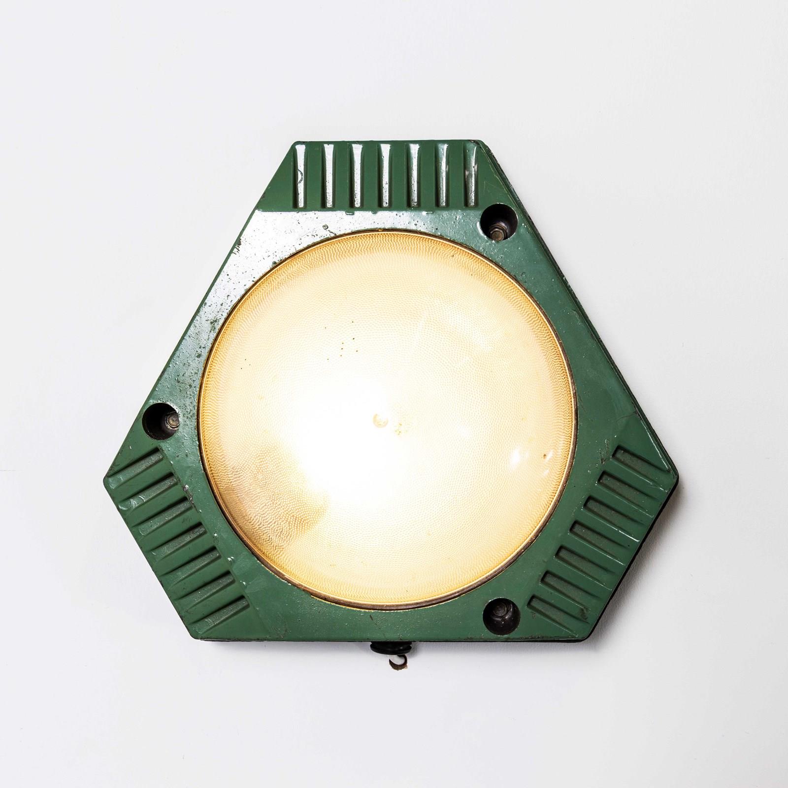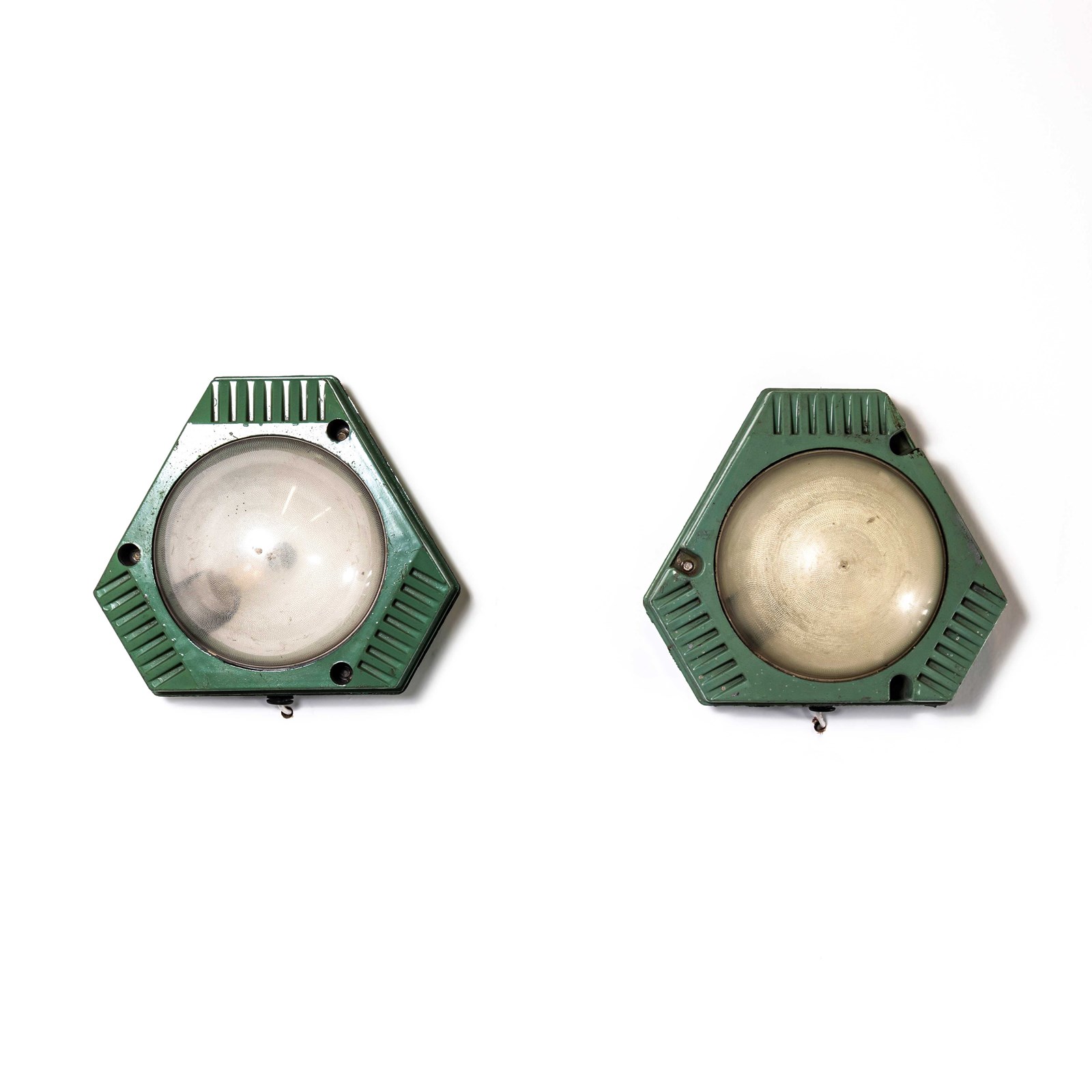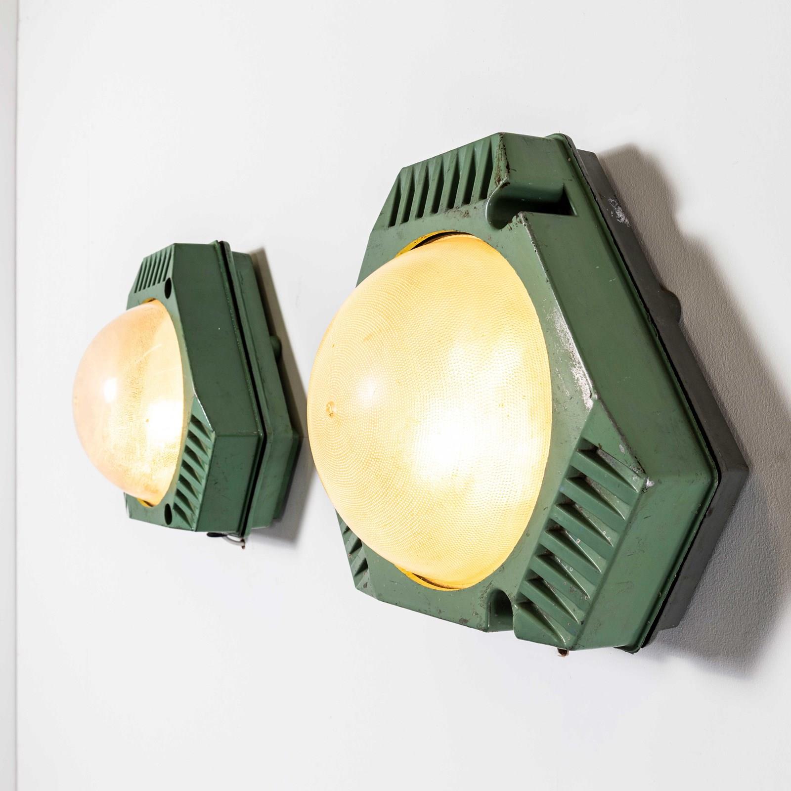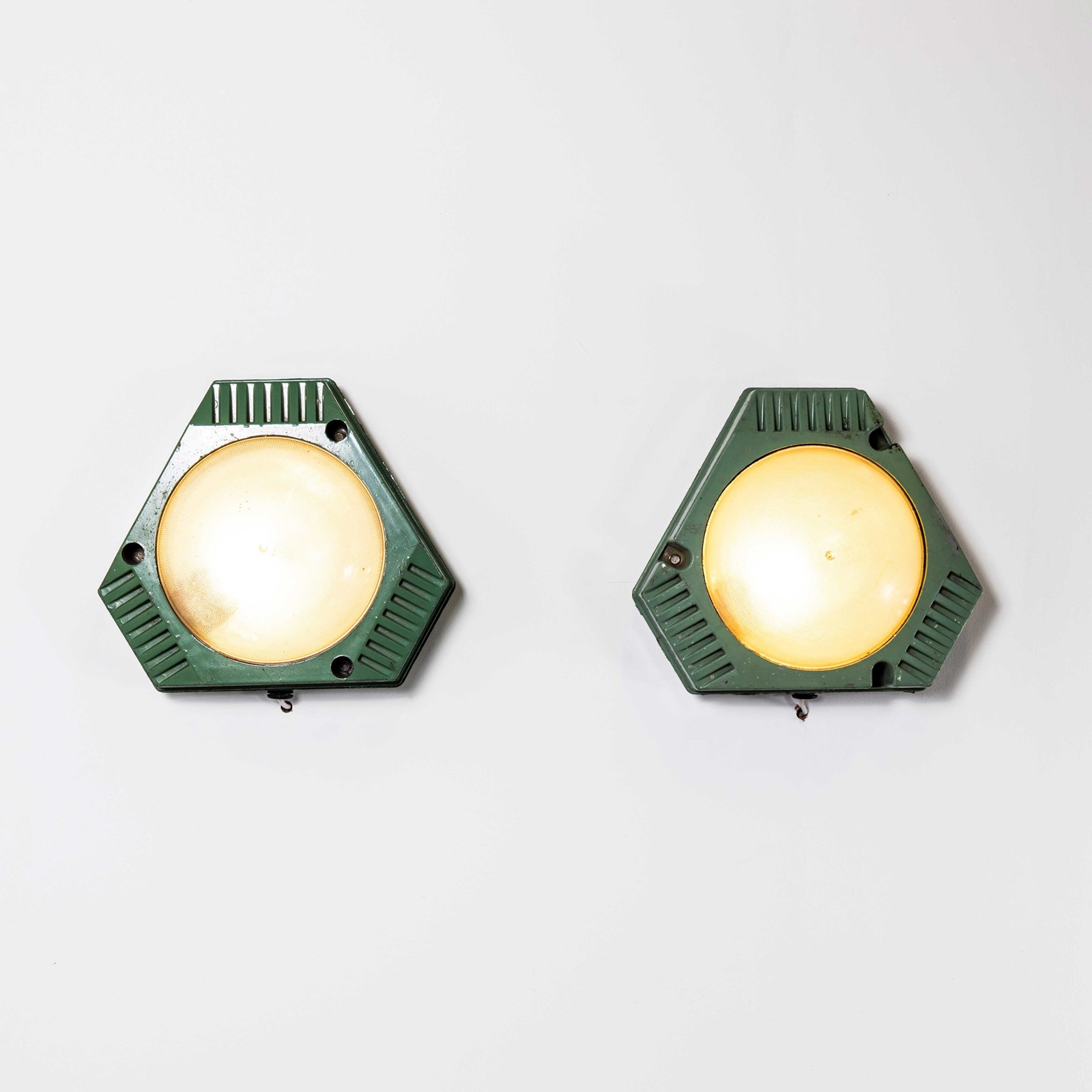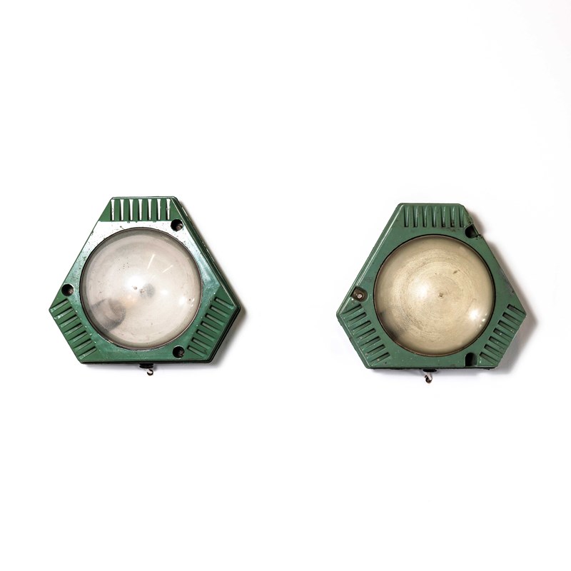 These lamps are made from a lightweight plastic with dome shaped Perspex opaline lenses. Each lamp has been cleaned and restored and all electrical components have been removed and replaced with modern EuropeanCE standard components to BS EN 60598. Each lamp is individually tested and labelled to BS EN 60598. Each lamp comes completely wired and ready to install, the lamp is surface mounted. The lamp is fitted with a standard E27 threaded lamp holder for which a wide range of modern and vintage style filament bulbs are widely available. We do not currently sell bulbs and recommend LED bulbs 6W maximum. We are specialists in refurbishment of vintage lighting, please contact us with any questions regarding purchase or installation. The listing is for the pair of lamps. The lamp is currently wired and fitted for UK and EU compliance. The lamp can be wired for compliance in the US or any global market.
